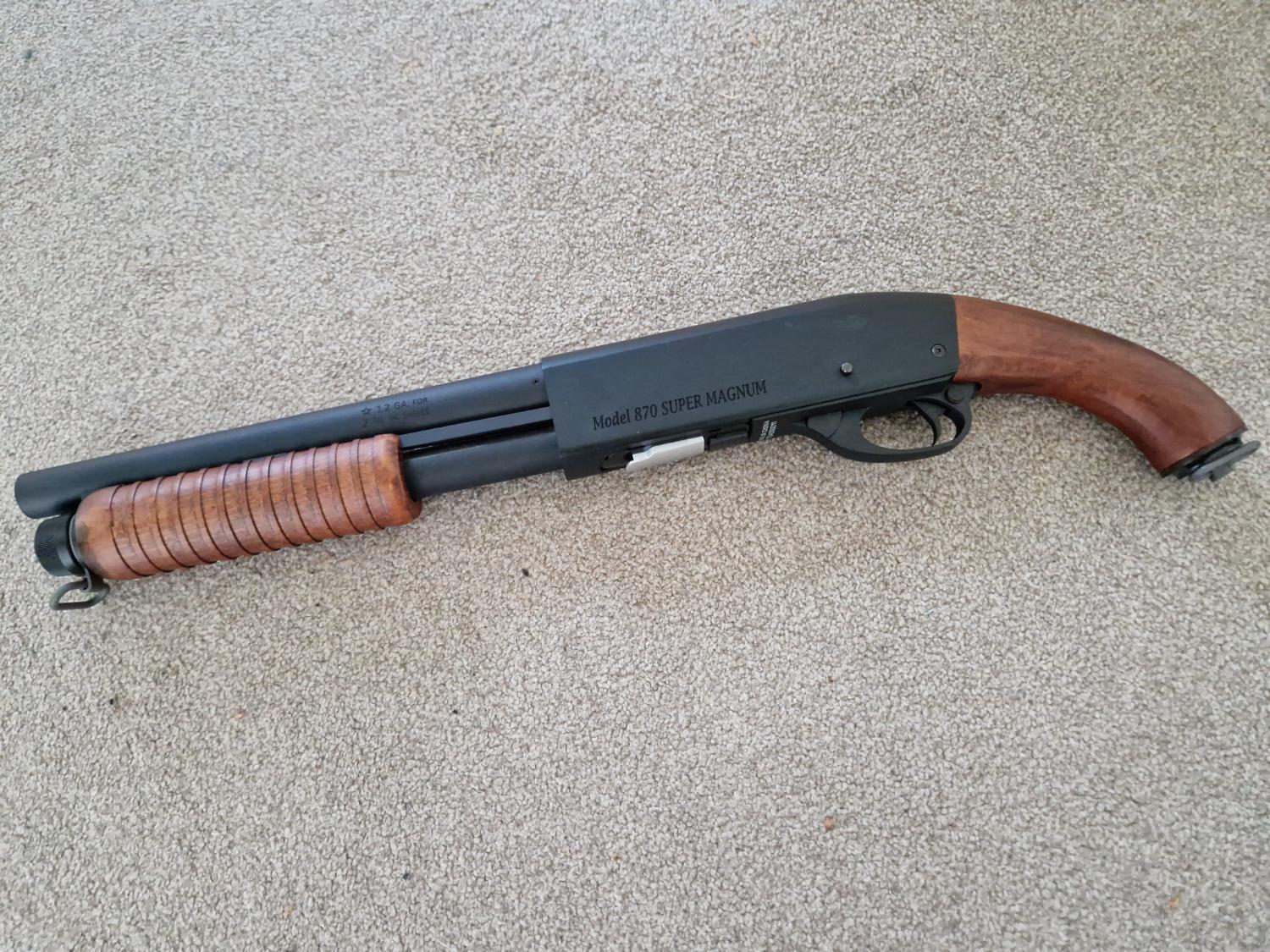 Single shot pump action shotgun made from metal and wood. Never been fielded, only shot in the garden and I've owned it from new. It's got a tdc hop which is currently set for 0.43g bbs and it's chronoing at 234fps on 0.43s which puts it at 1.09 joules. If you use lighter bbs it'll go over the joule limit.