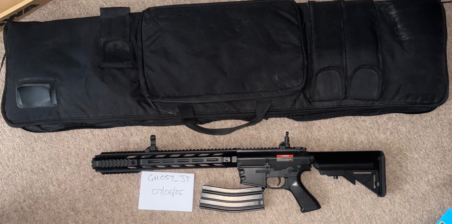 Comes with padded rifle case, and a new nuprol mid cap, wired to mini Tamiya, no batteries included.