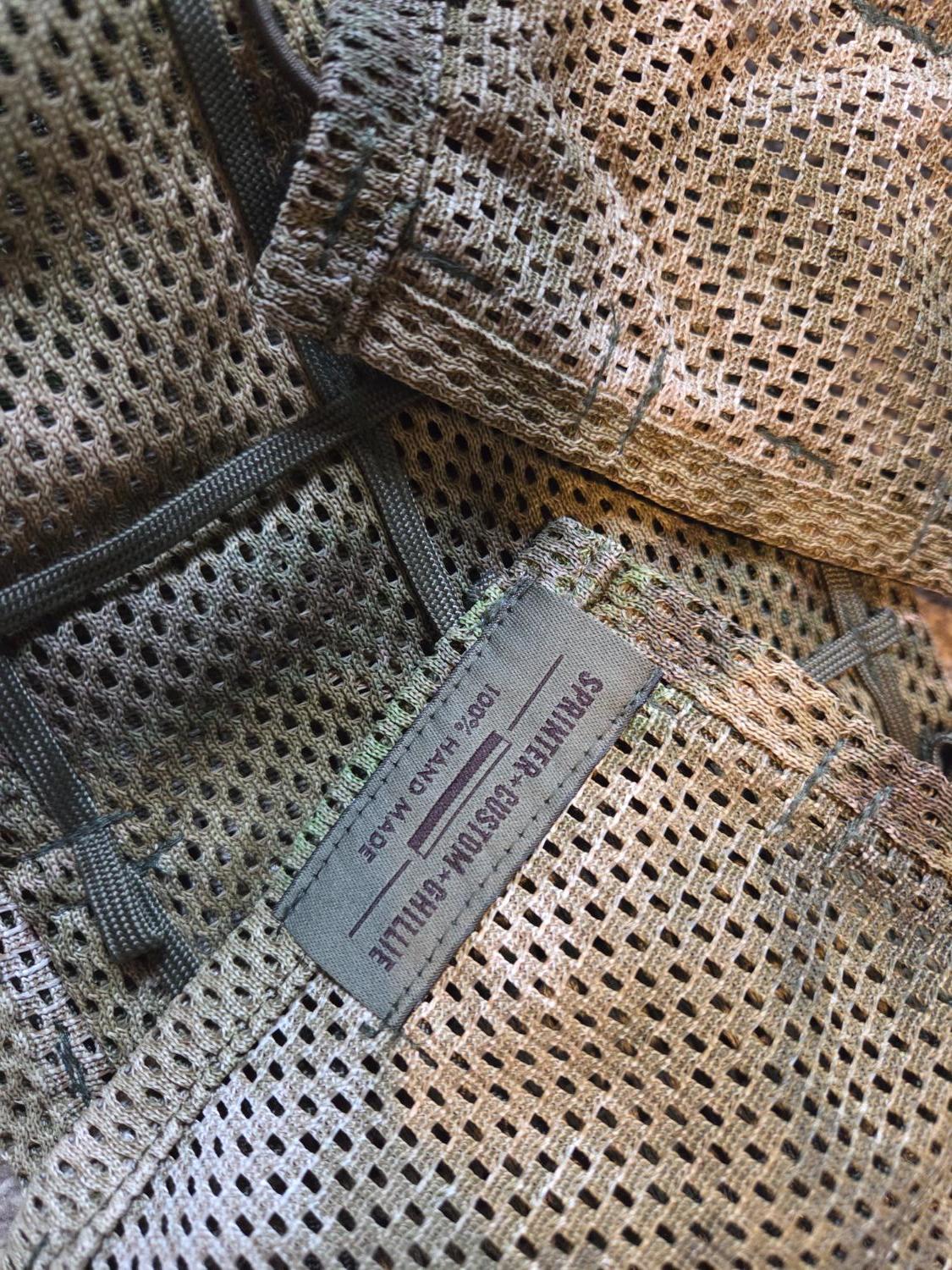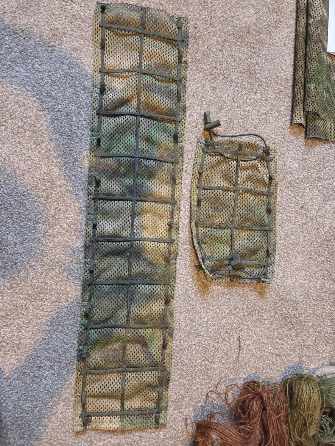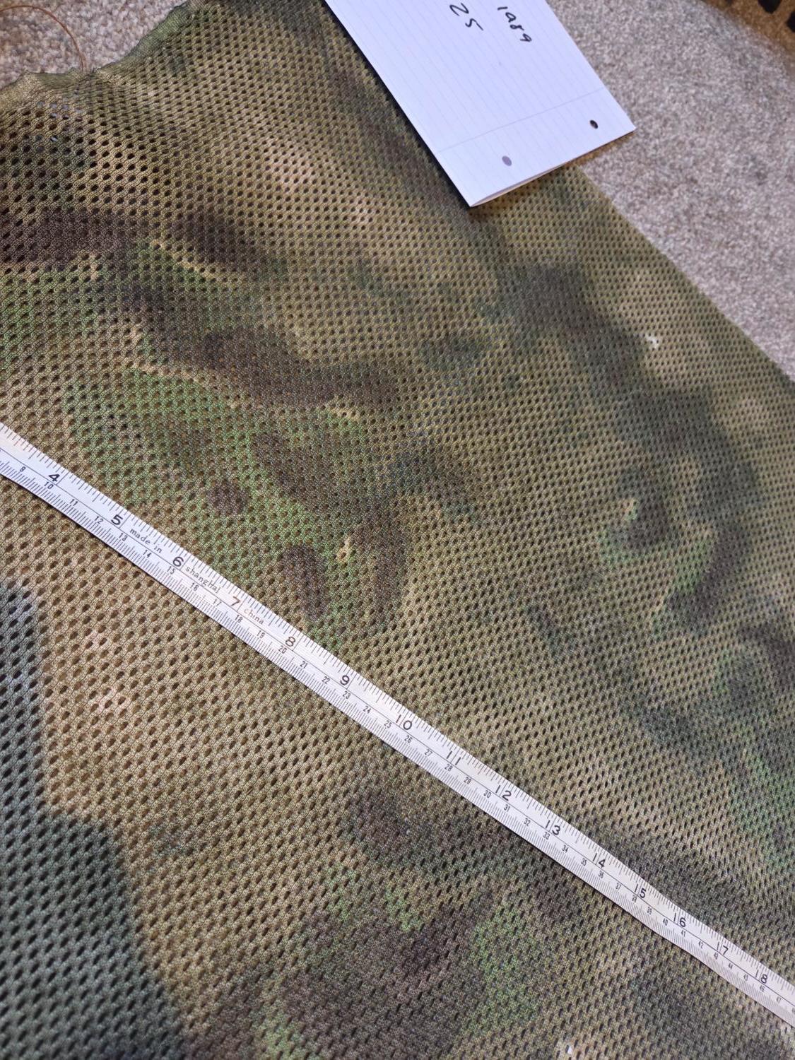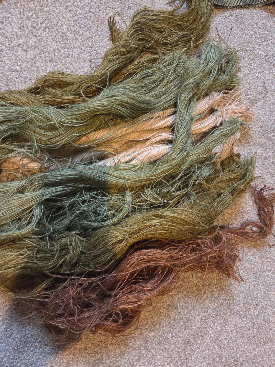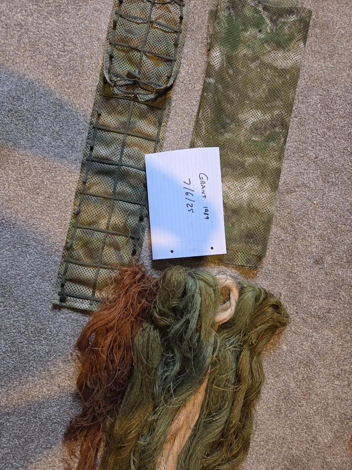 The kit comes with loads of Jute in a variety of really good natural colours (multi season) and there is also a seperate piece of mesh material in what I think is atacs FG (see photos). There is also a big bunch of green raffia which will add but didn't take a photo of it.