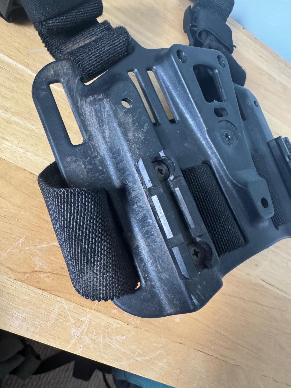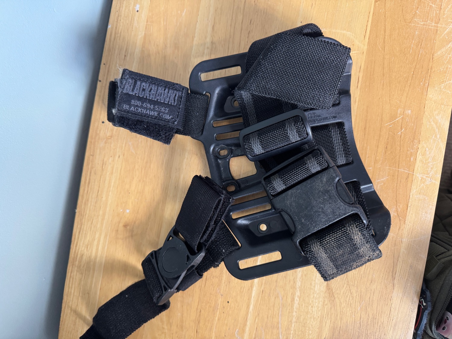 Unsure make, I bought a while ago but has BLACKHAWK! trades on the side. Comes with Velcro loops to attach to any belt or MOLLE and adjustable leg strap.