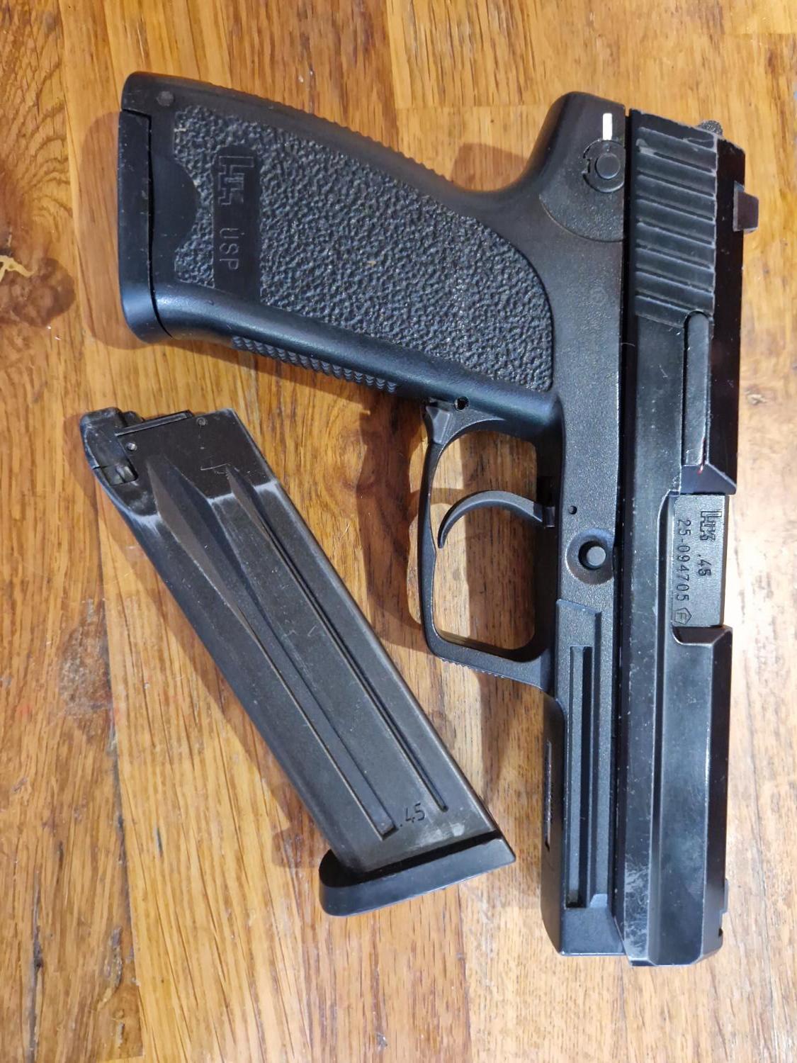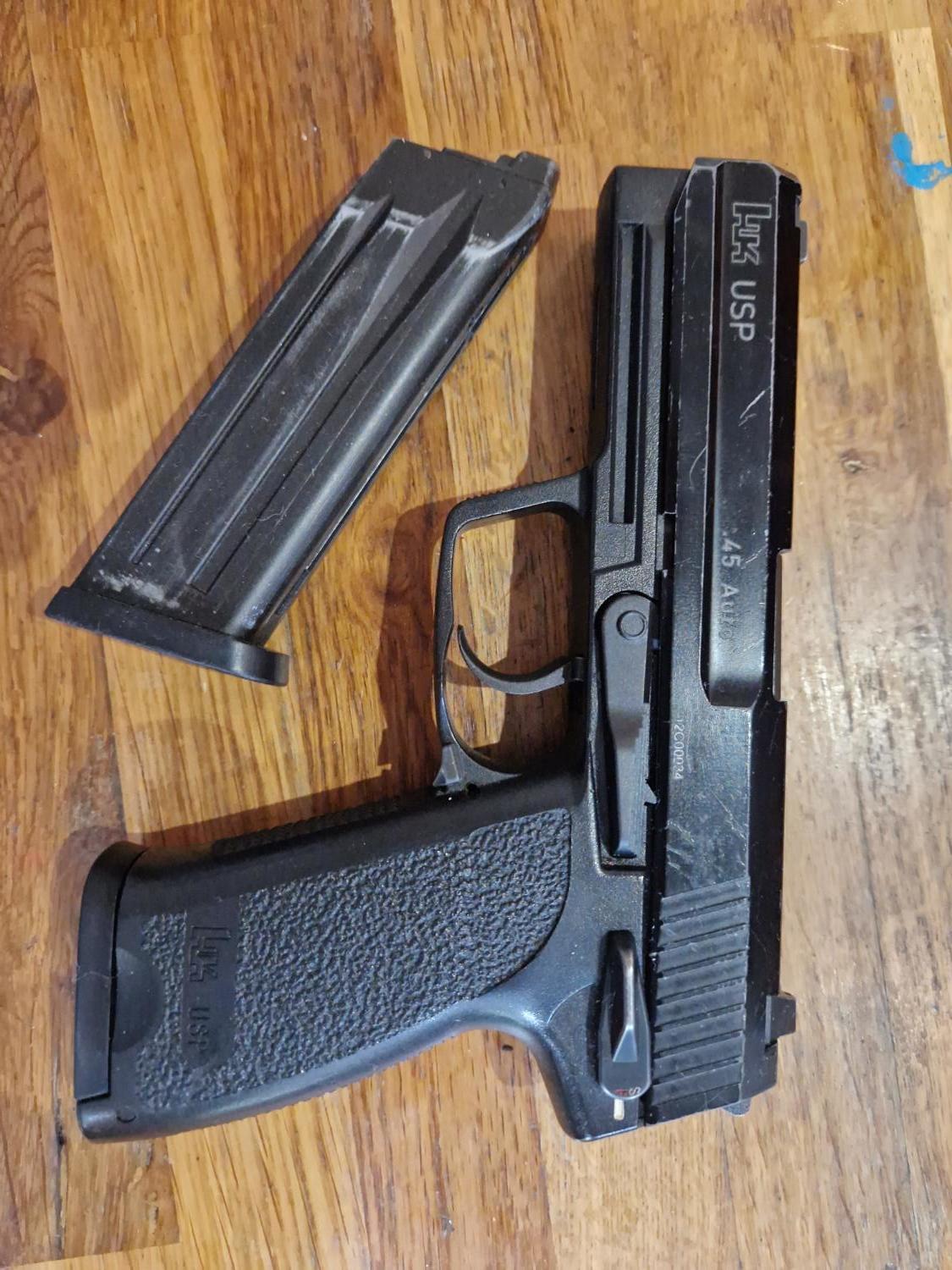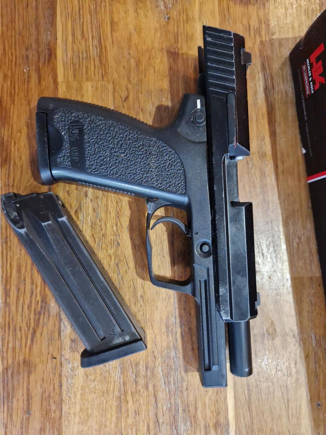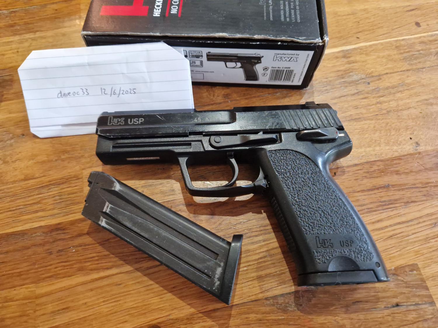 This is a kwa usp 45. It has some scratches to the slide but nothing too major. Works and shoots fine. Comes with box and 2 mags. I don't have the hop up adjustment tool but you can use a flathead screwdriver for this. The hop up is set for 0.25 currently and fps is 290fps on 0.2g bbs with green gas.