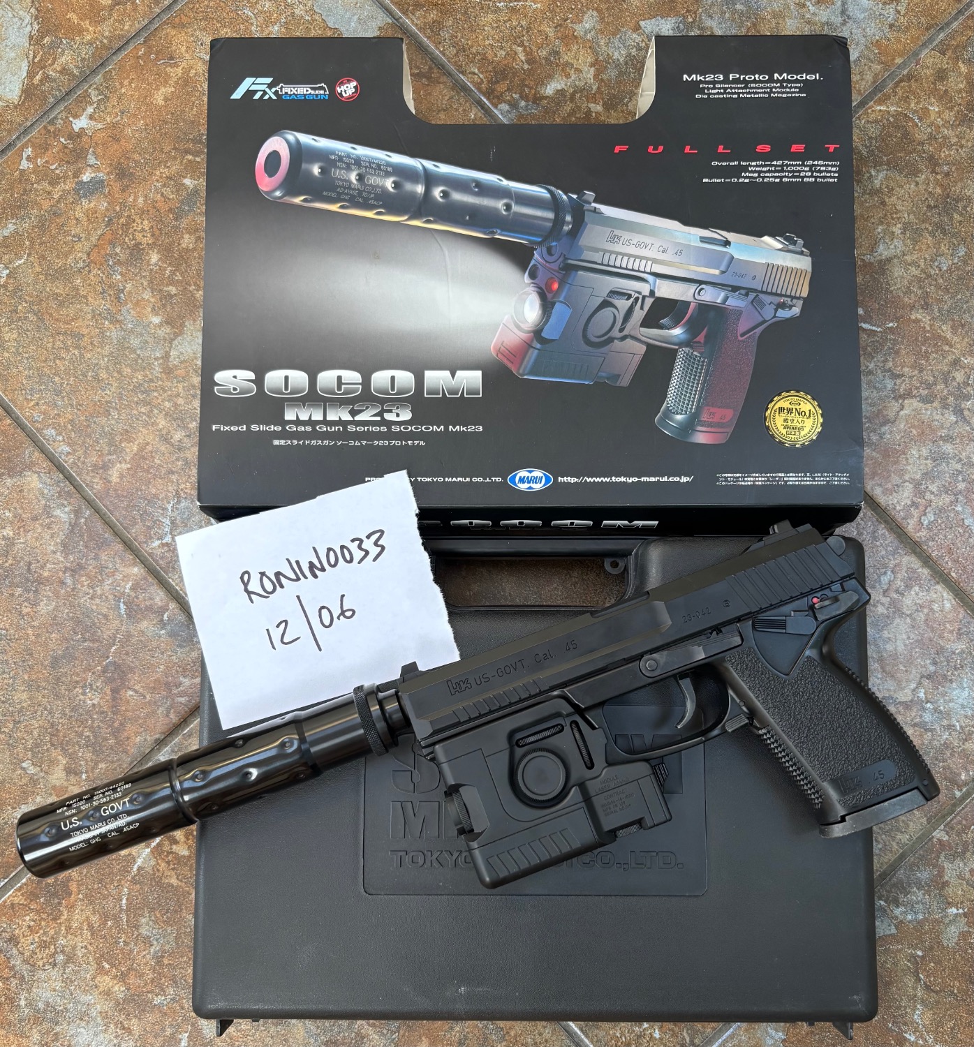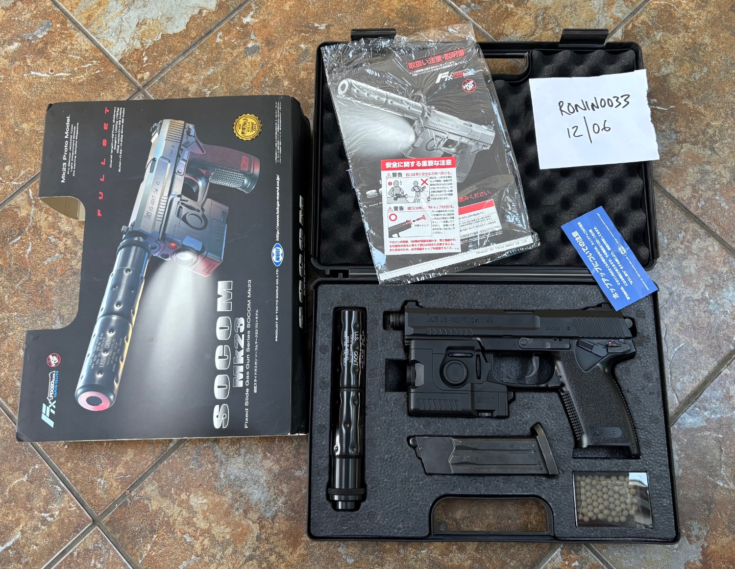 For sale, Tokyo Marui Mk23 SOCOM pistol and accessories.