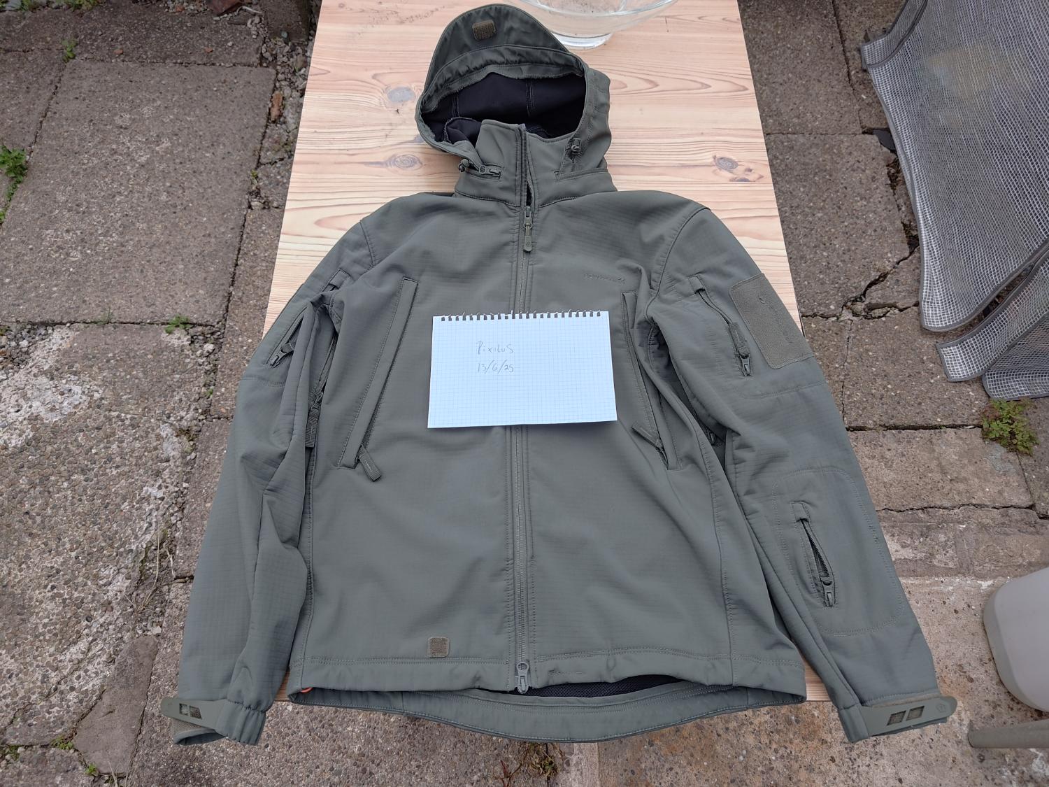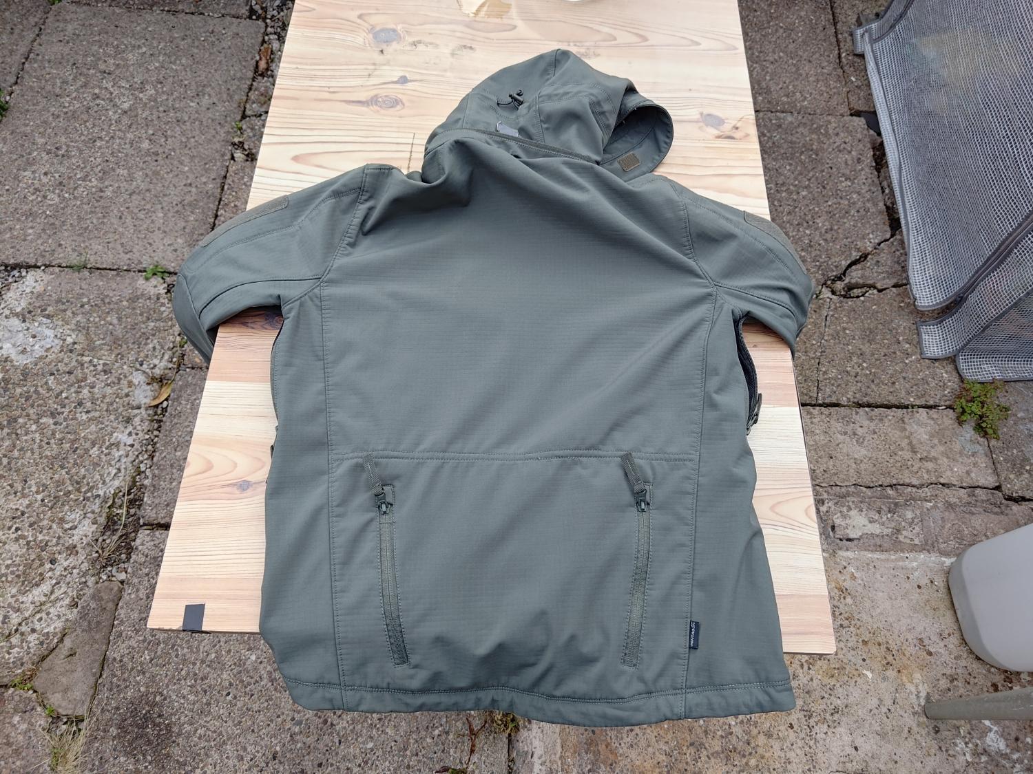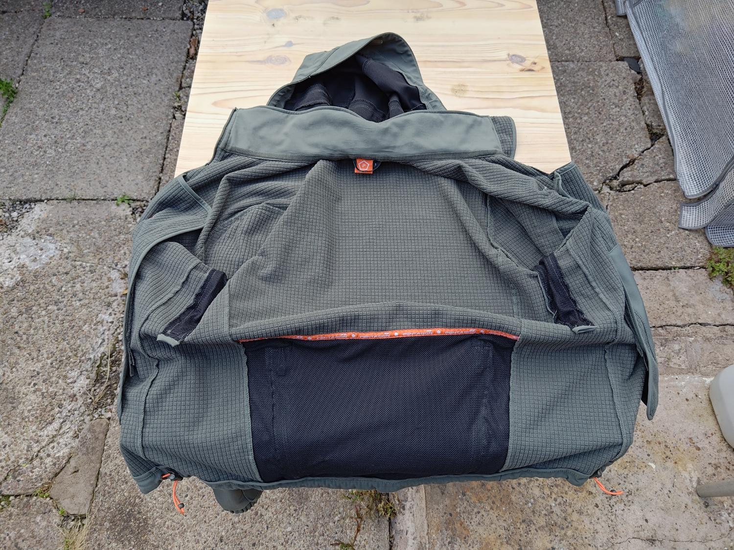Lots of pockets on the jacket, with armpit zips as well, and a stowable hood. Velcro patch on the left and right shoulder.