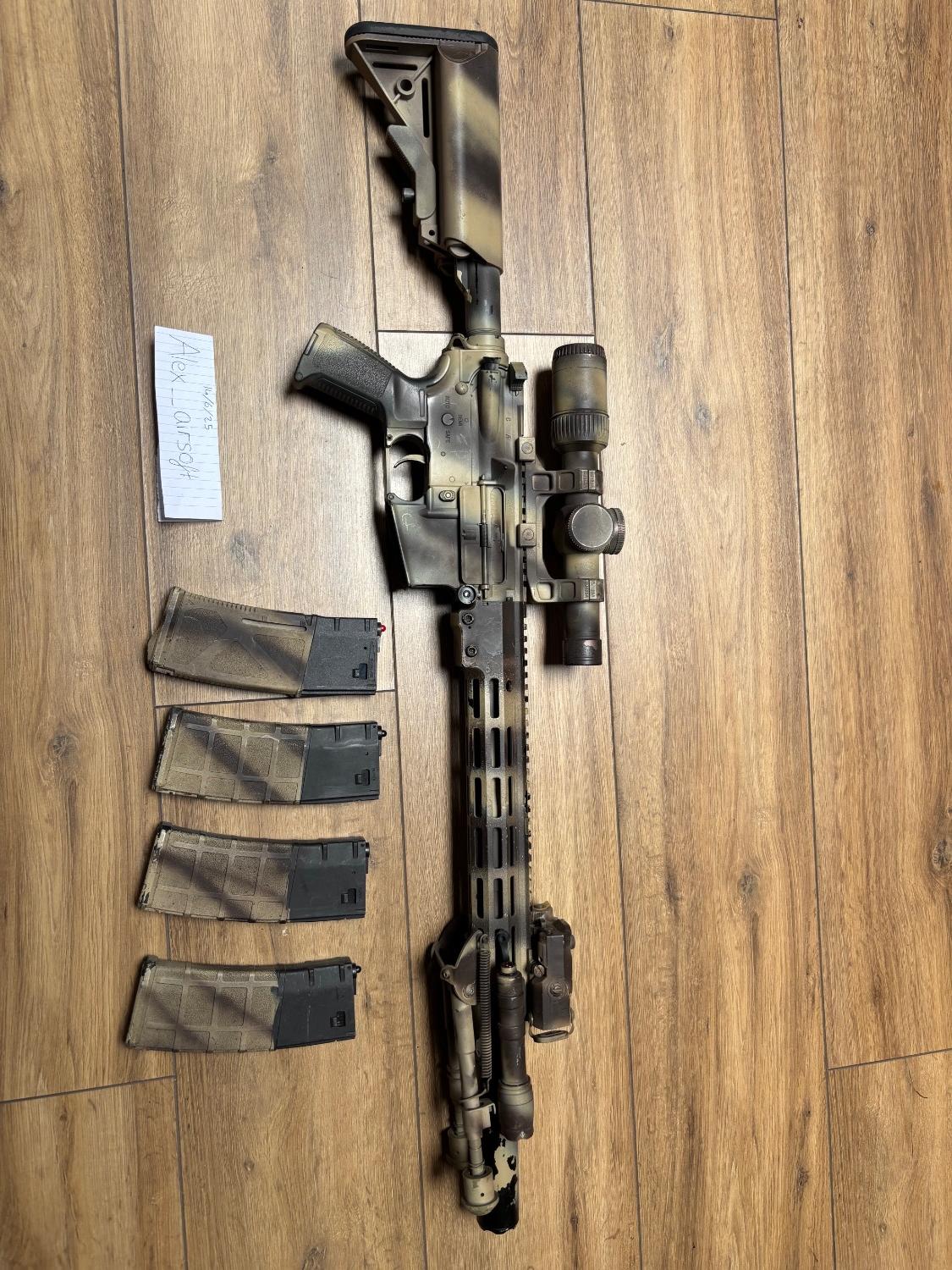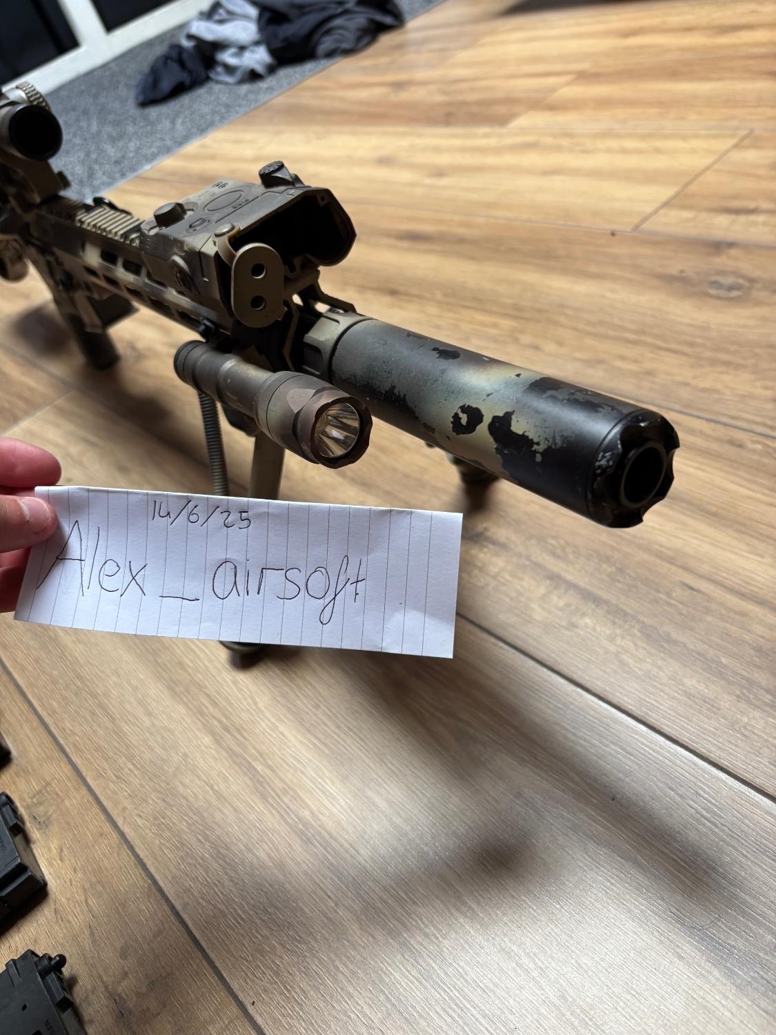 arcturus URGI build, all stock internals and shoots around 320 fps. all attachments are included in the pictures and has been painted to give it a battle worn look! only problem is that the wadsn torch does not come with a pressure switch nor does it come with batteries, the dummy peq does also has the front missing from it but theyre only about £10 for the whole thing, last thing is that it is in need of a new hop rubber which are also only cheap. now onto the possitives! attachments include a high quality replica vortex razor lpvo paired with a replica geisselle lpvo mount. it also comes with a replica suppressor and a feyachi bipod. also includes 2 batteries, and 4 magazines. the base gun cost £350 and over £200 were spent on attachments! asking £350 ono for collection or can be posted at the buyers expense, message me at this number with any further questions: 07512743412 . thank you for looking!