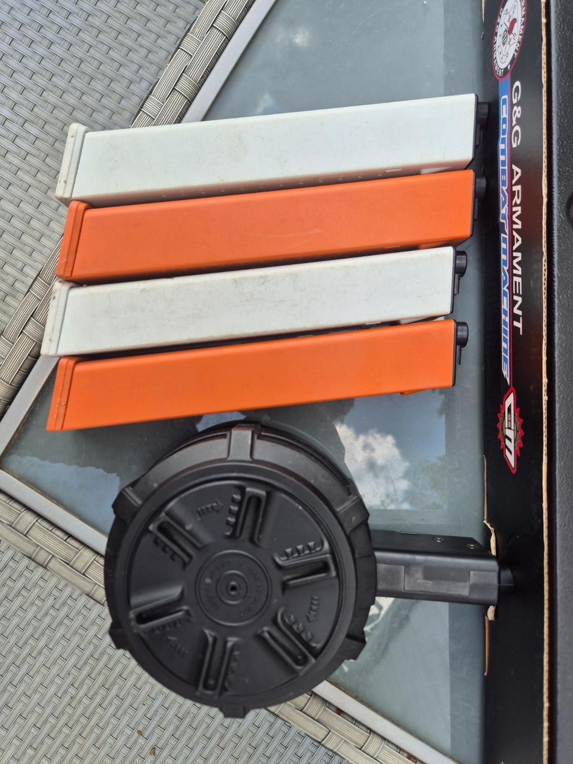 Drum mag, 4 mid caps, 1 hicap, red dot, grip, battery extender, 2 batteires, lipo charger