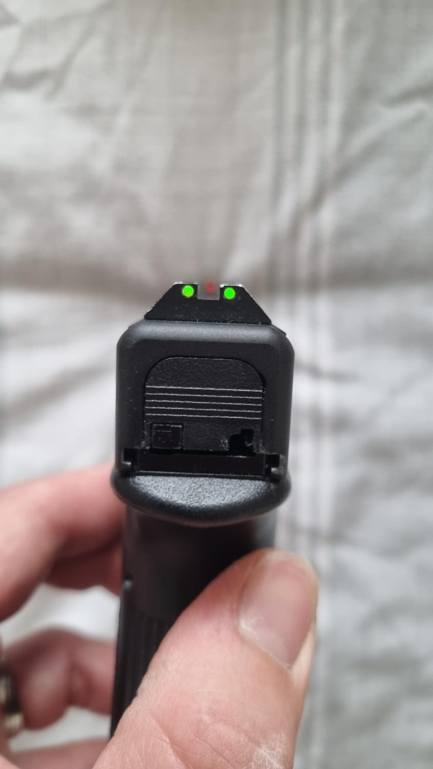 Unknown brand of fibre optic sights and come with the original plastic slide and sights.