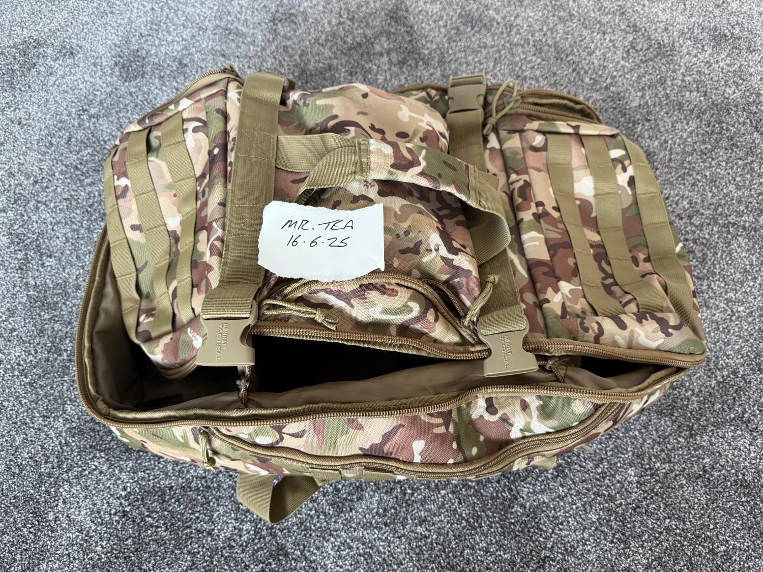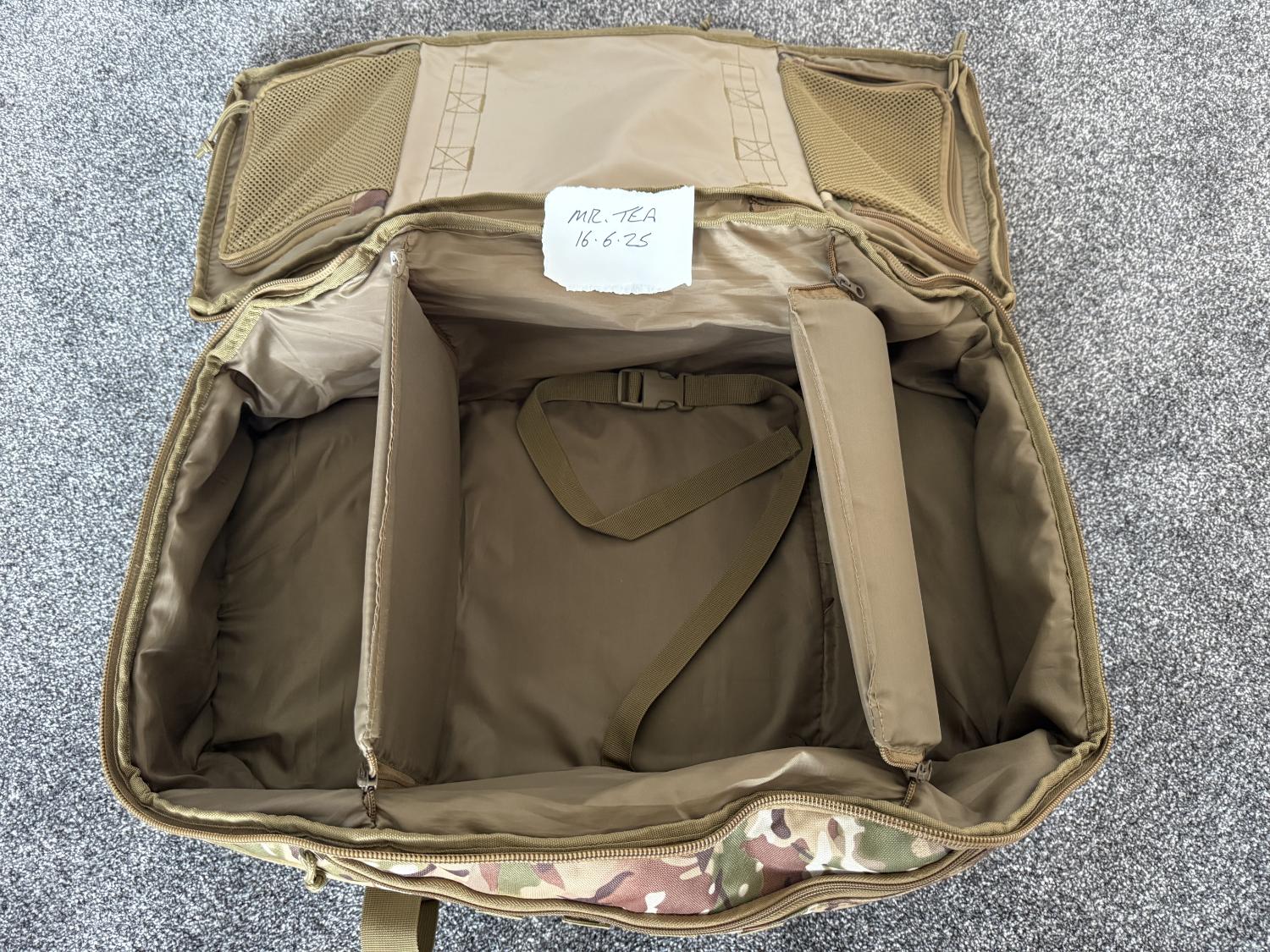 60 Litre main compartment with two removeable and padded dividers. Two big zippered compartments on the outside and one on the top of the bag. Two mesh pockets on the inside of the lid. Great for moving from the car to the safezone as it has included backpack straps leaving your hands free for other stuff. Also has carry handles on each end and one on the top of the bag. - £25