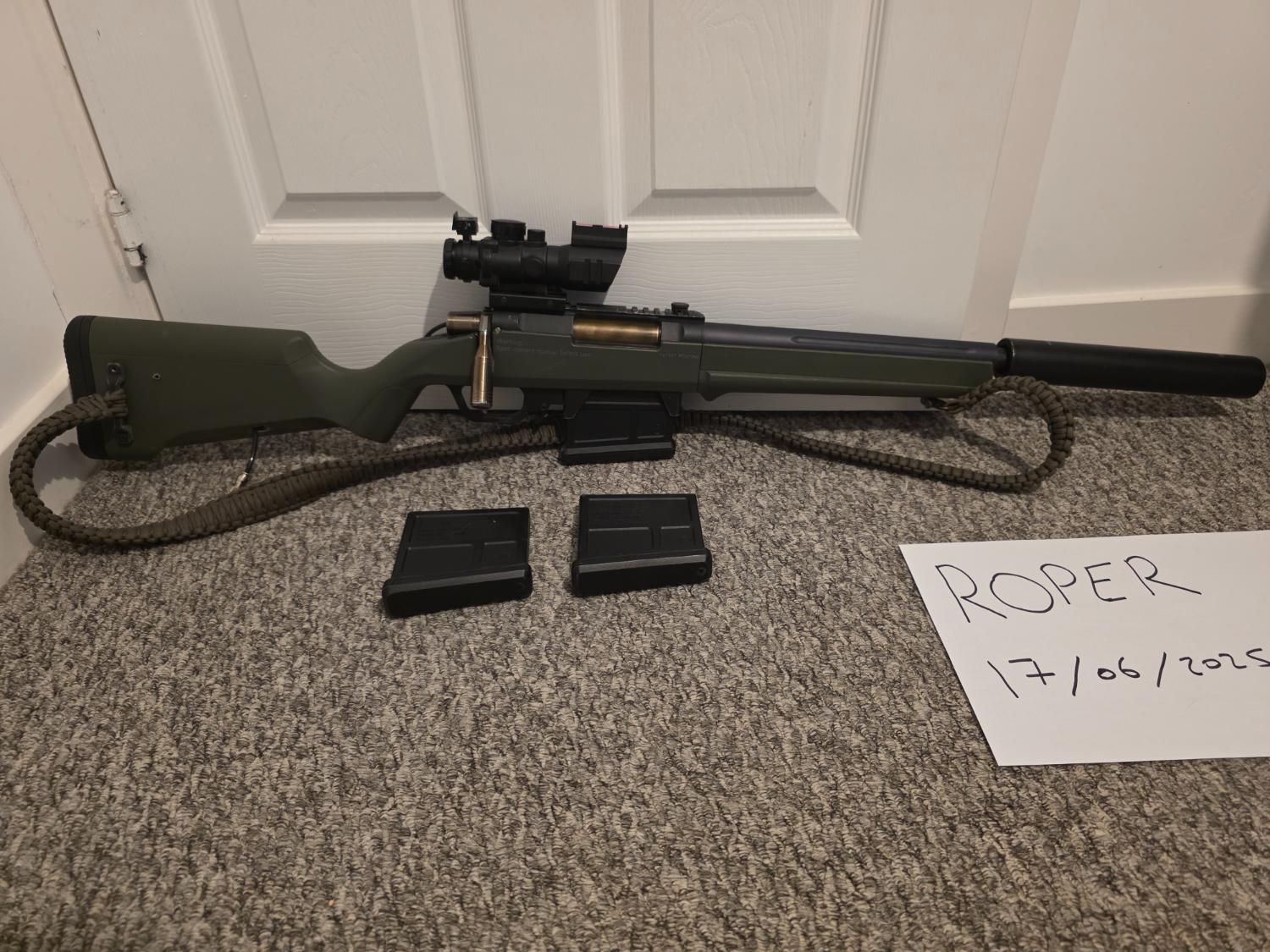 comes with 3 mags, multicam mag pouch, suppressor and cover, paracord sling, acog style 4 x 32 sight. (I can include a tank and line at an extra cost)