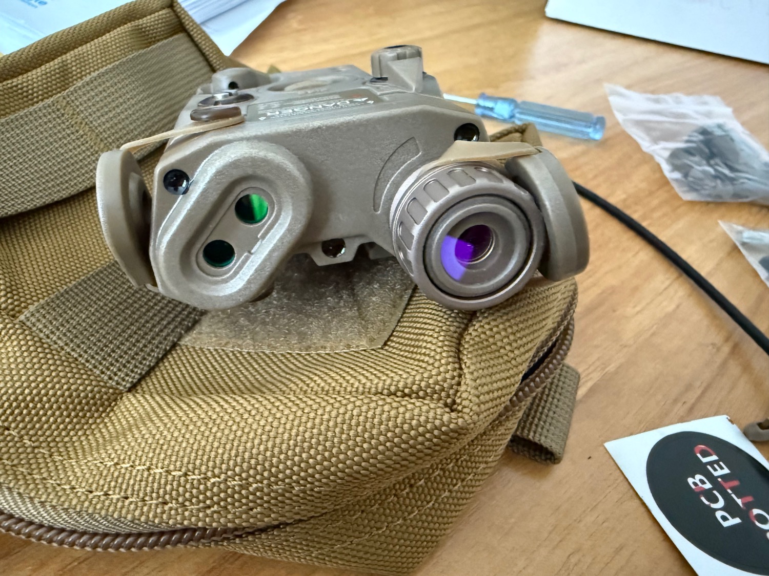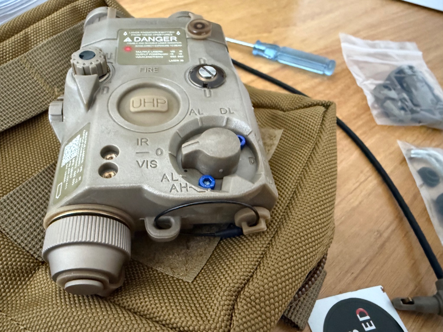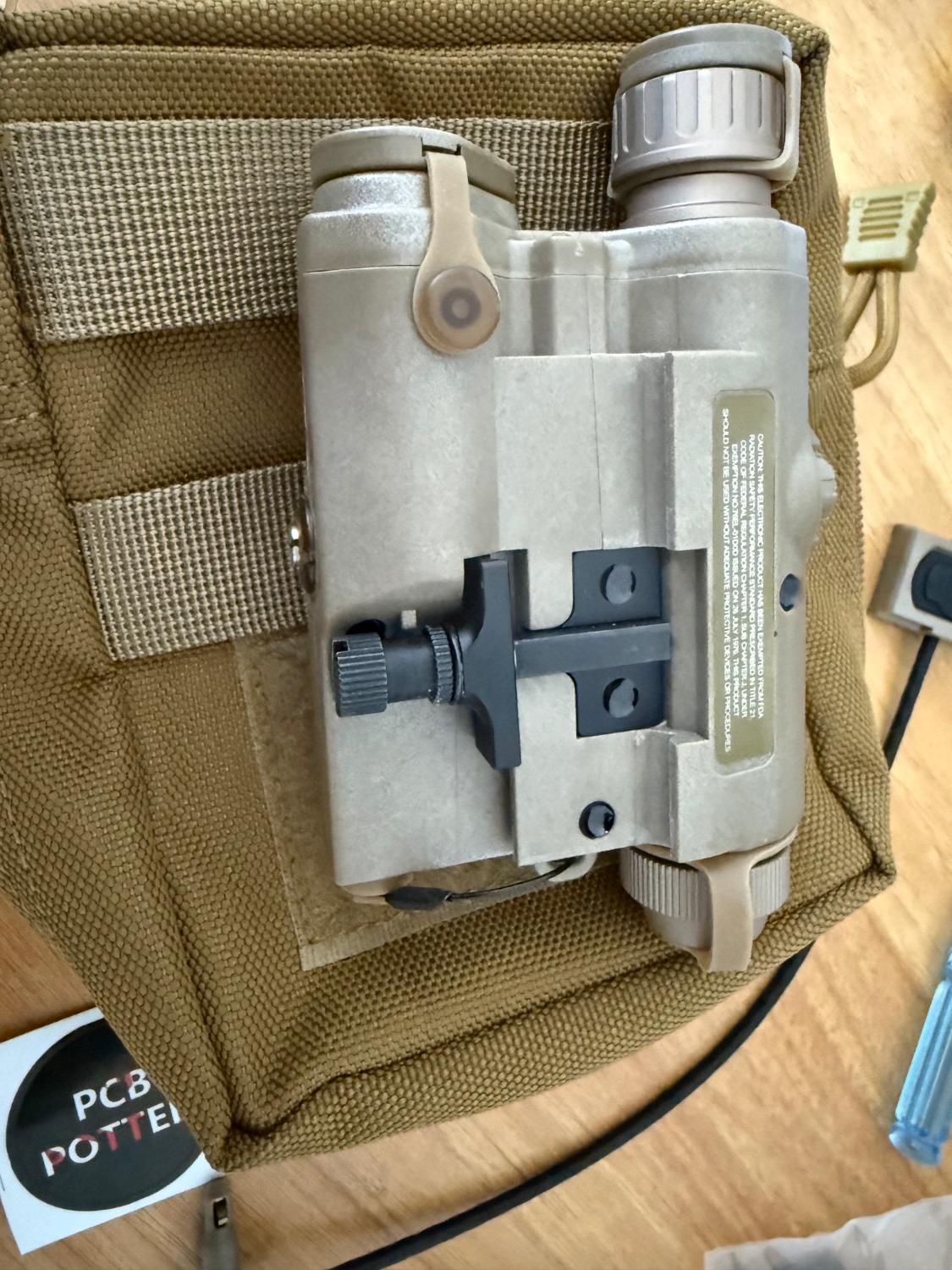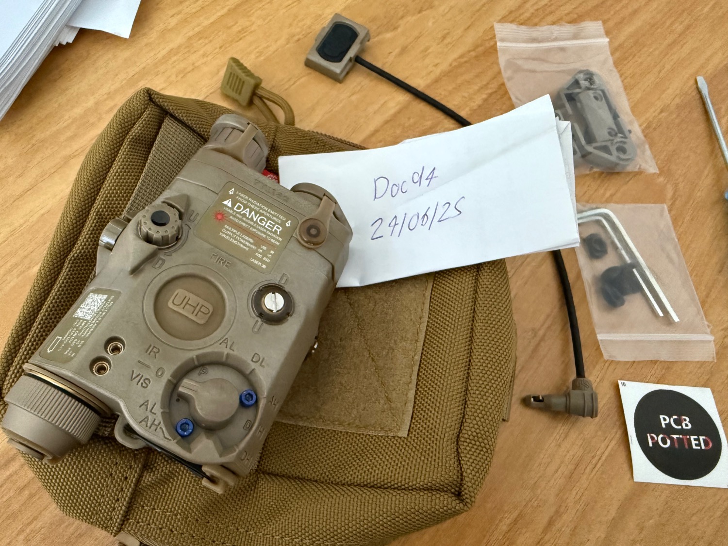The LA-5E with red laser and potted PCB from Somogear. This is the variant with the larger reinforced battery cap. Fully functioning, never used and comes with all of the accessories: somogear remote switch with mounting hardware for both M-lok and picatinny rail, screwdriver, hex keys and tan carrying pouch.