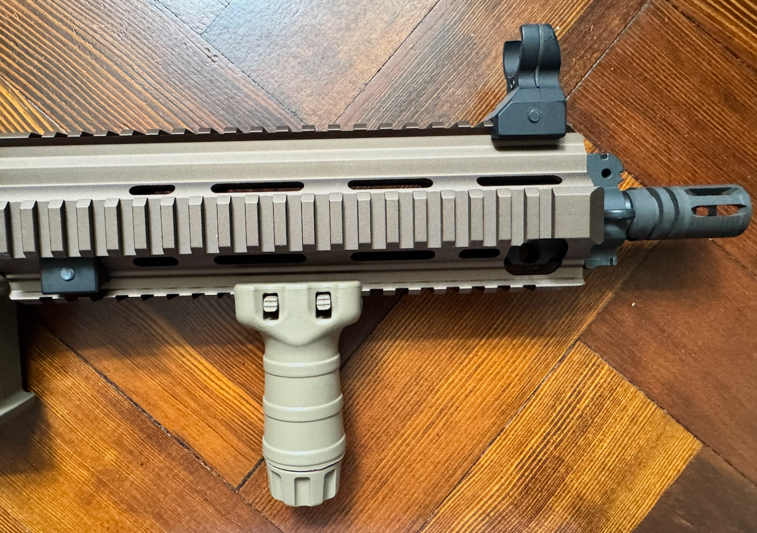 The outer barrel assembly, handguard, receiver, buffer tube, and other trim parts are made from a mix of alloy, aluminium, and steel, while the pistol grip, foregrip, and stock are constructed from high-density polymer.