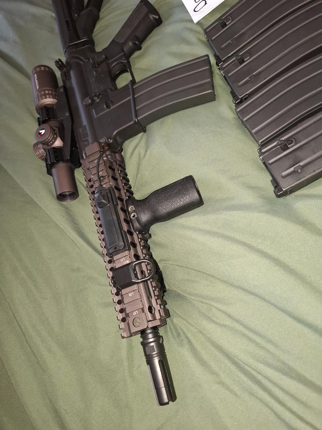 Regrettable sale due to redundancy. This gun is amazing, it's fired less than 500 bb's. Comes with an RA-Tech npas. Original box, 5 TM MWS mags which all work perfectly, Victoptics 1-6 LPVO. No splits or swaps. Collection preferred due to weight (Dorset area) but can post at buyers expense. I will only use PF24.
