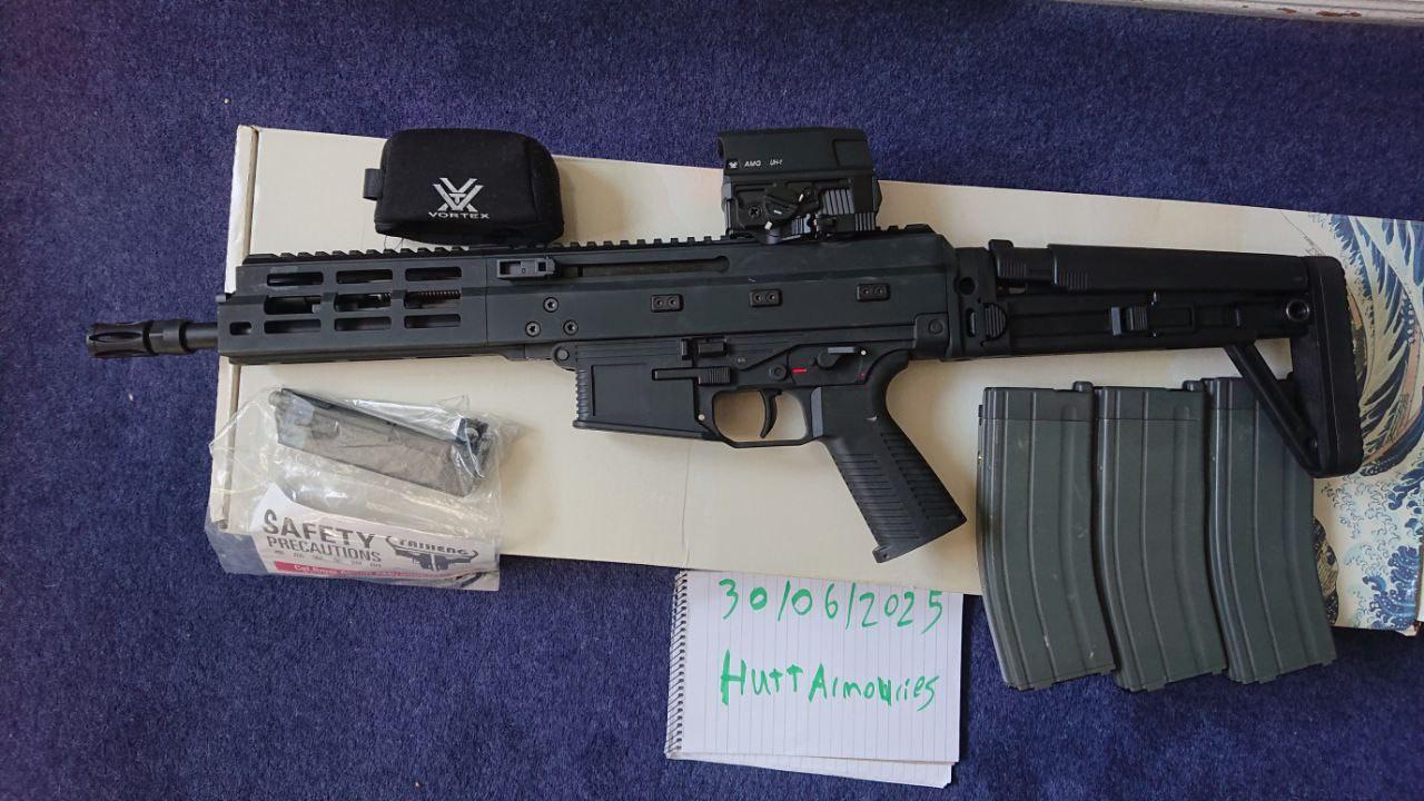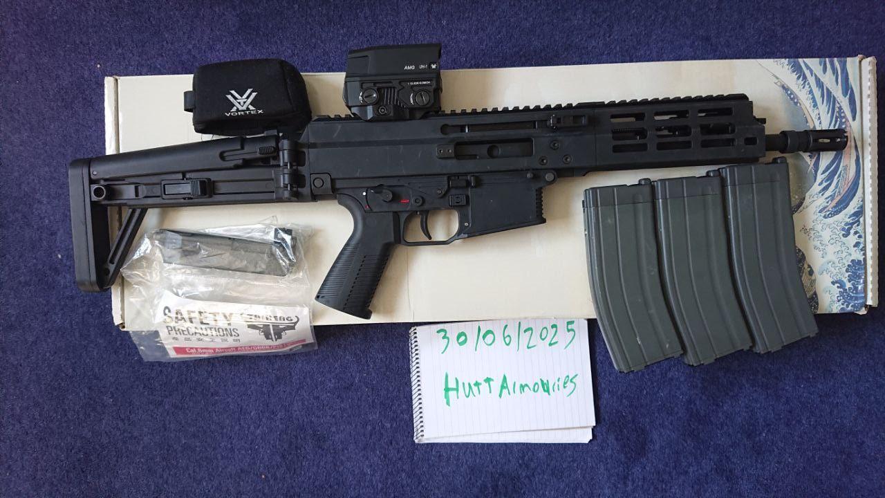 Has mostly been gathering dust but has been cleaned, greased and test fired. Works well but needs an adjustable valve as its a little high on power. Comes with 3 fully functional v3 vfc gas magazines with some wear and a knockoff vortex holosight, fully working as it should. Price includes paypal fees and postage.