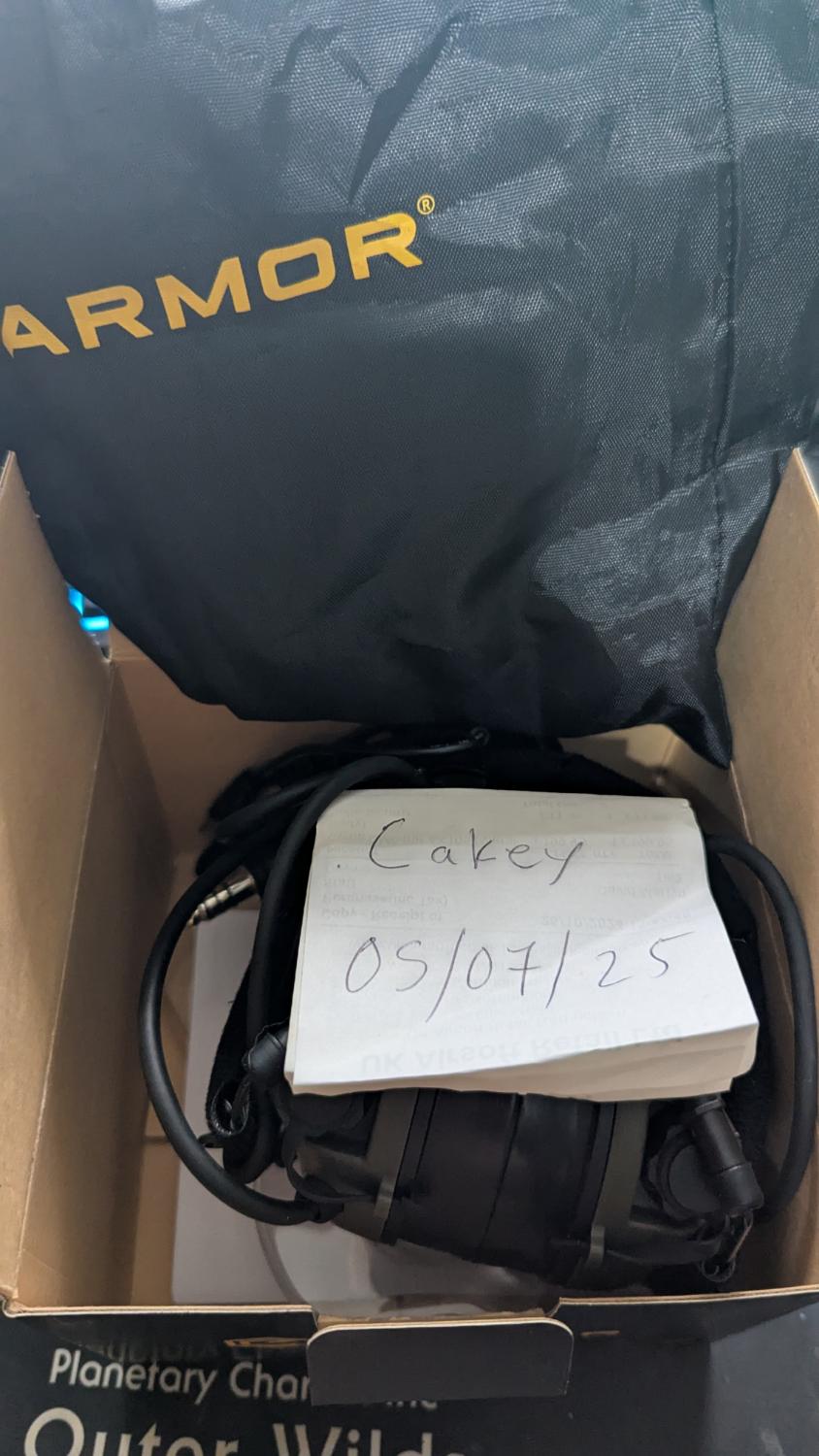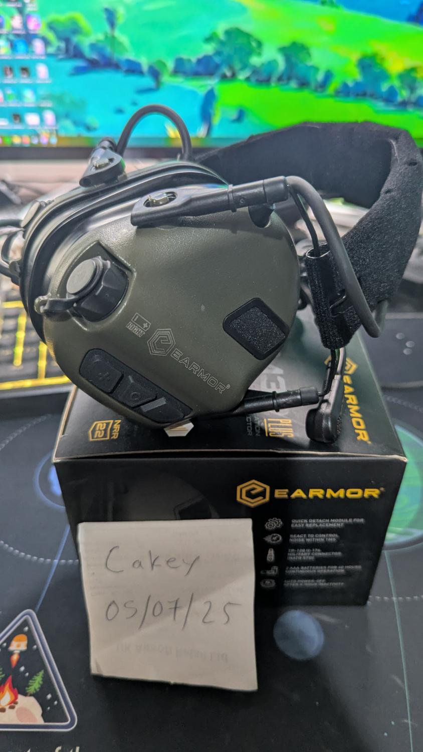 Great condition Earmor replica M32 headset with microphone. Works great for sound amplification and keeping your ears safe from explosions and BBs alike. Comes with a Kenwood PTT adapter that doesn't normally come with the headset out of the box. Colour is Ranger Green.