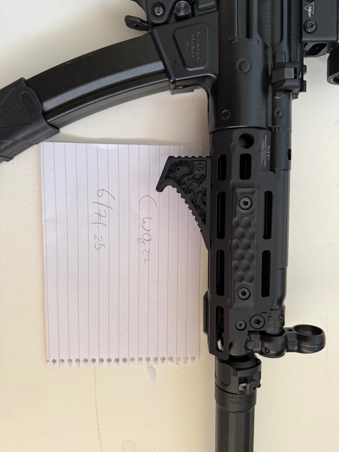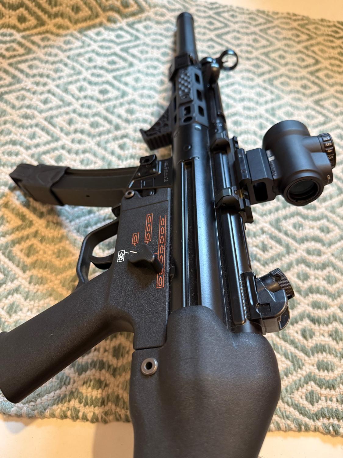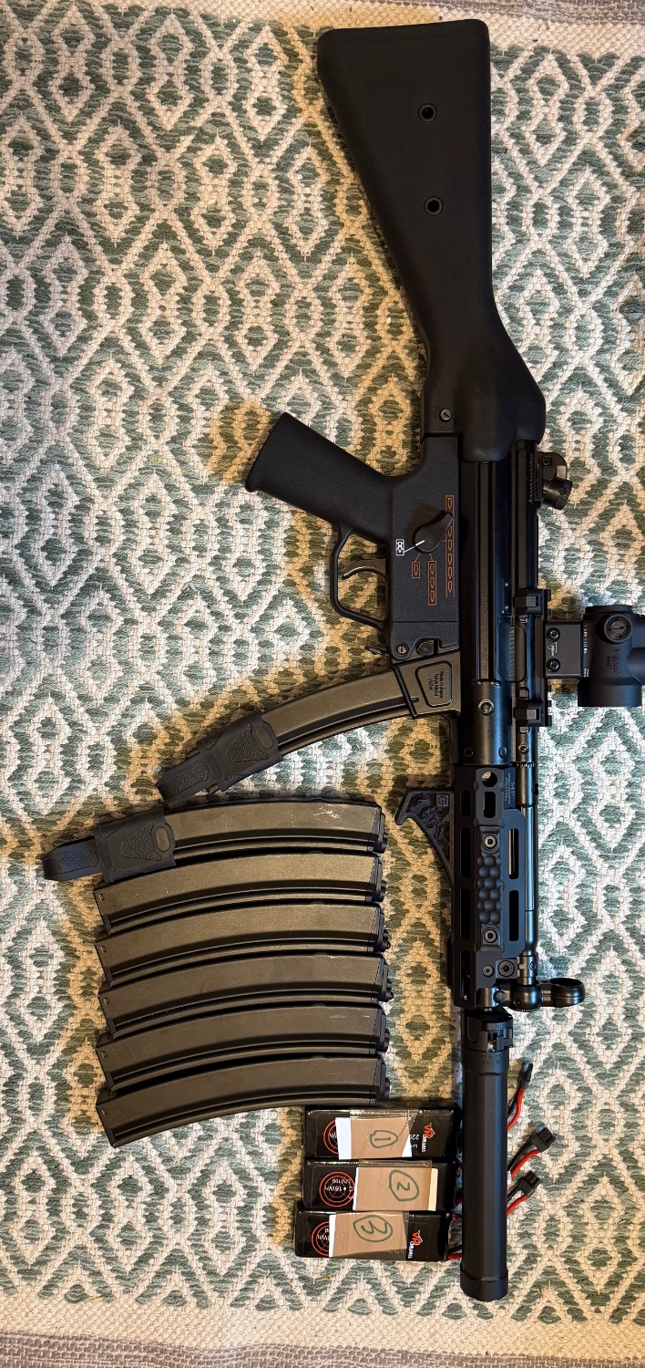 Pictured with genuine Midwest industries handguard comes with 7 mags 3 batteries and the suppressor (has the surefire mp5 markings) asking £800 with the handguard or £700 with the standard one also pictured with a genuine trijicon MRO will do it all for £1000