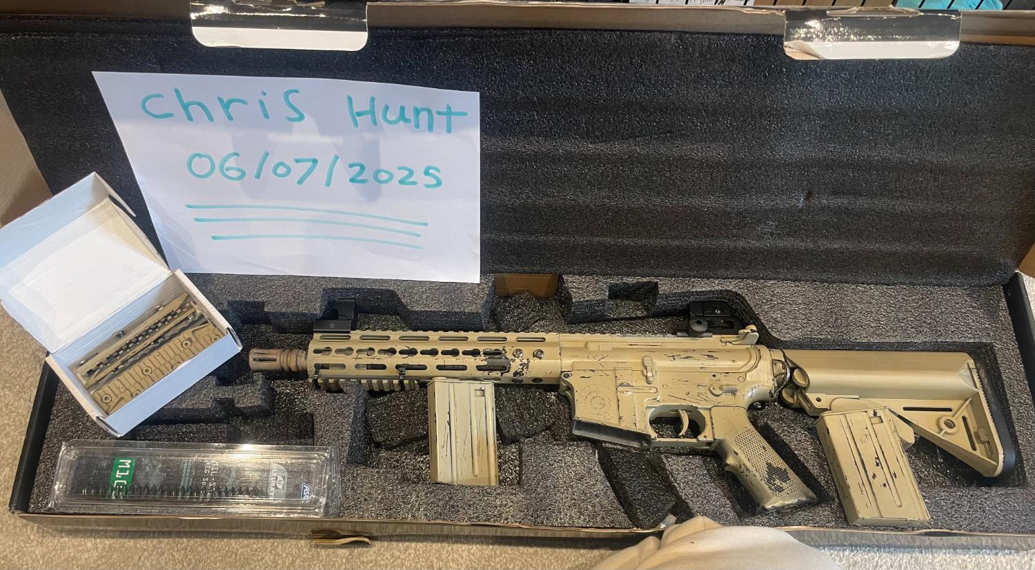 Nuprol Delta Recon Long Airsoft RIF in tan ( Sprayed myself ) , in good condition used in a lot of good fire fights, selling due to upgrading the collection, comes with the Short key mod handguard, x2 mid cap magazines, Keymod rails, and original spring ( have changed myself )