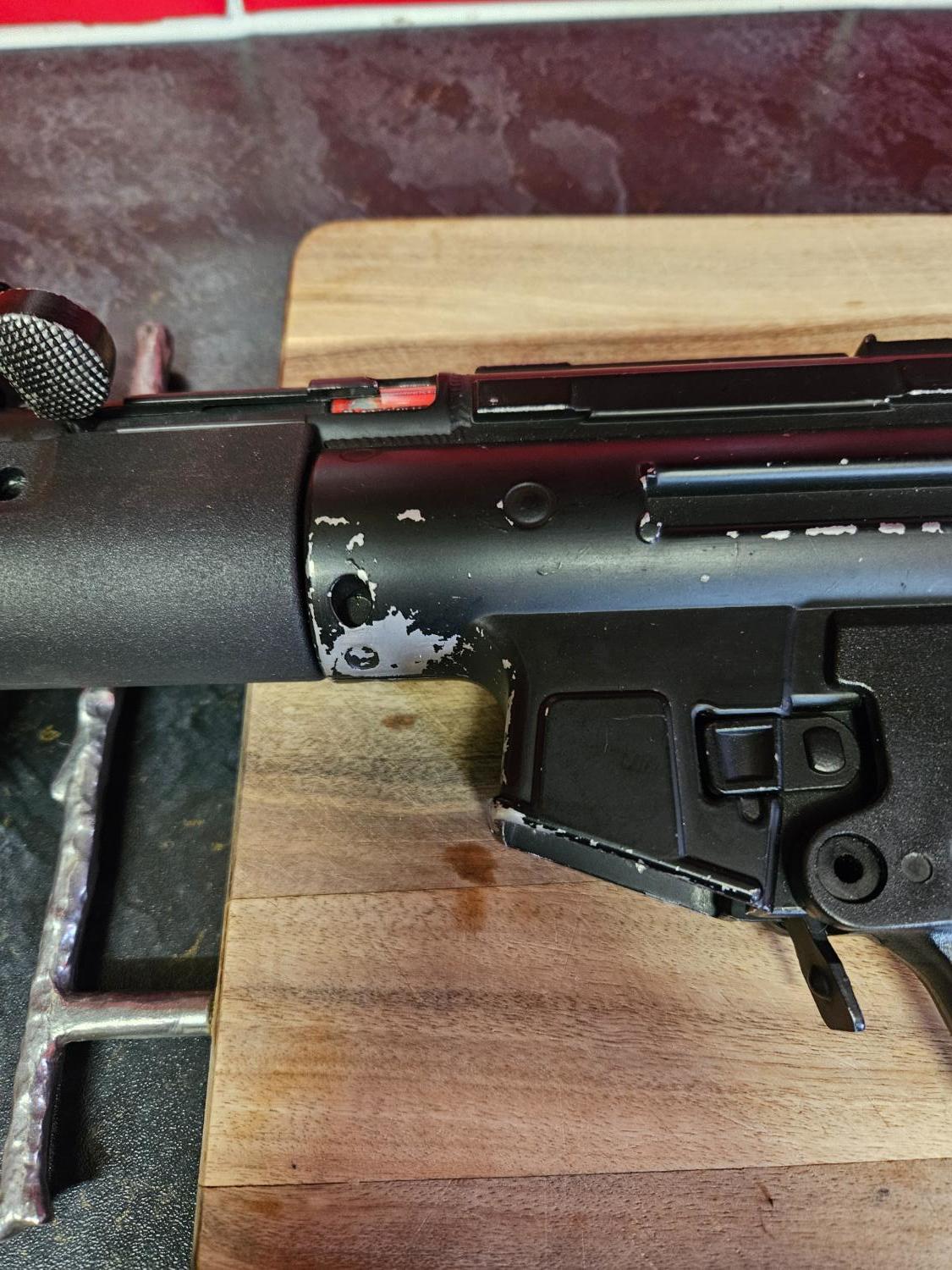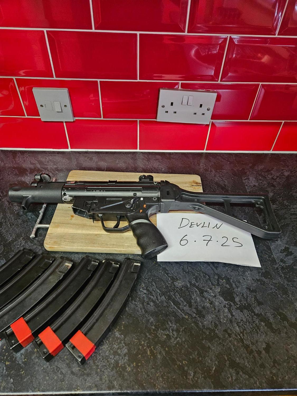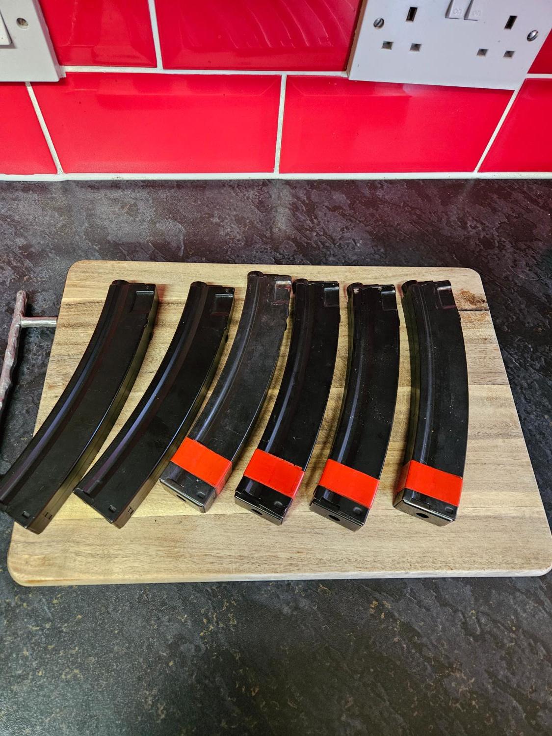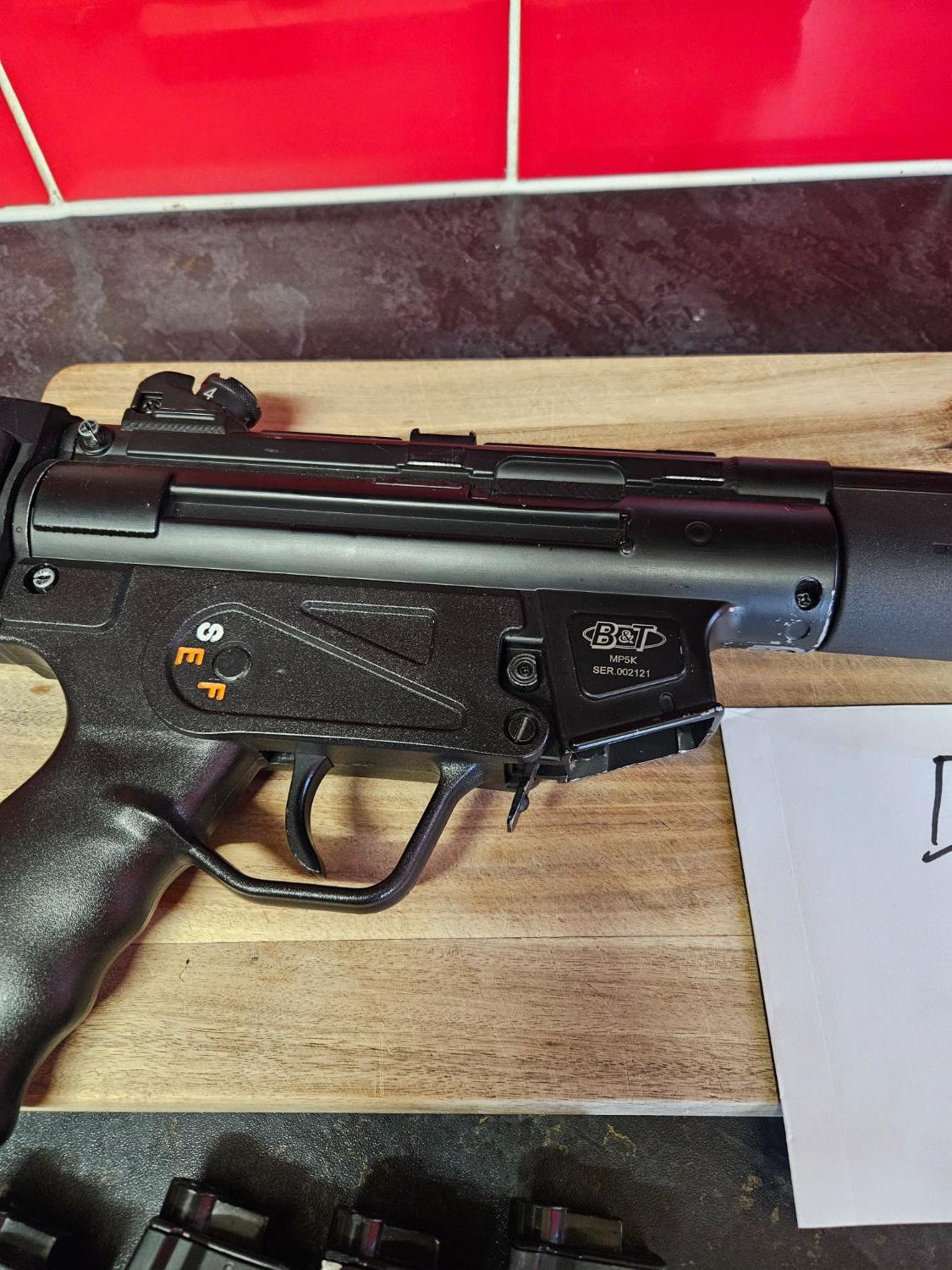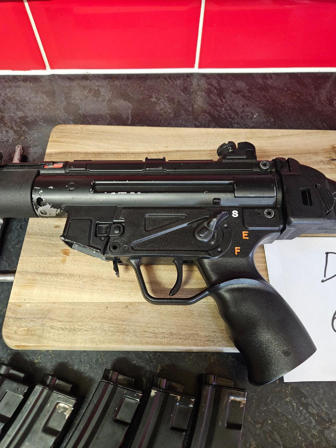 CA B&T MP5k with 8.4v battery, SP89 handguard and 6 midcsps. This gun has external age related paint wear, looks better i think. Internally it was worked on by Kingdom of Airsoft, i don't know the details but it hops 32s and has a healthy rof, perfectly at home in woodland and CQB.