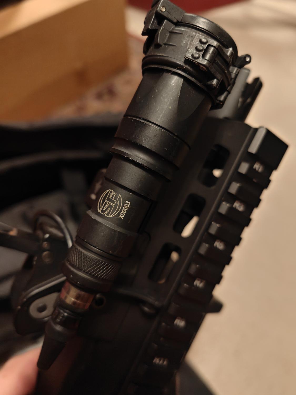 WE G36C no top rail, attached is a LED torch with lens protector and pressure pad