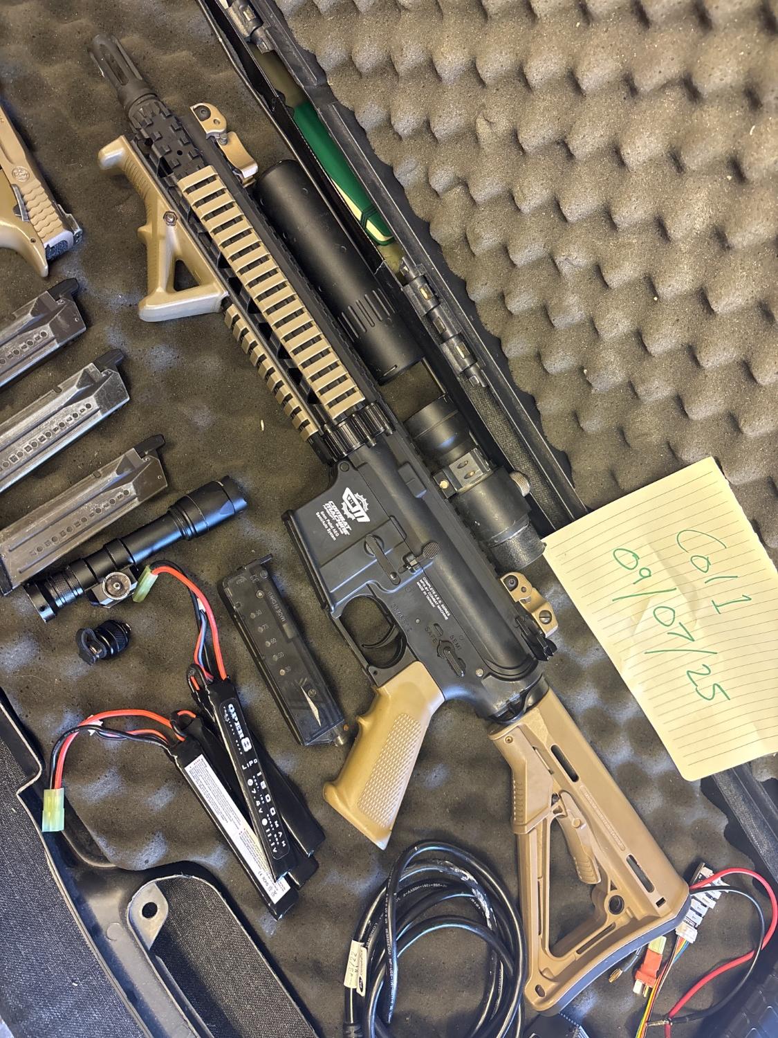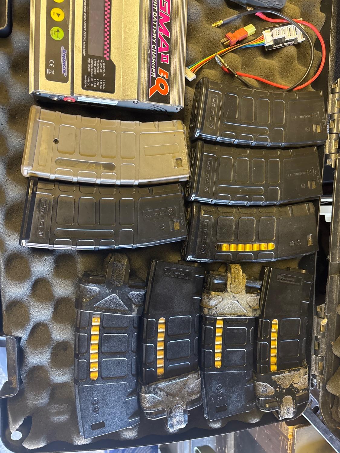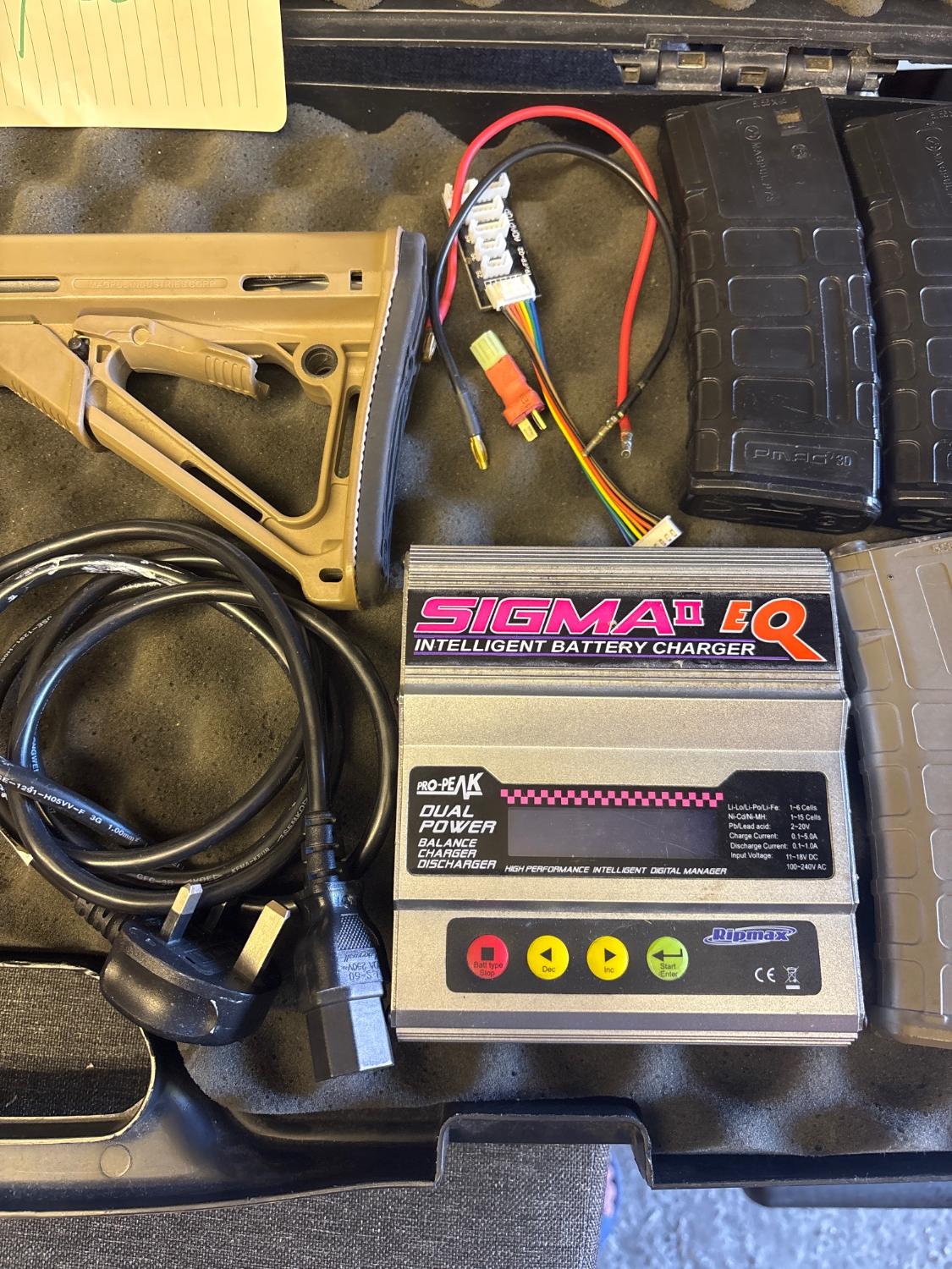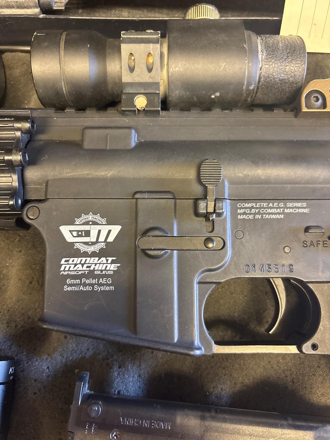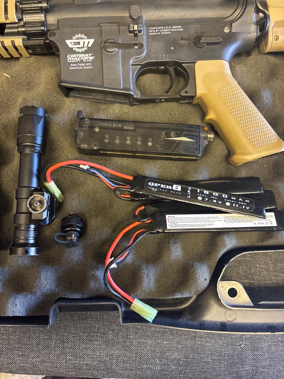 Combat machine AR/M4 AEG rear wired please see photos provided. Red dot sight (no batteries not sure if it works), G&G armament suppressor and muzzle. Magpul angled front grip and CTR stock. Comes with copy of surefire scout light and press pad switch. 2 lipo batteries and Sigma 2 EQ battery charger and leads. 9 mid cap magazines. Hard case some minor damage on one of the feet that has been repaired. Also in the case is a Tokyo Marui smith and Wesson M&P 9 gas blowback pistol (green gas) with 3 magazines. This has been in storage for a while and will need a service and good clean.