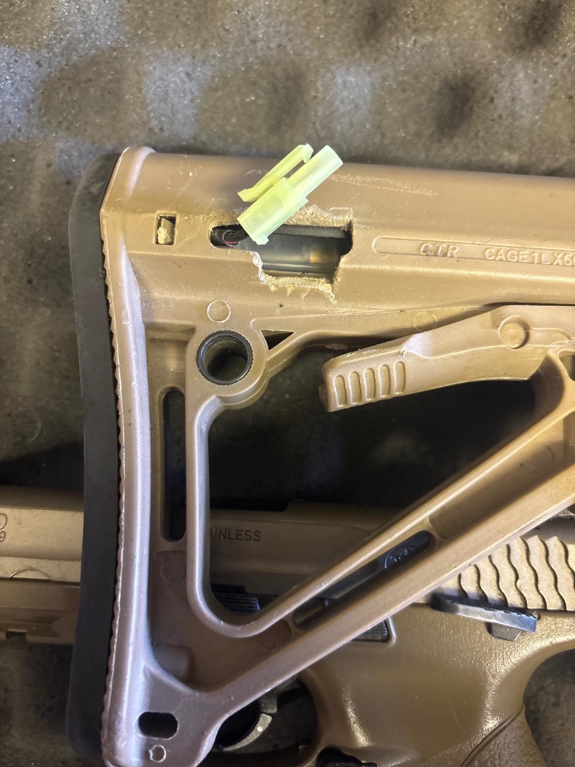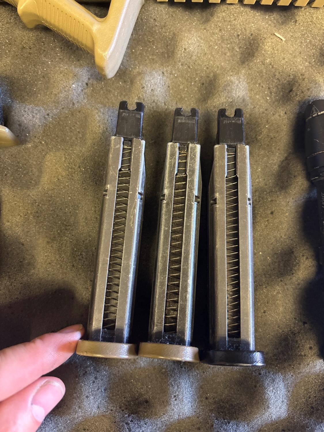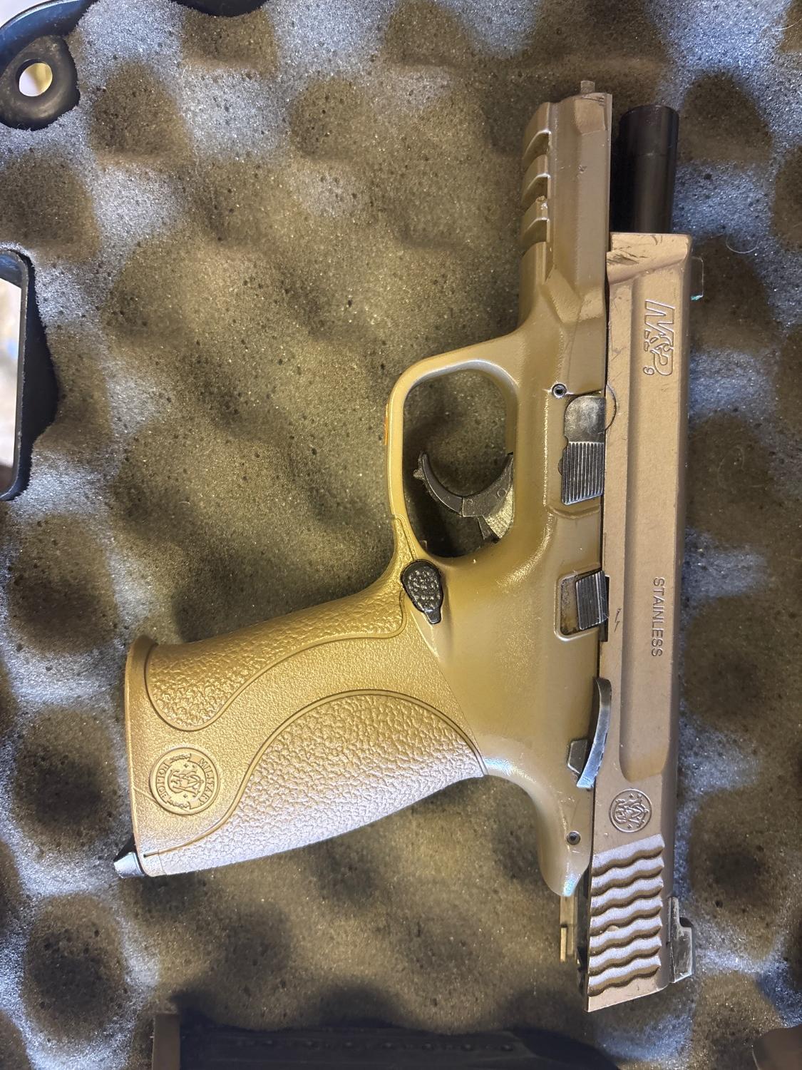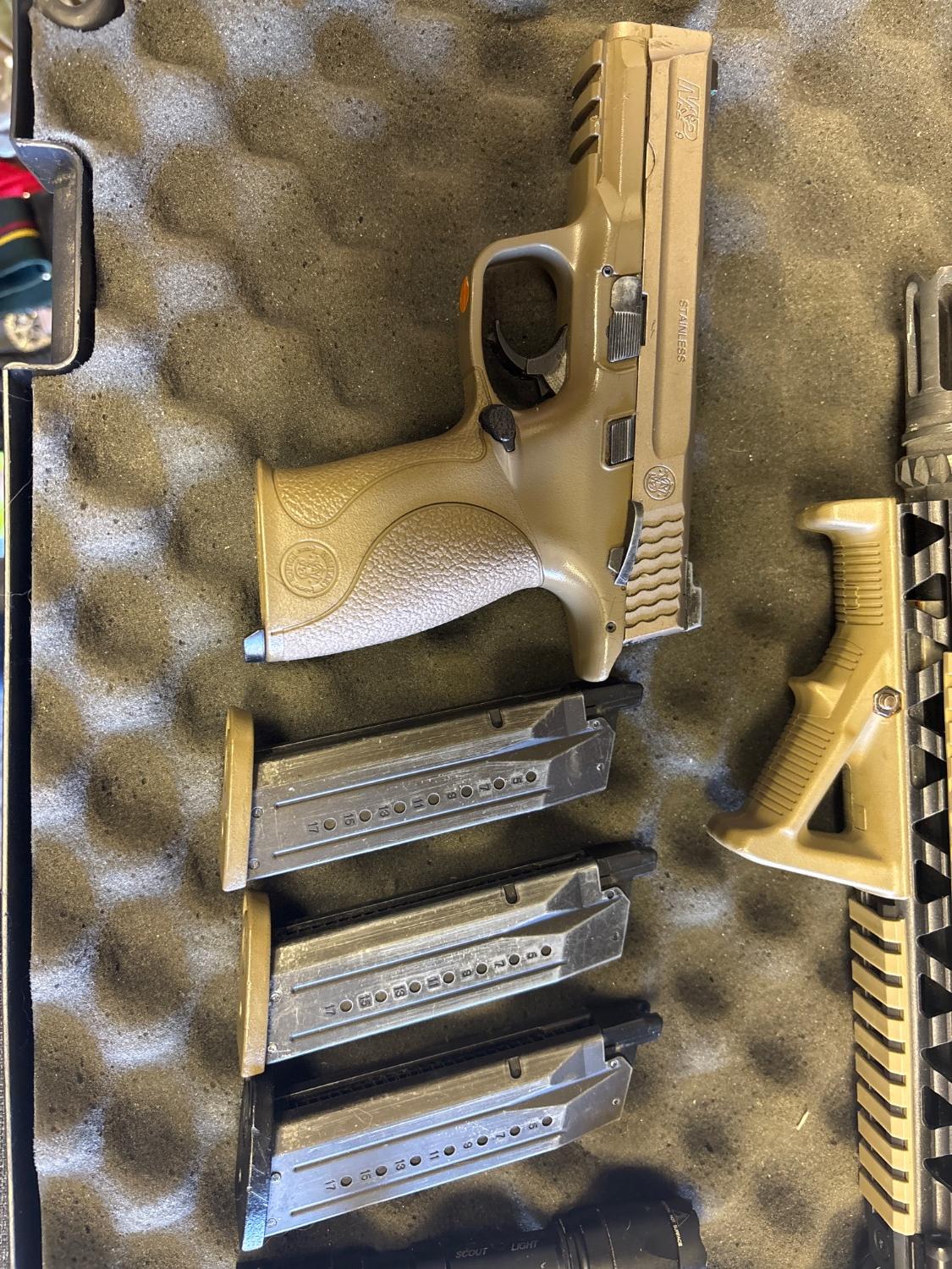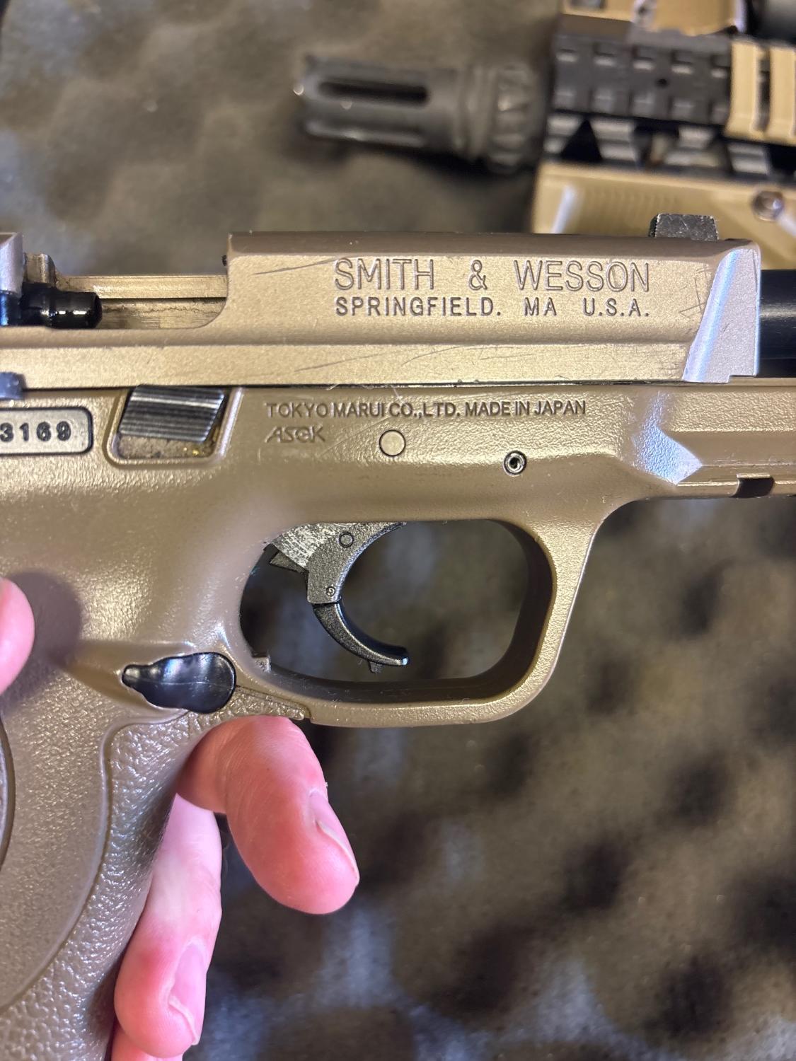 Combat machine AR/M4 AEG rear wired please see photos provided. Red dot sight (no batteries not sure if it works), G&G armament suppressor and muzzle. Magpul angled front grip and CTR stock. Comes with copy of surefire scout light and press pad switch. 2 lipo batteries and Sigma 2 EQ battery charger and leads. 9 mid cap magazines. Hard case some minor damage on one of the feet that has been repaired. Also in the case is a Tokyo Marui smith and Wesson M&P 9 gas blowback pistol (green gas) with 3 magazines. This has been in storage for a while and will need a service and good clean.