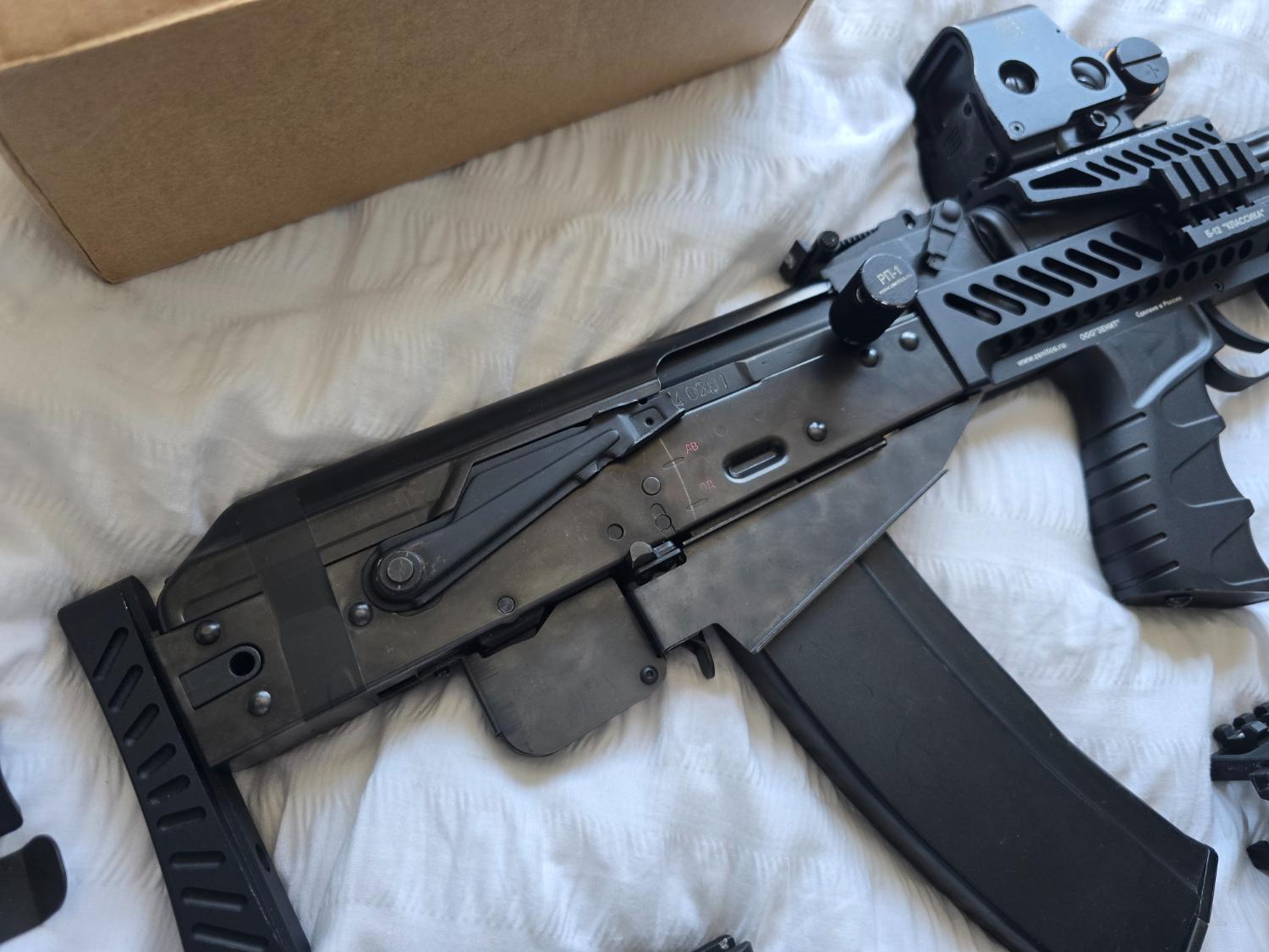 GHK AK105, Pre-2018, with TNT Hop Unit, Heavy Recoil Kit and Buffer Spring. Comes with Zenitco RP1 Ergo Charging Handle and 5KU B10M and (I think) Repro RK3 Grip. Also comes with 2x magazines, 1x fine and 1x leaking (easy fix).