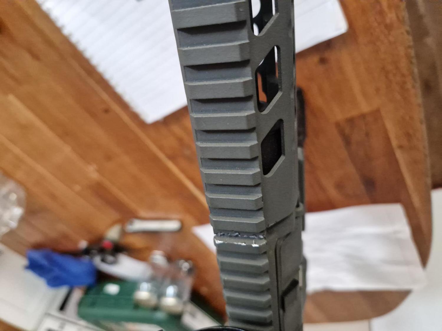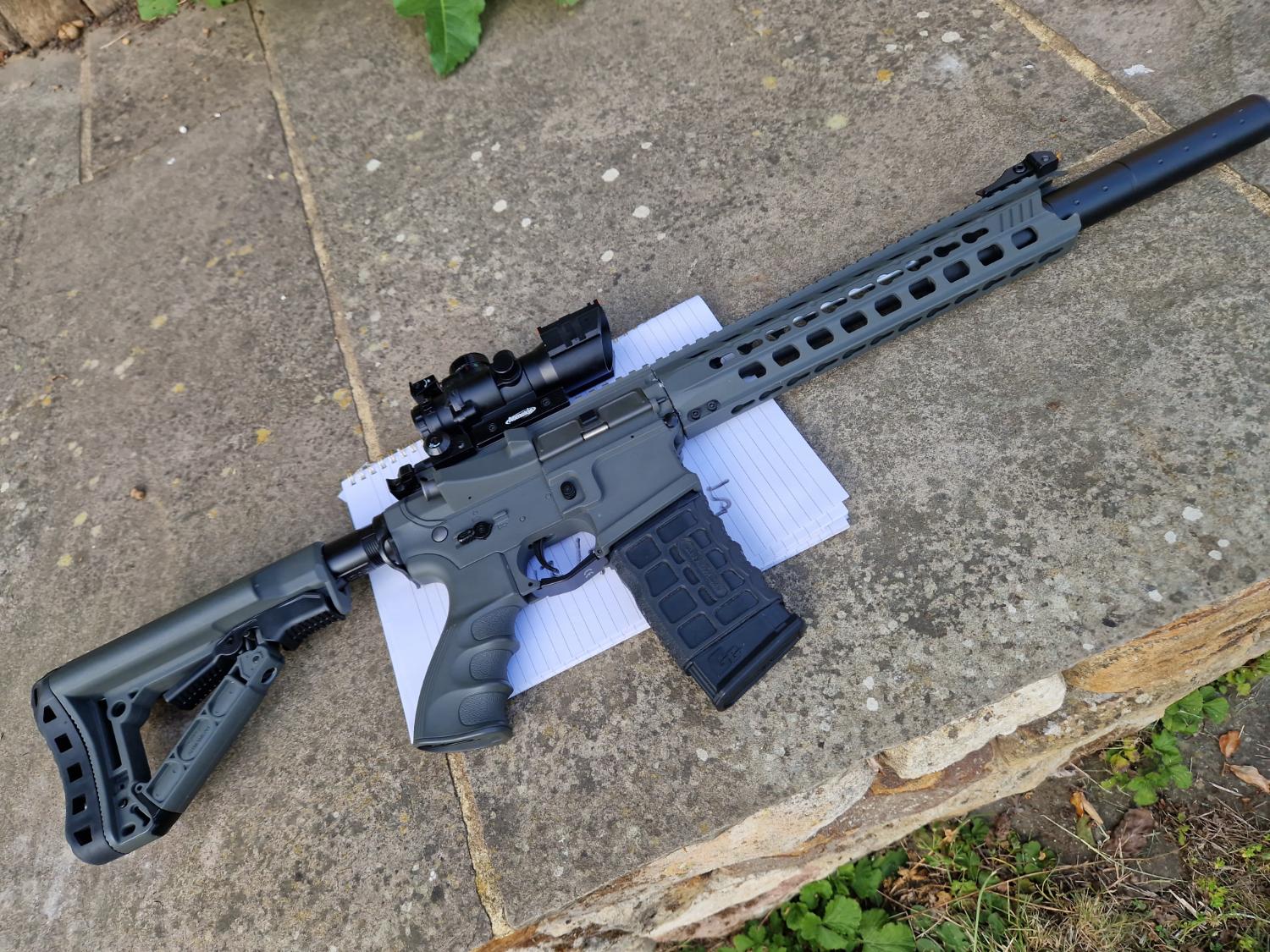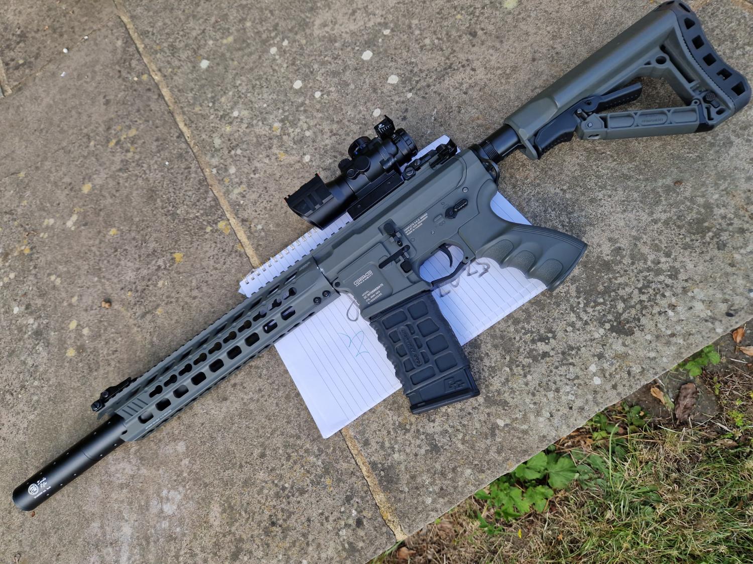 This is my g&g predator. It's shoots well at 310fps on 0.2g bbs. It comes with a 4x Acog style scope with illuminated reticle (needs a new battery), silencer, flip up iron sights, and hi cap mag. Really like the black and grey dual tone colour on this but it needs to go to find another purchase unfortunately. There is some paint damage where someone (not me) attempted to remove the handguard. It also doesn't have the original handguard so I've used to standard black screws for this instead.