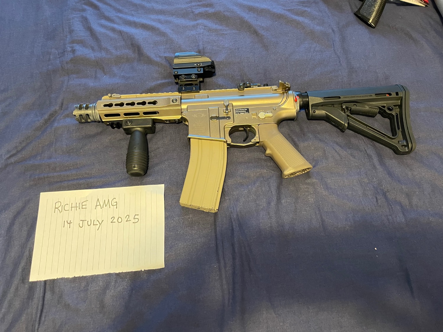Magpul MOE stock, vertical fore grip, generic holo sight red/green, battery and 4 mags plus other bits and spares