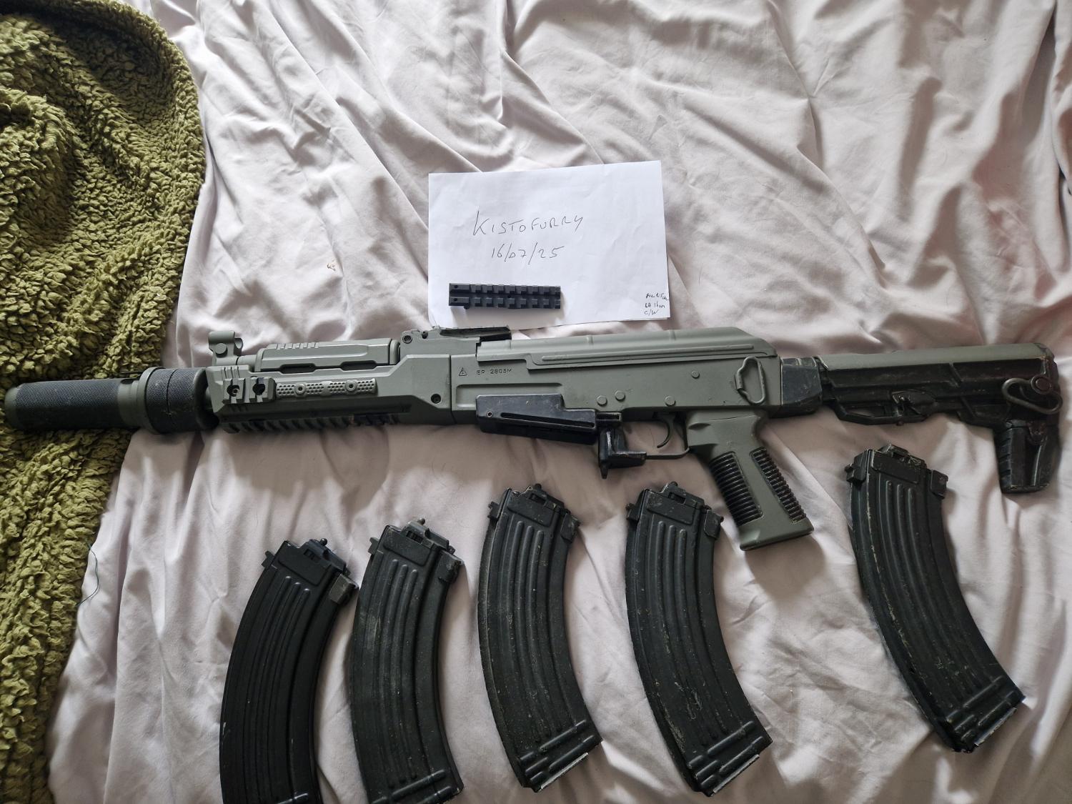 Comes with suppressor, longer scope mount and 4 working mags, the 5th mag appears to have a broken spring.