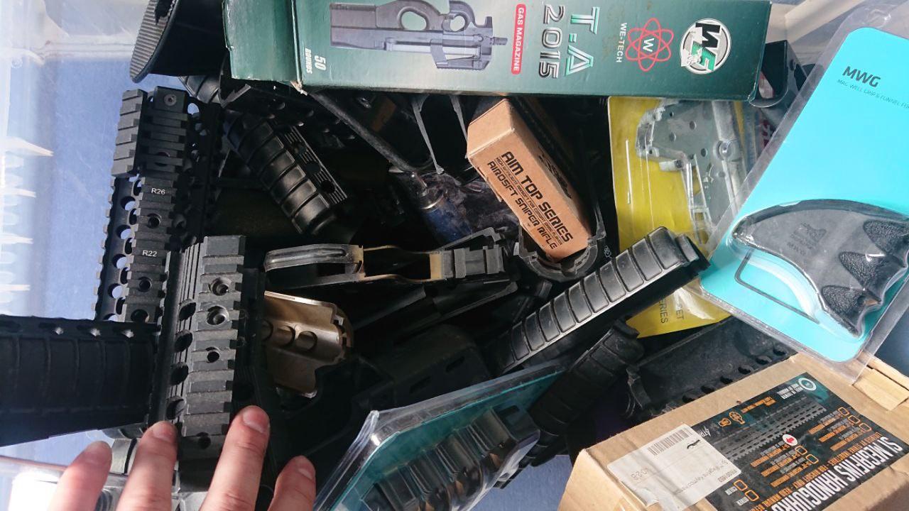 Third box is a mix of handguards, grips, a we p90 mag and various other bits, couple of new fab defense bits, pistol frames and slides.  Looking for £75