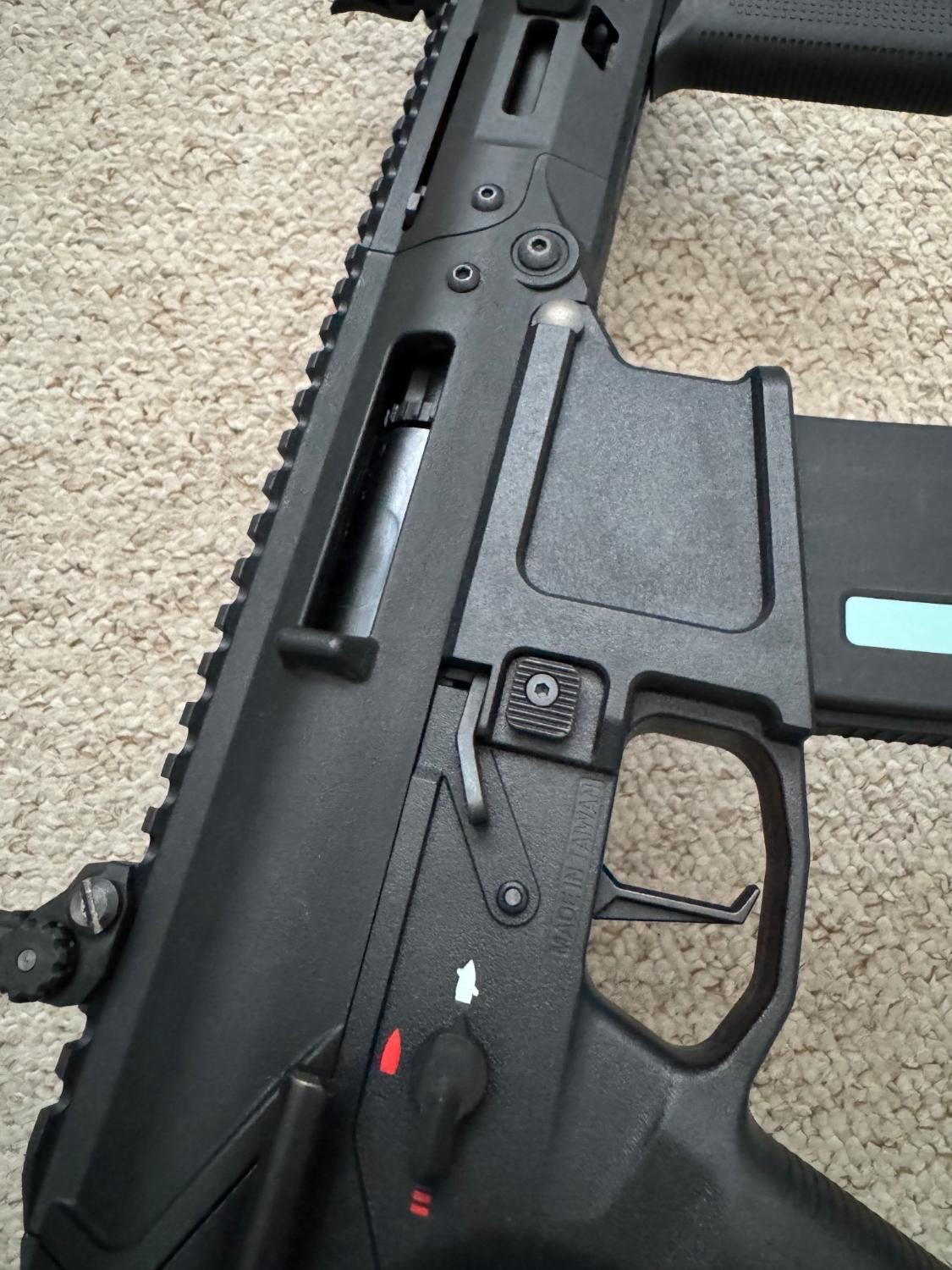 Also included is the original box, manuals, a KWA sticker, 2 tools (one for the QD sling points and M-LOK rails/grip and the other for the FPS adjustment), a 120 round mid-cap magazine with an extended follower, a speedloader, 2 QD sling points that can be attached on the receiver and 2 M-lok rails already attached to the hand guard at 3 and 9 o’clock. Furthermore, This replica comes with an air tech studios battery compartment extender. I lost the original cover and battery space was cramped out of the box so I brought this extender to allow longer batteries to be used. This does stop the stock from collapsing fully but it still comes in far enough to have 3 points of adjustability.