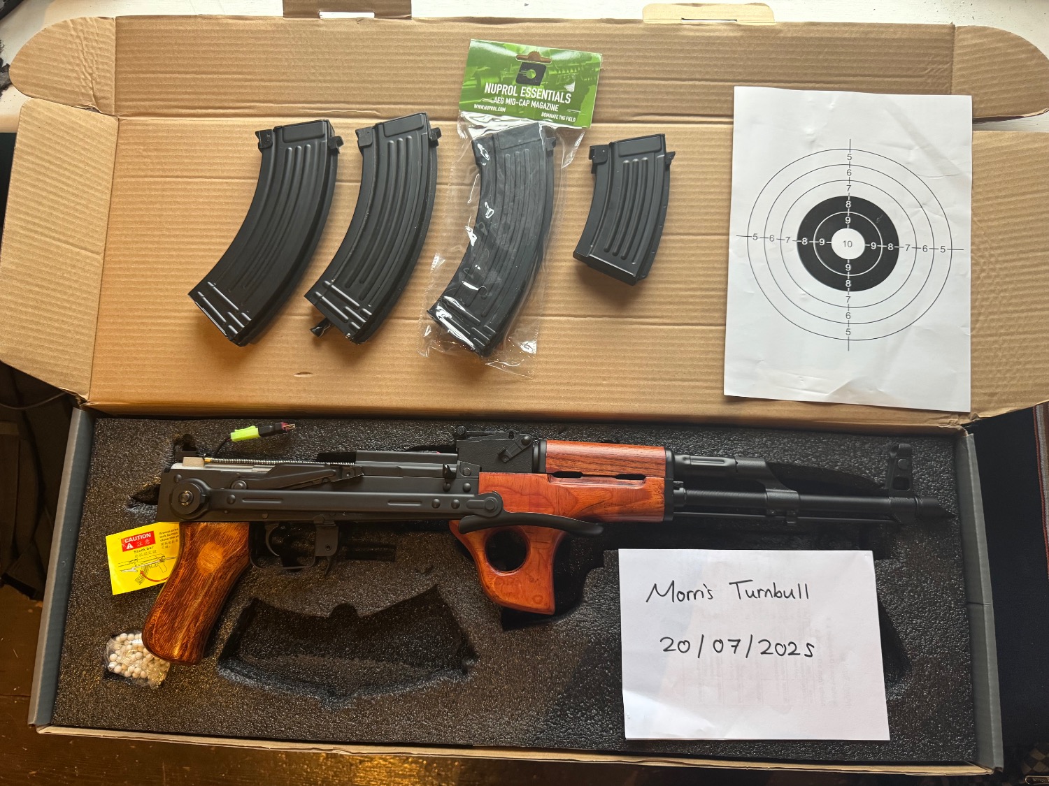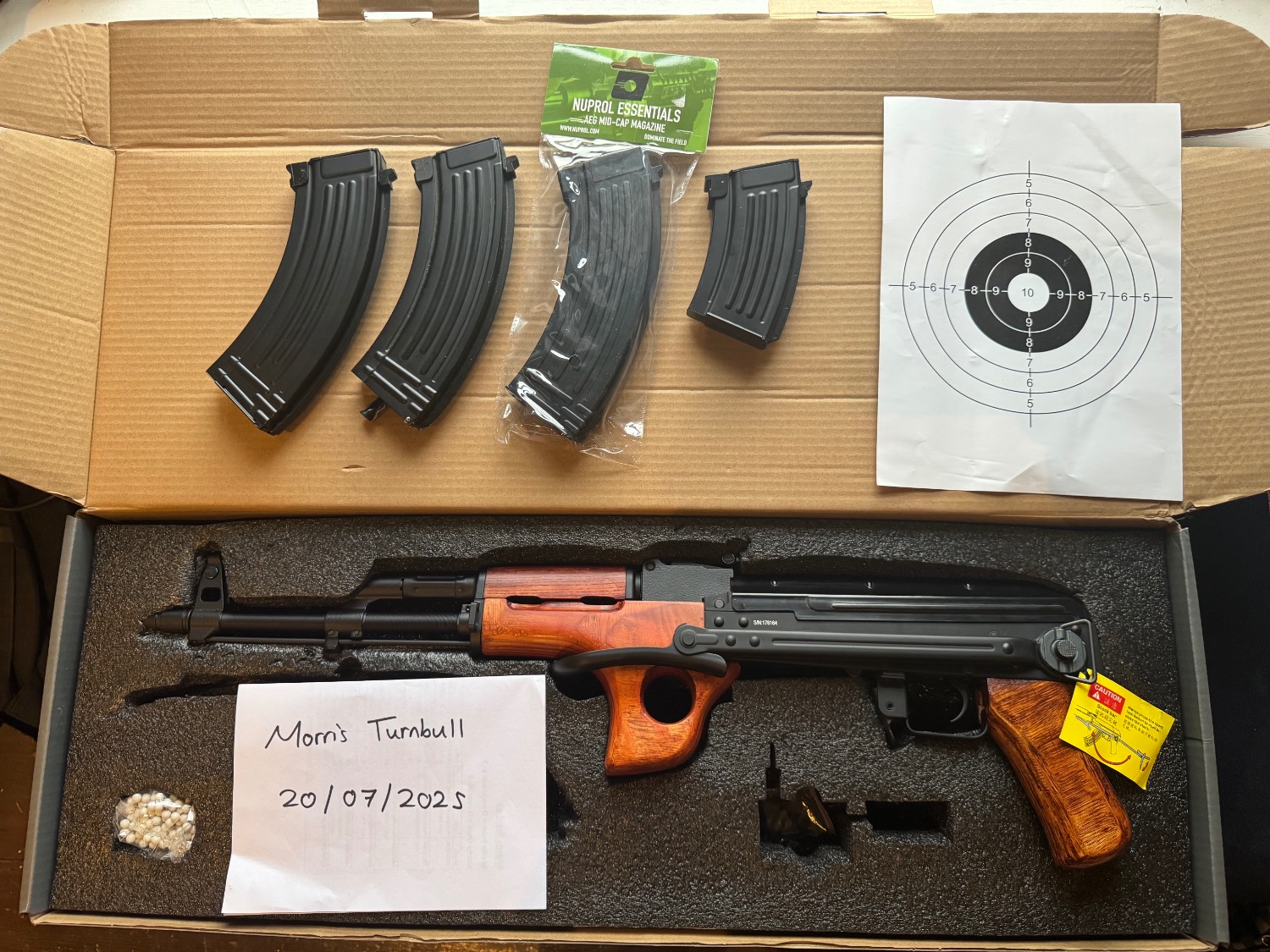 For sale is my Cyma 048 which I bought but changed kits so it never got fielded and is practically brand new. It has only ever had one mag through it to test it worked properly (which it does) Has a high torque motor, silent piston and silent cylinder head and steel gears etc (Cyma pre-upgraded range) Being an 048 it’s mostly made of stamped steel and the furniture is real wood. Comes with 1 unopened NUPROL 140rnd mid cap, included 500rnd high cap and short 20rnd style 250rnd high cap, as well as a 500rnd flash mag that I’ve had for a while and I’m unsure if it feeds properly. Also comes with a mini tamiya to deans adapter.