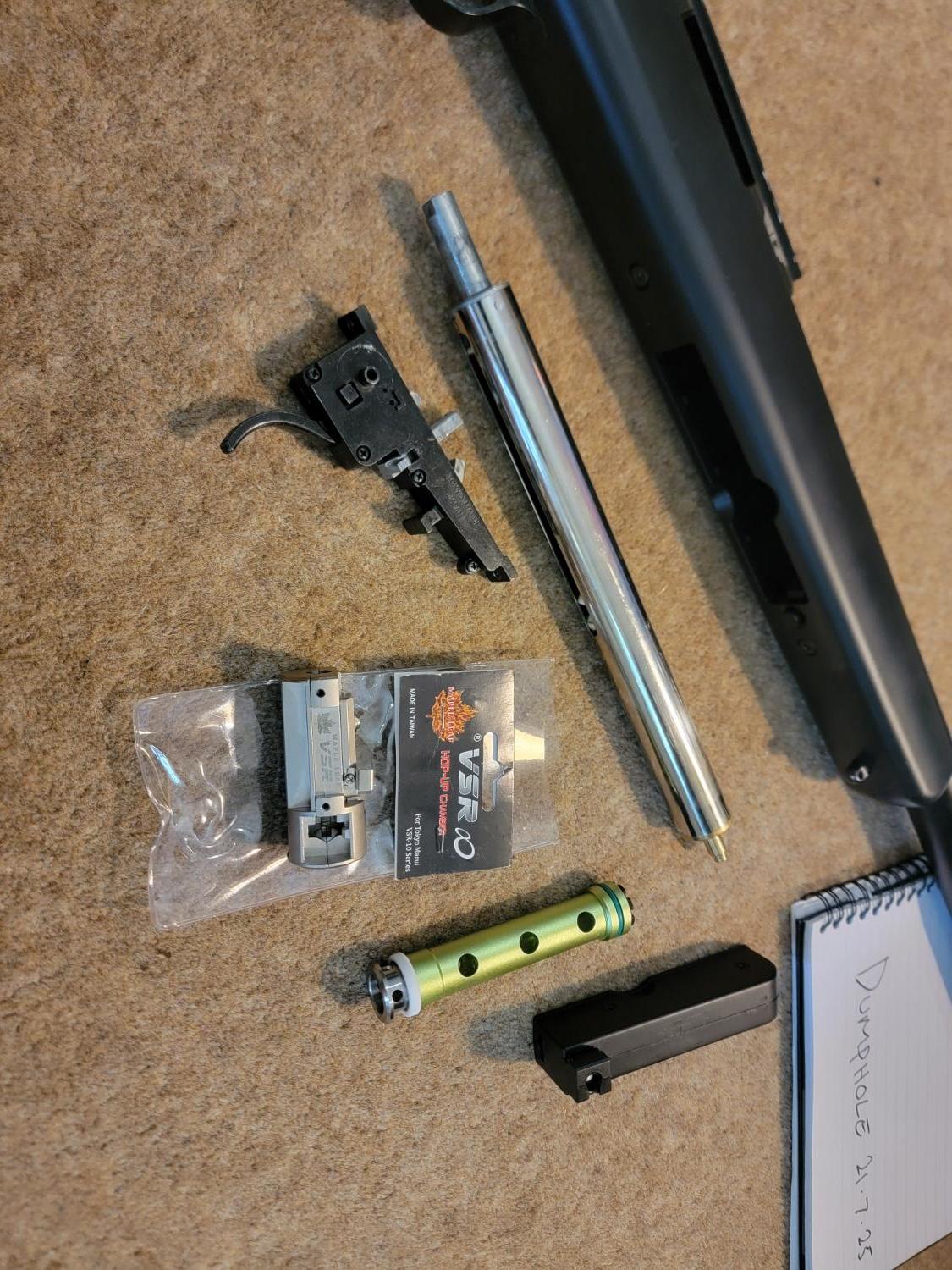 I've taken the cylinder (plus internals), trigger box, hop unit (with maple leaf hop rubber) from a brand new vsr one and transferred them all into this vsr 10. It fires like a slightly improved stock tm vsr pitting out .32bbs at .8j.
