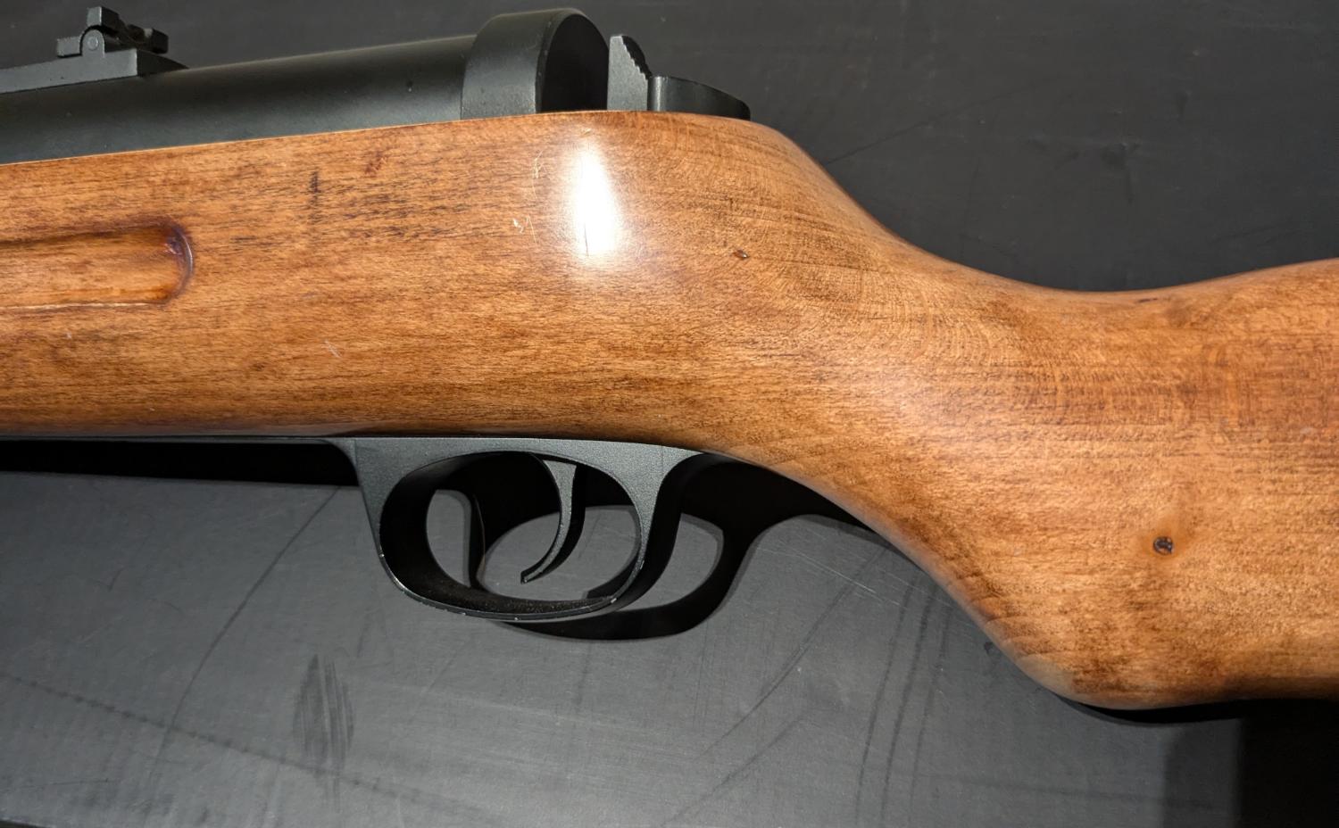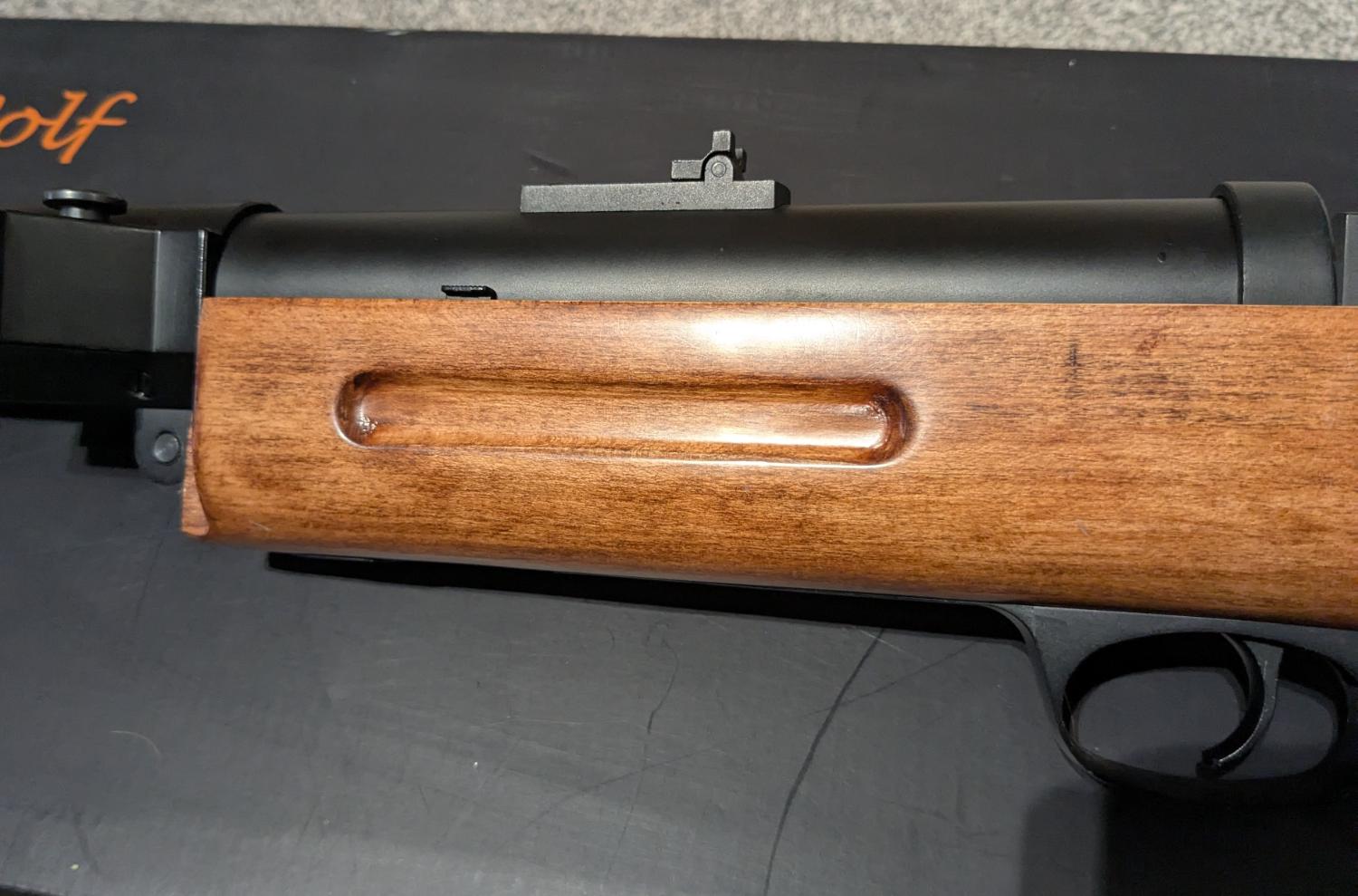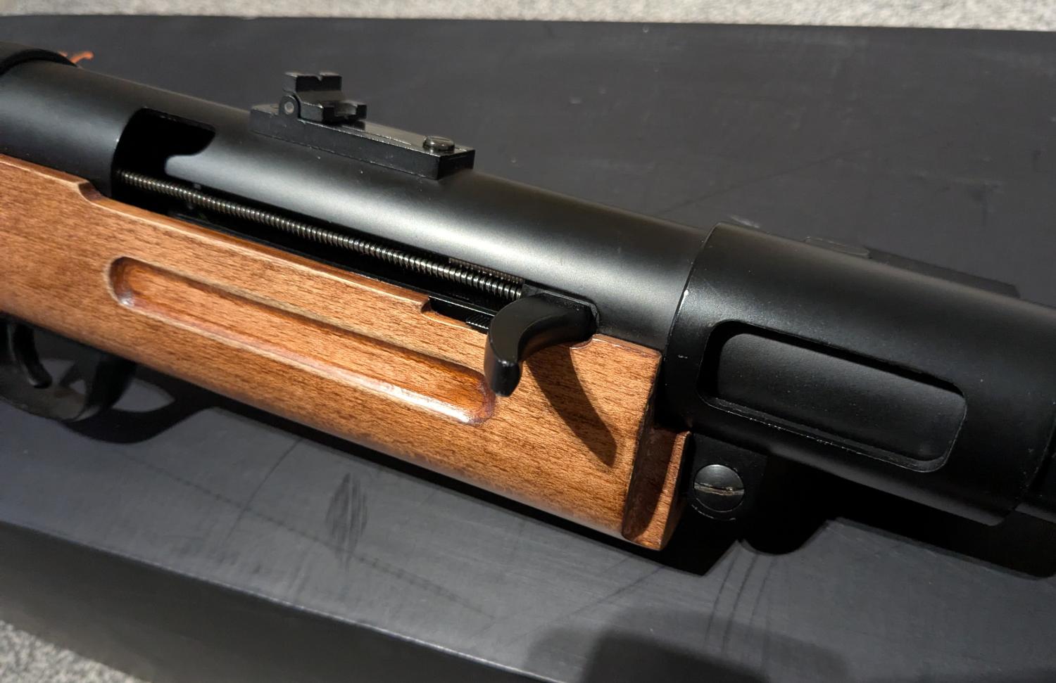 It's in really nice all round condition, I lightly sanded the lacquered finish on the wooden stock and polished it with some beeswax for a good shine - wood grain is clearly visible and looks great. The replica shoots at just under 340fps on a 0.2g BB, so should be suitable for use UK-wide. The r-hop patch allows you to use some quite heavy BBs and I've found this runs best on 0.30-0.32g.