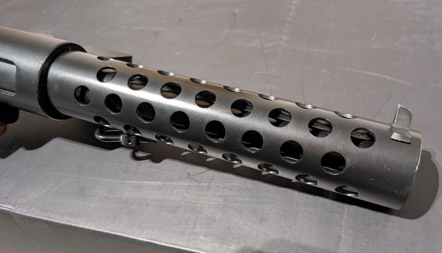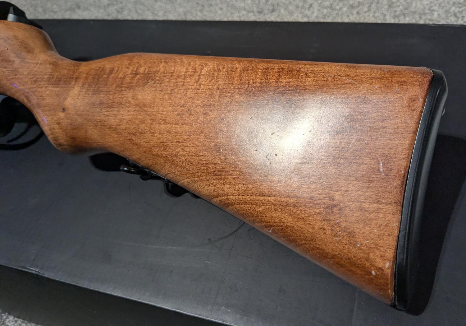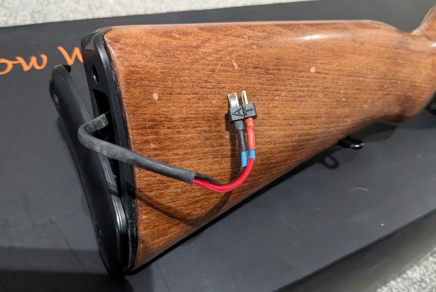 It's in really nice all round condition, I lightly sanded the lacquered finish on the wooden stock and polished it with some beeswax for a good shine - wood grain is clearly visible and looks great. The replica shoots at just under 340fps on a 0.2g BB, so should be suitable for use UK-wide. The r-hop patch allows you to use some quite heavy BBs and I've found this runs best on 0.30-0.32g.