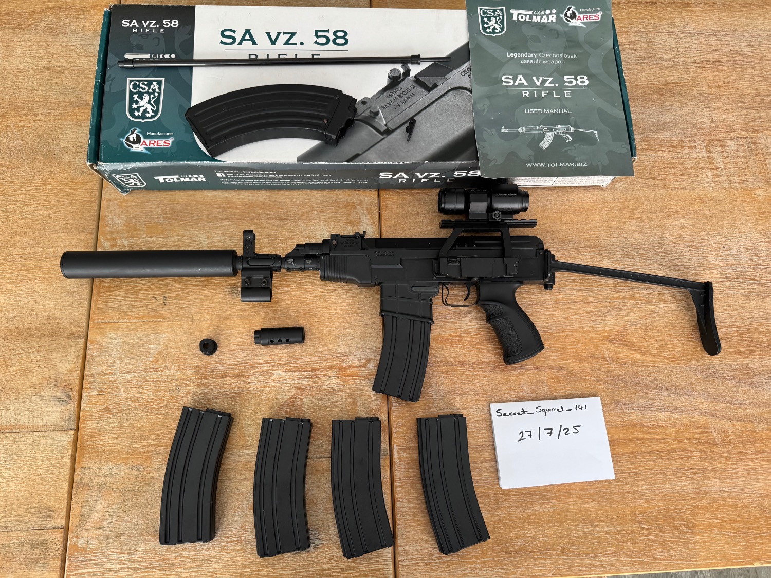 Comes with aimpoint and flash hider, ak side rail for sight, suppressor, M4 mag well and torch clamp (just needs a torch)