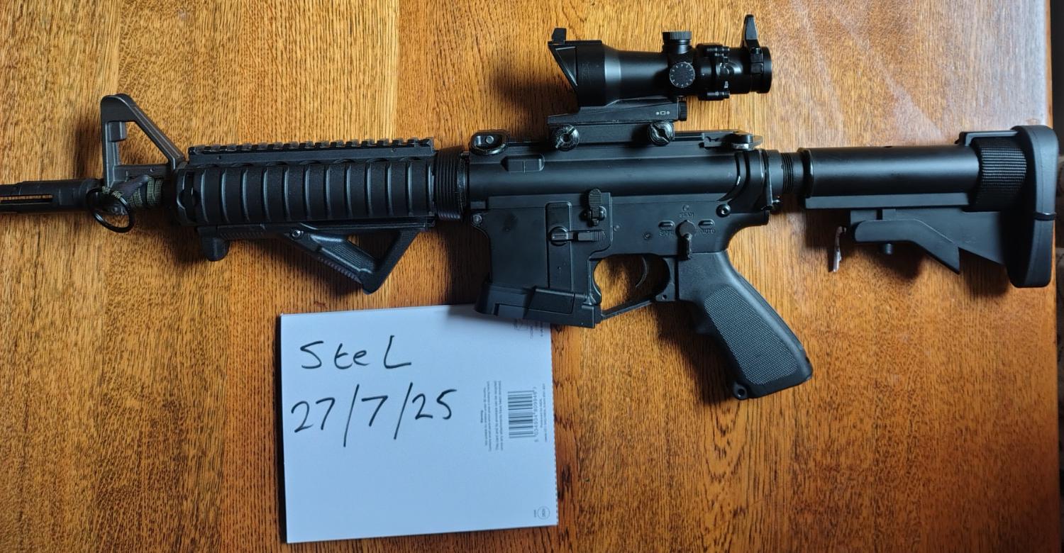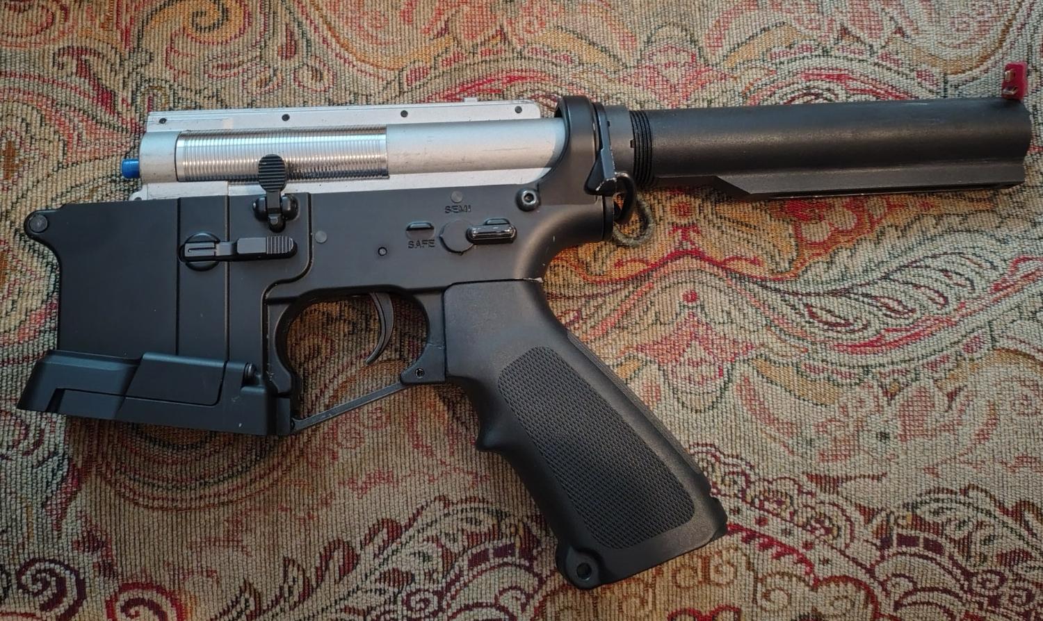 Please note, there is a small crack in the lower receiver LHS near the trigger housing after it was dropped in a game. It has been repaired and repainted as can be seen in the pics.