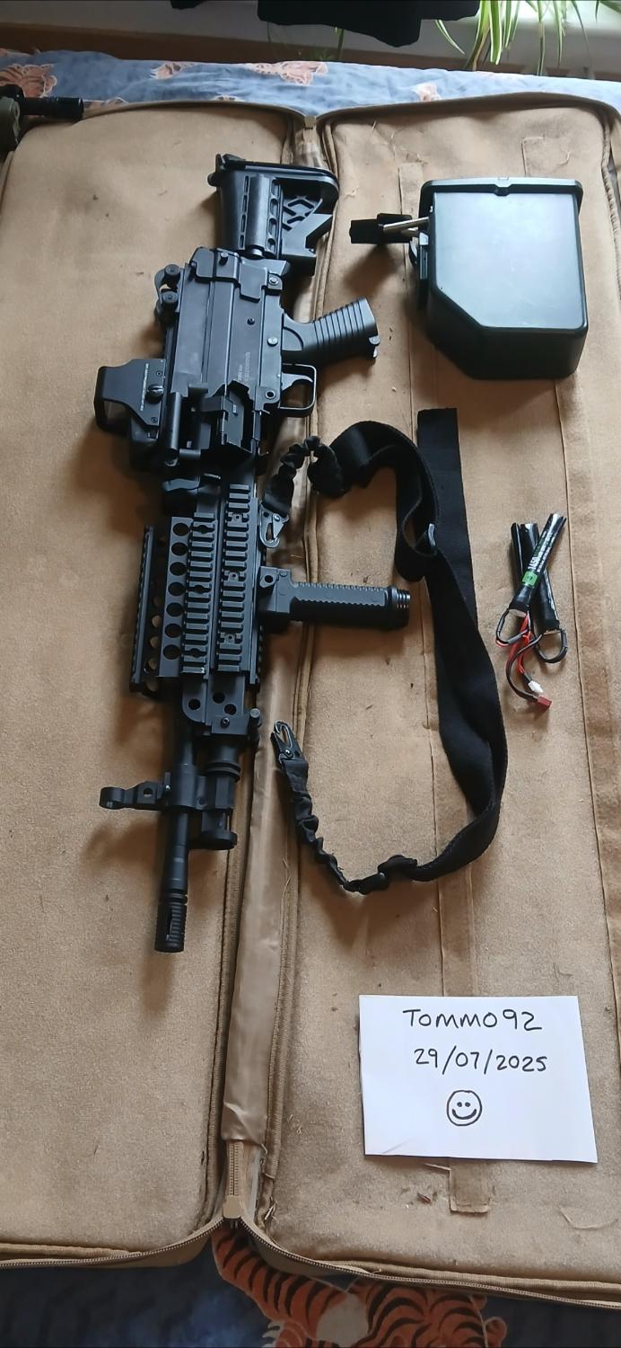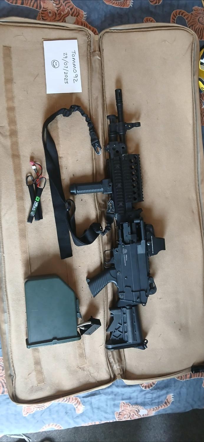Comes with box mag, eotech replica, sling, grip, 11.1 lipo battery and nuprol gun bag.