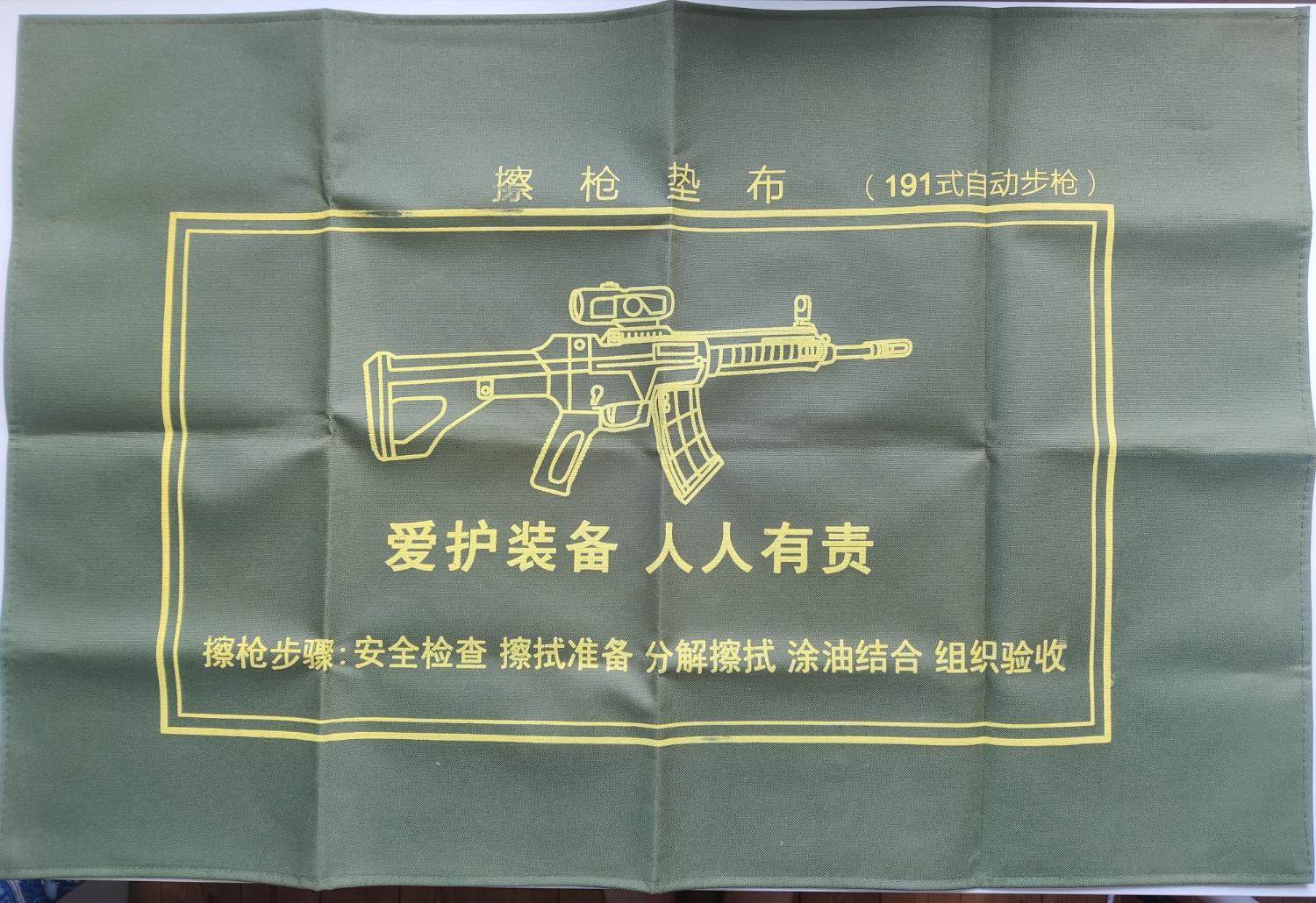 The Chinese writing on the cloth says "Gun Cleaning Cloth (Type 191 Automatic Rifle)". The text below the rifle is an idiom meaning "Caring for Equipment is Everyone's Responsibility", and then some step-by-step instructions for gun cleaning.