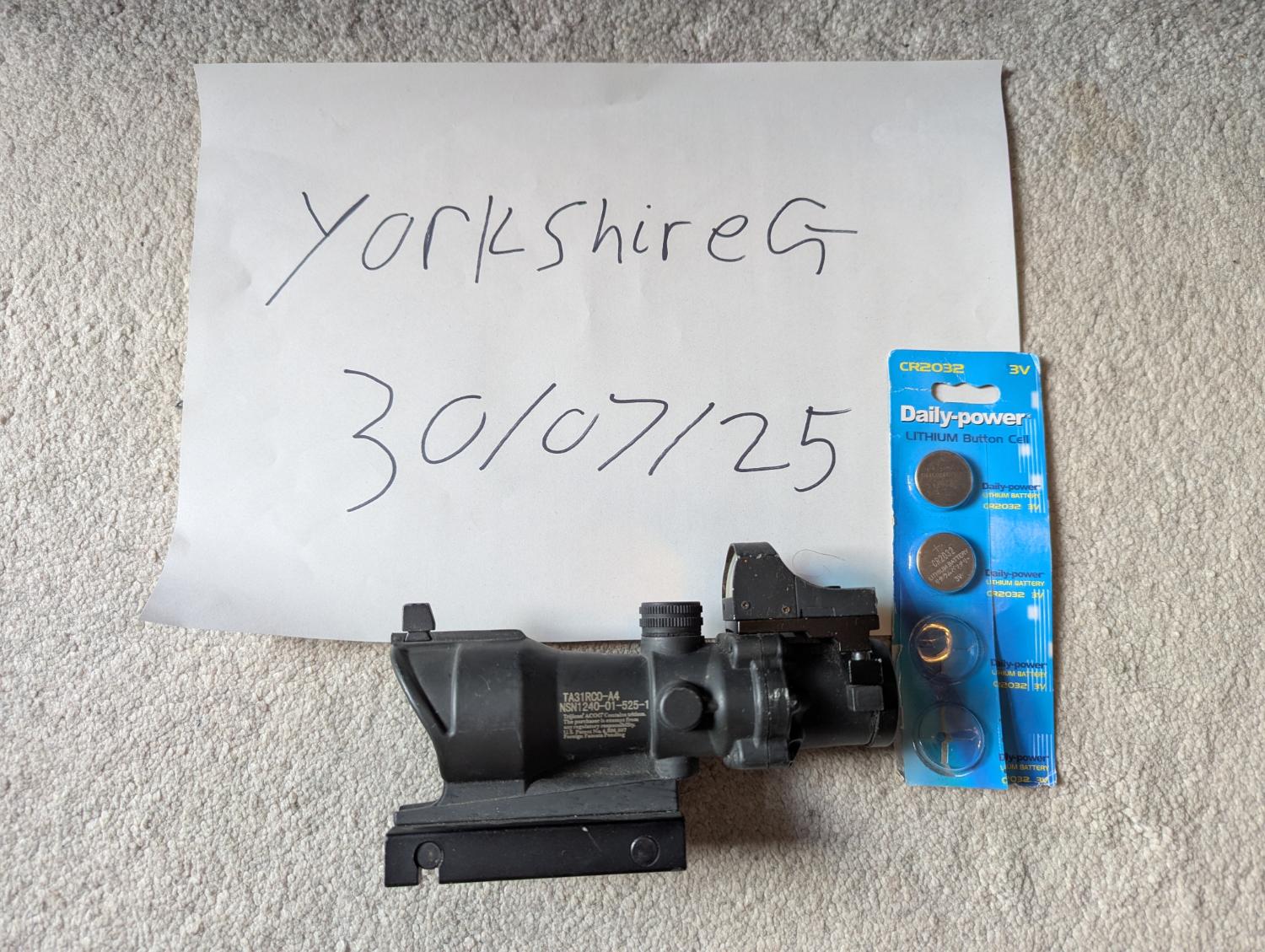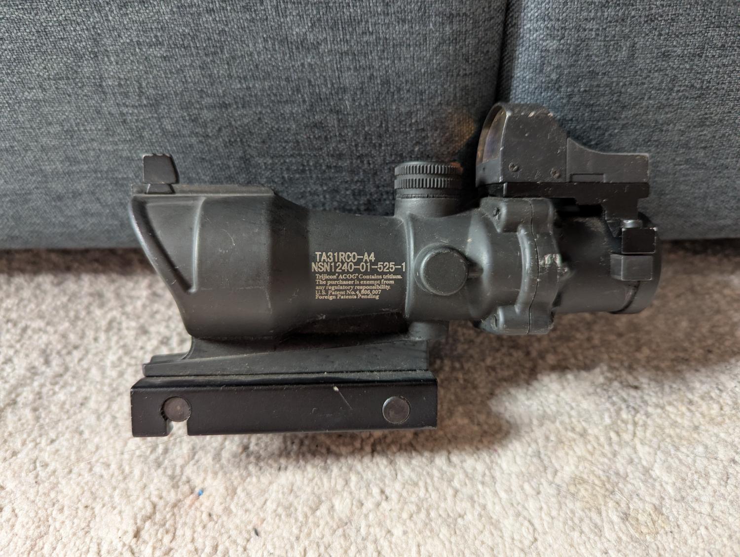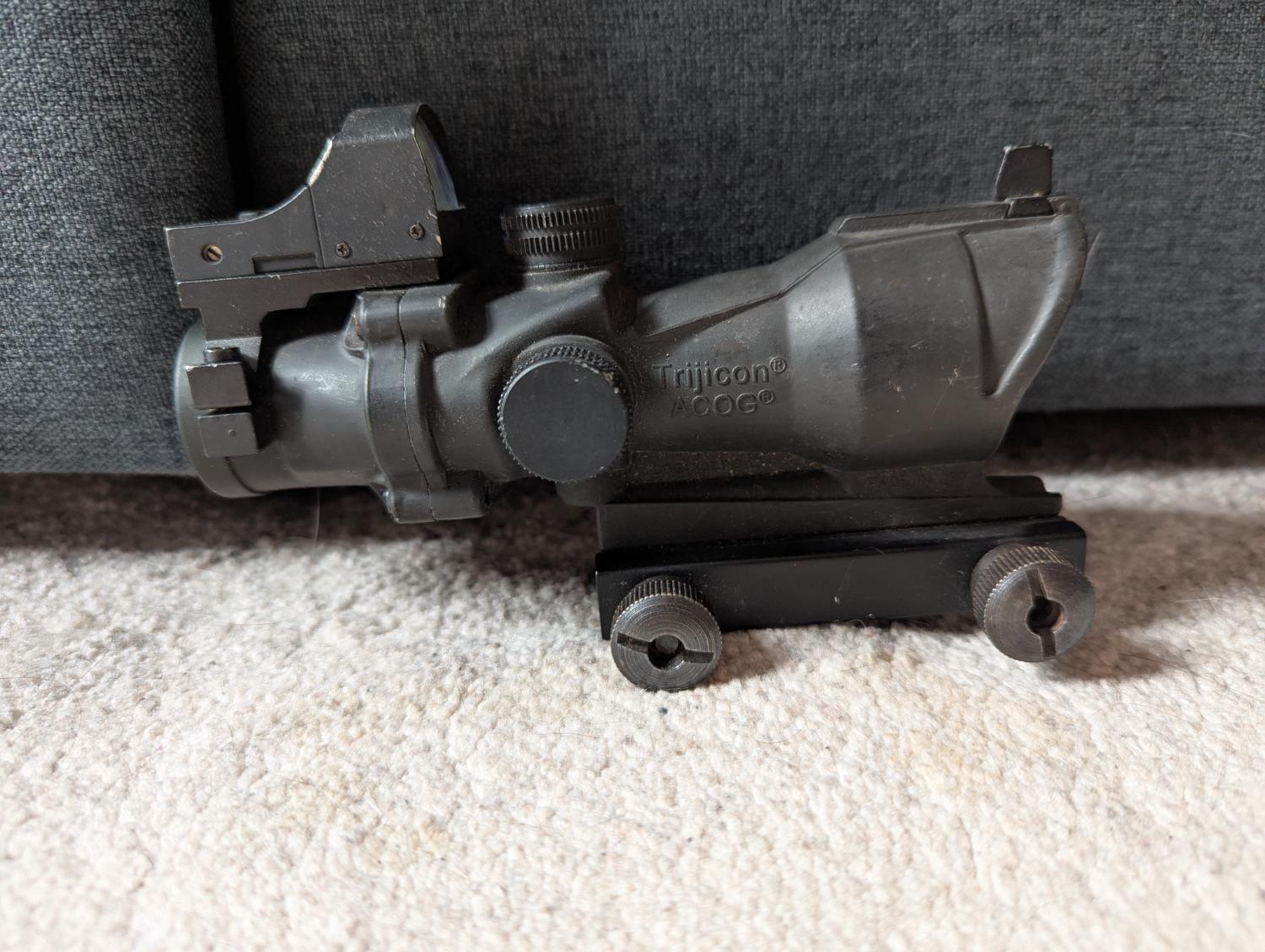 Used lots of times but in good condition. It's about 4 X zoom and I can't remember the brand but it's a solid build. The red dot works but it is missing the cover for it.