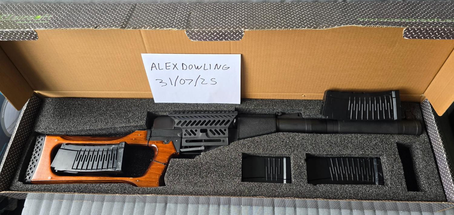 Used in a few games, comes with original mag and 3 mid caps, rail for the barrel and rail for a sight. The stock screw fell out during a game, has been replaced but the stick has some wobble, has also split slightly at the foregrip, hence the cable ties