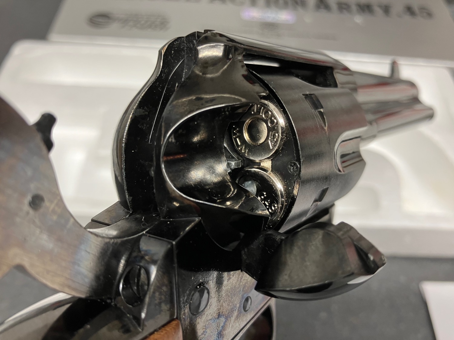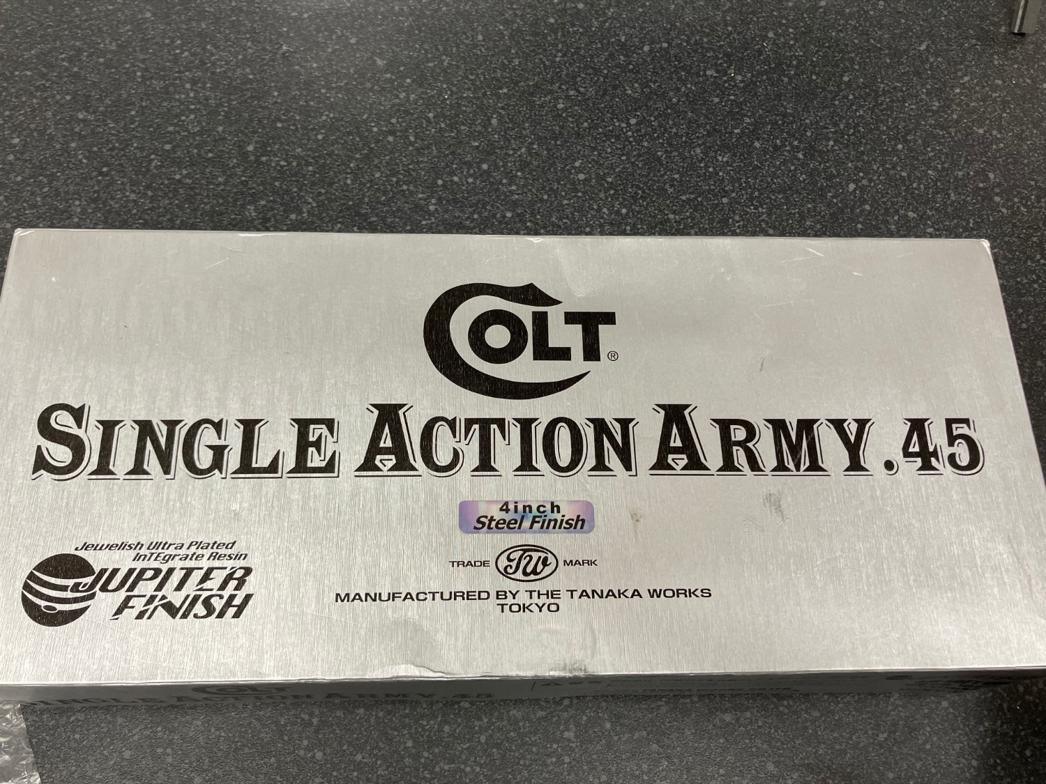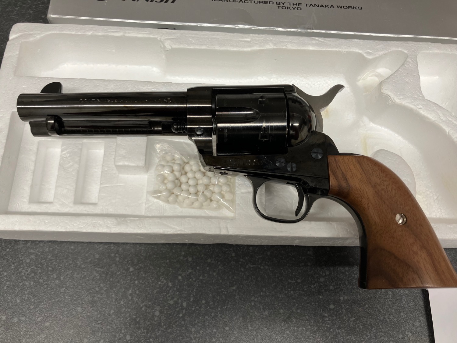 Beautiful Tanaka SAA 4” finished in the premium Jupiter finish. Excellent condition with just very slight cylinder rotation marks, as to be expected. Fitted with weighted walnut grips giving it a nice weighted feel. Comes boxed with manual and filler adapter.