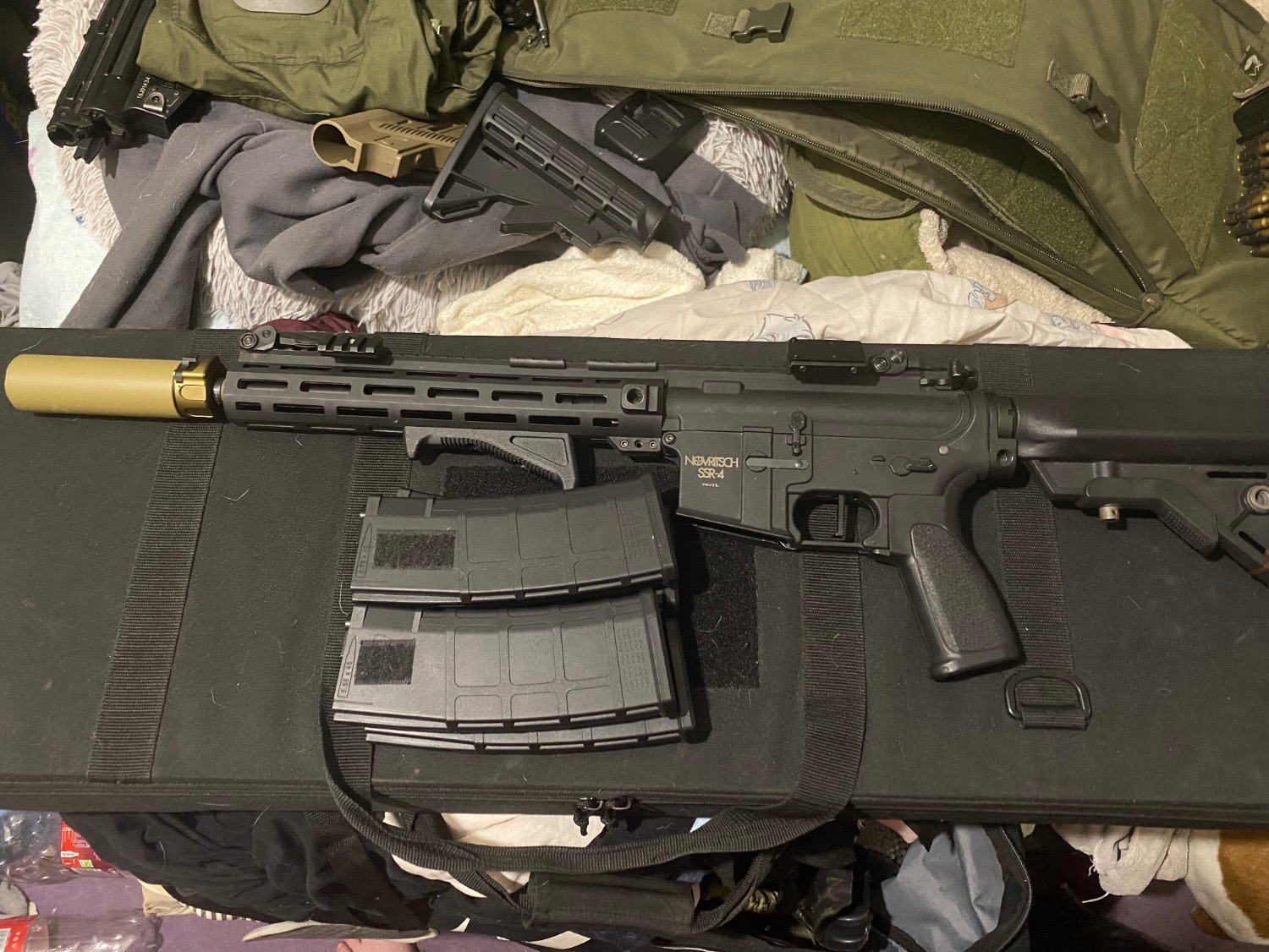 Hey looking sell my novritsch Ssr4 fully stock gear box hop rubber has been changed to a friction pro hop rubber by 4uantum FPS runs at 296 FPS on 0.28bb comes quick change suppressor a 3d printed grip side rails with a min pistol red dot mount on PTS front and rear side and 4 250 round mid caps . Looking to get £190 if goes today collection only from Staffordshire