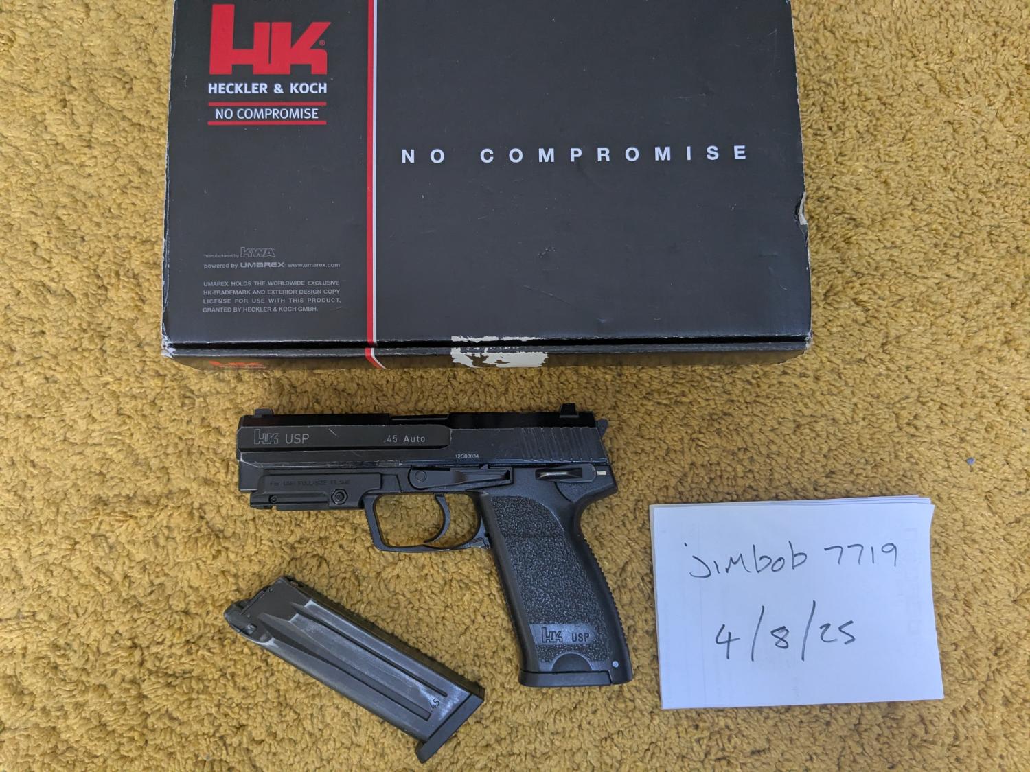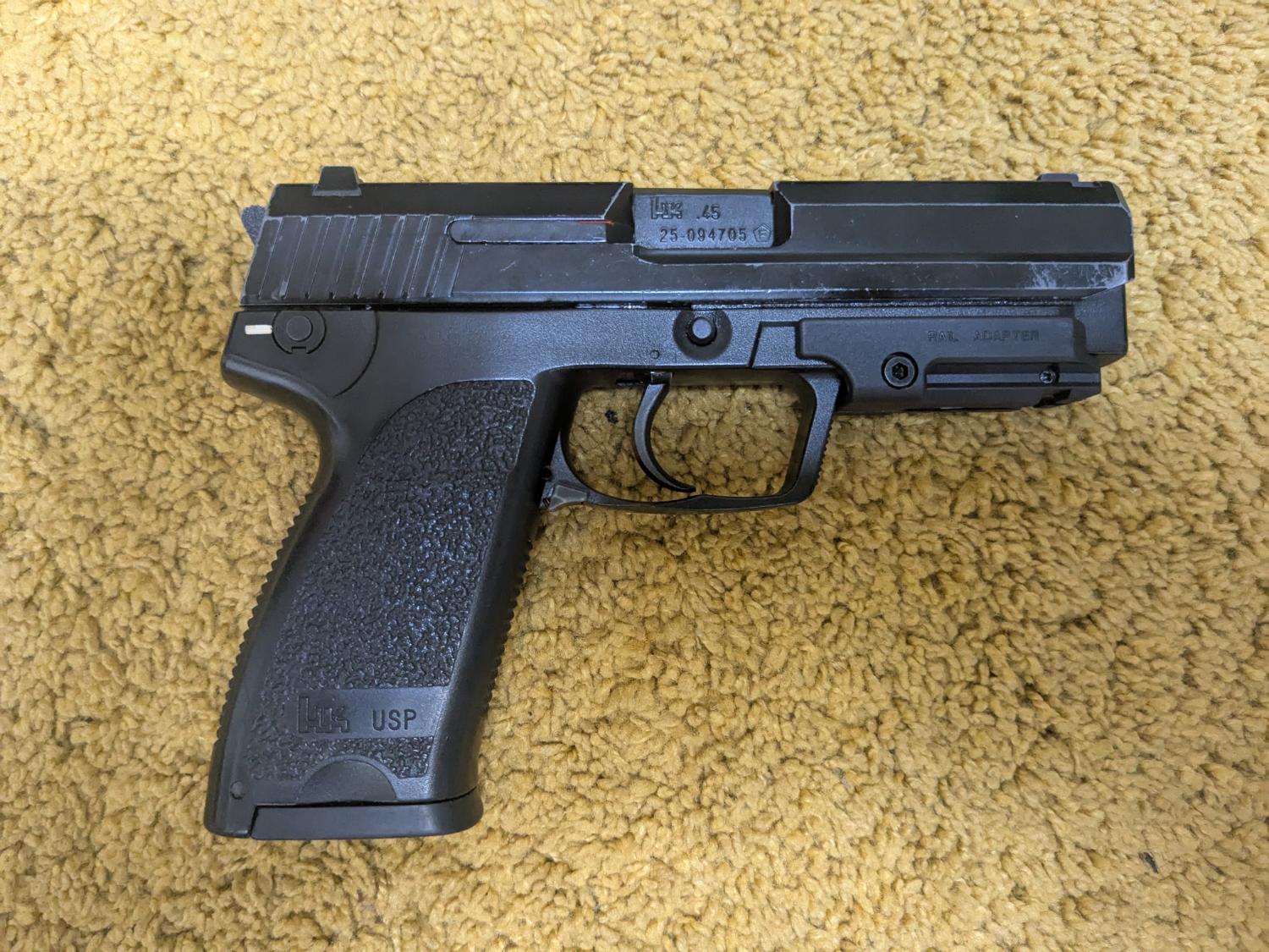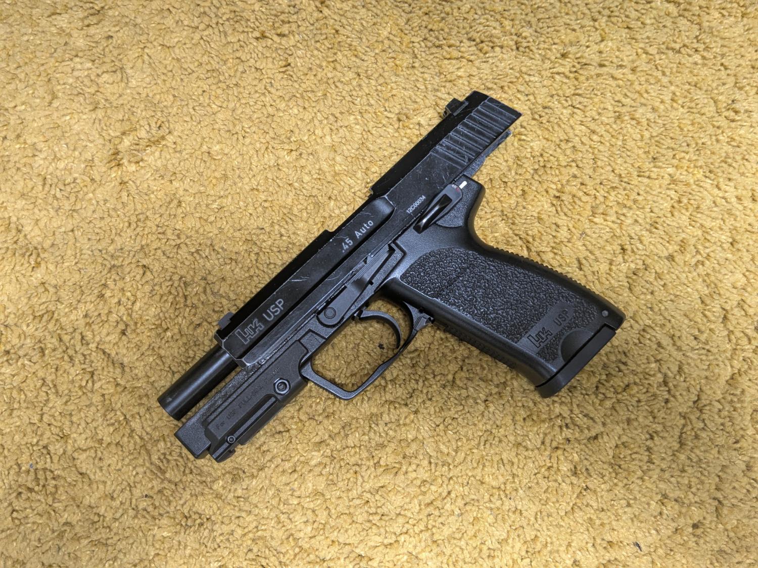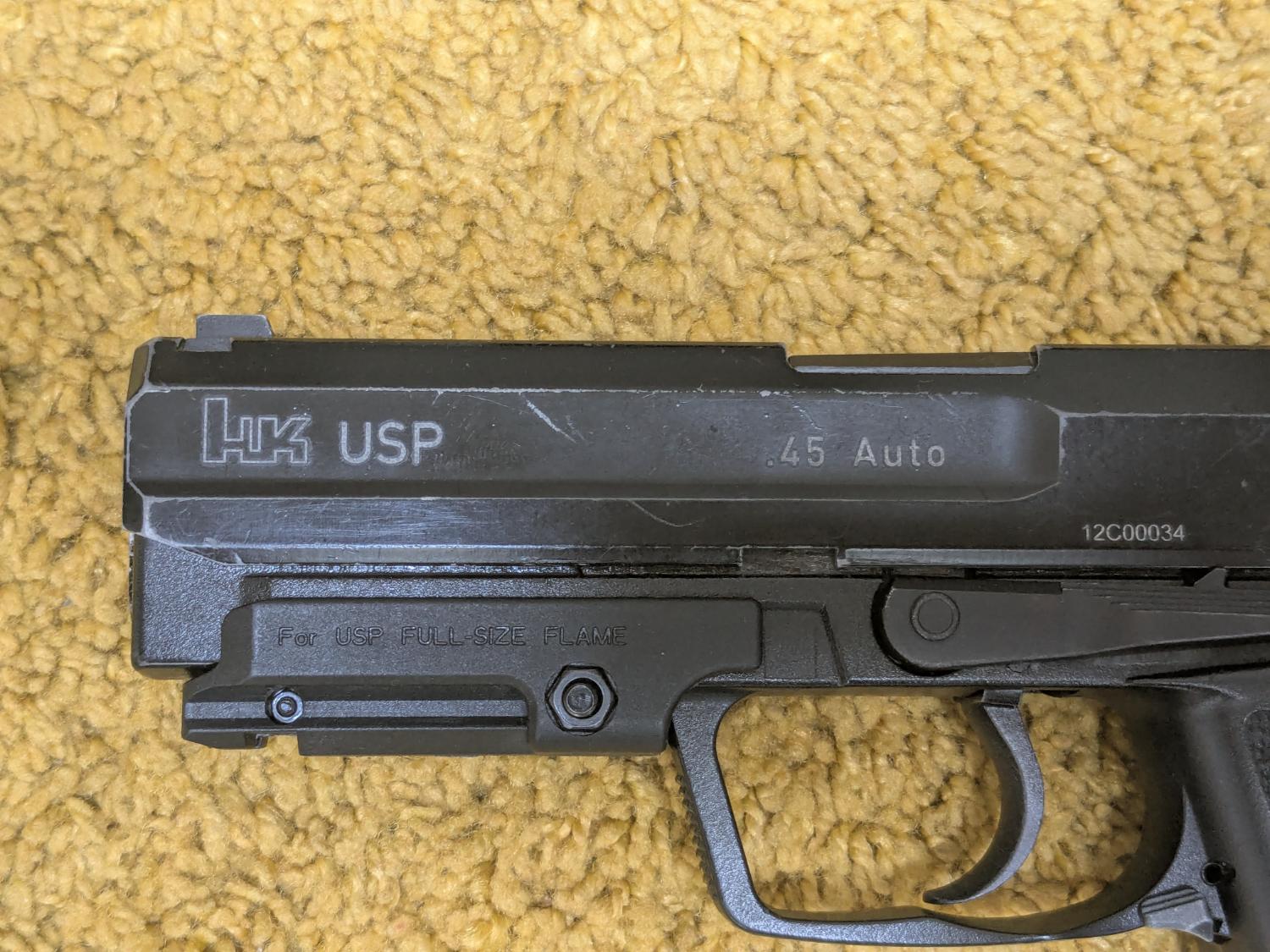Umarex KWA USP 45 with front light attachment and spare mag.