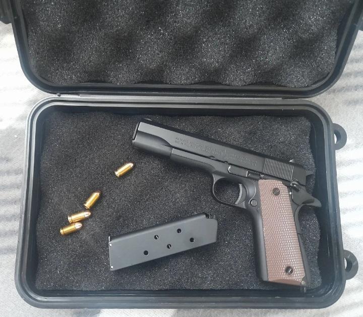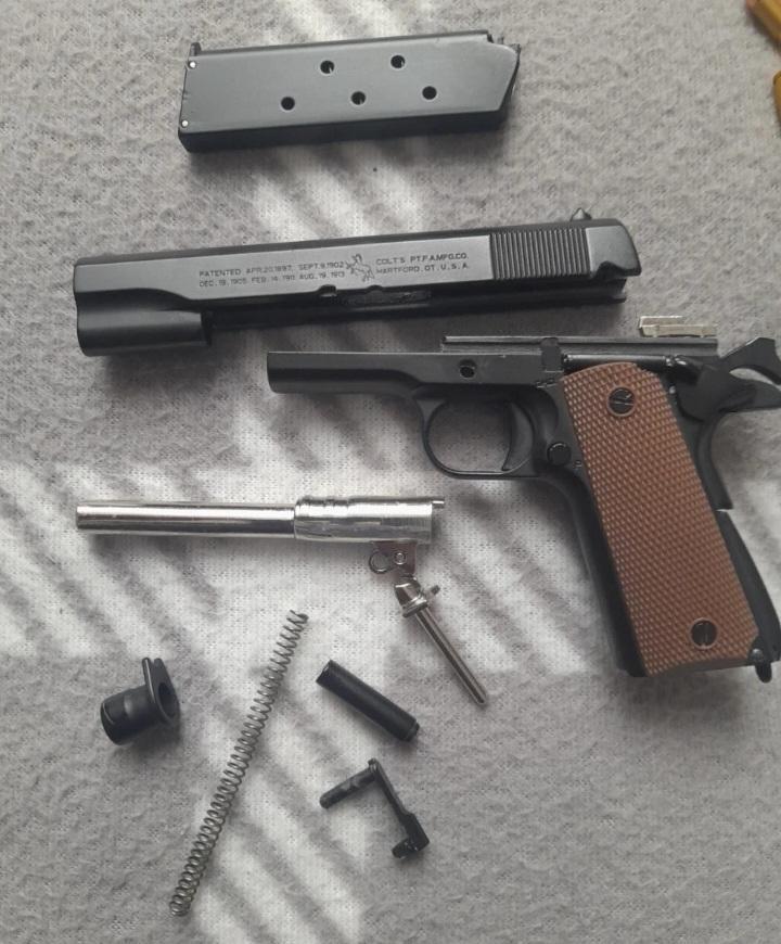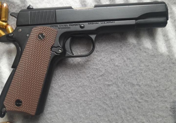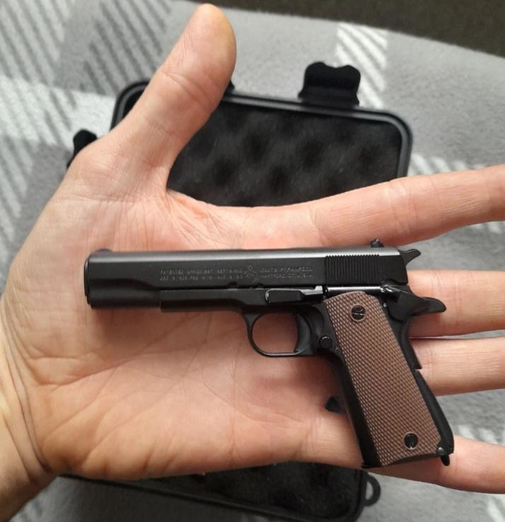 1:2.05 scale, approx 100mm long model of the m1911 pistol. This is a lovely piece. It is made of all metal and can be cocked, pull trigger and remove mag and bullet. Aswell as can be completely stripped. It does have shell ejection. Comes with 4 brass and copper shells.