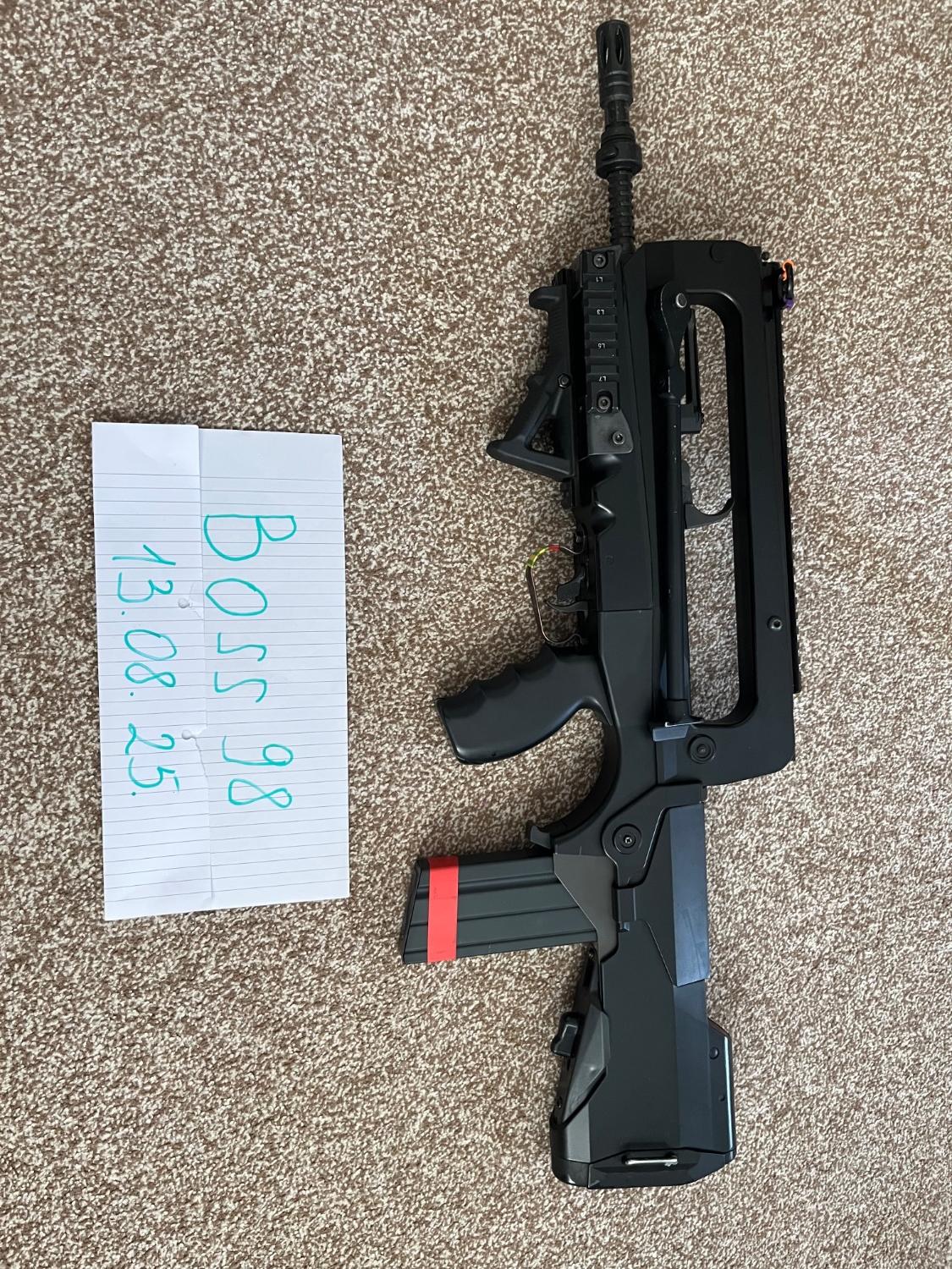 Beautiful and well loved TM Famas with RealSteel upper rail, 6 mid caps and 4 hi caps. Also included is the impossible to find railed handguard(as well as the original), an extra pistol grip and spring guide. Wired to deans. Doesnt come in orignal box im afraid but will be well packed if shipped. Upgrades are extensive including: