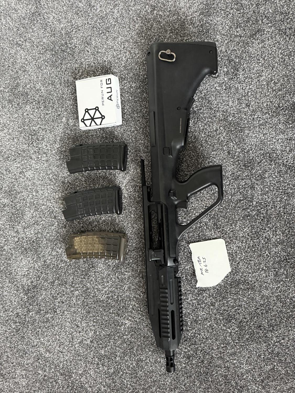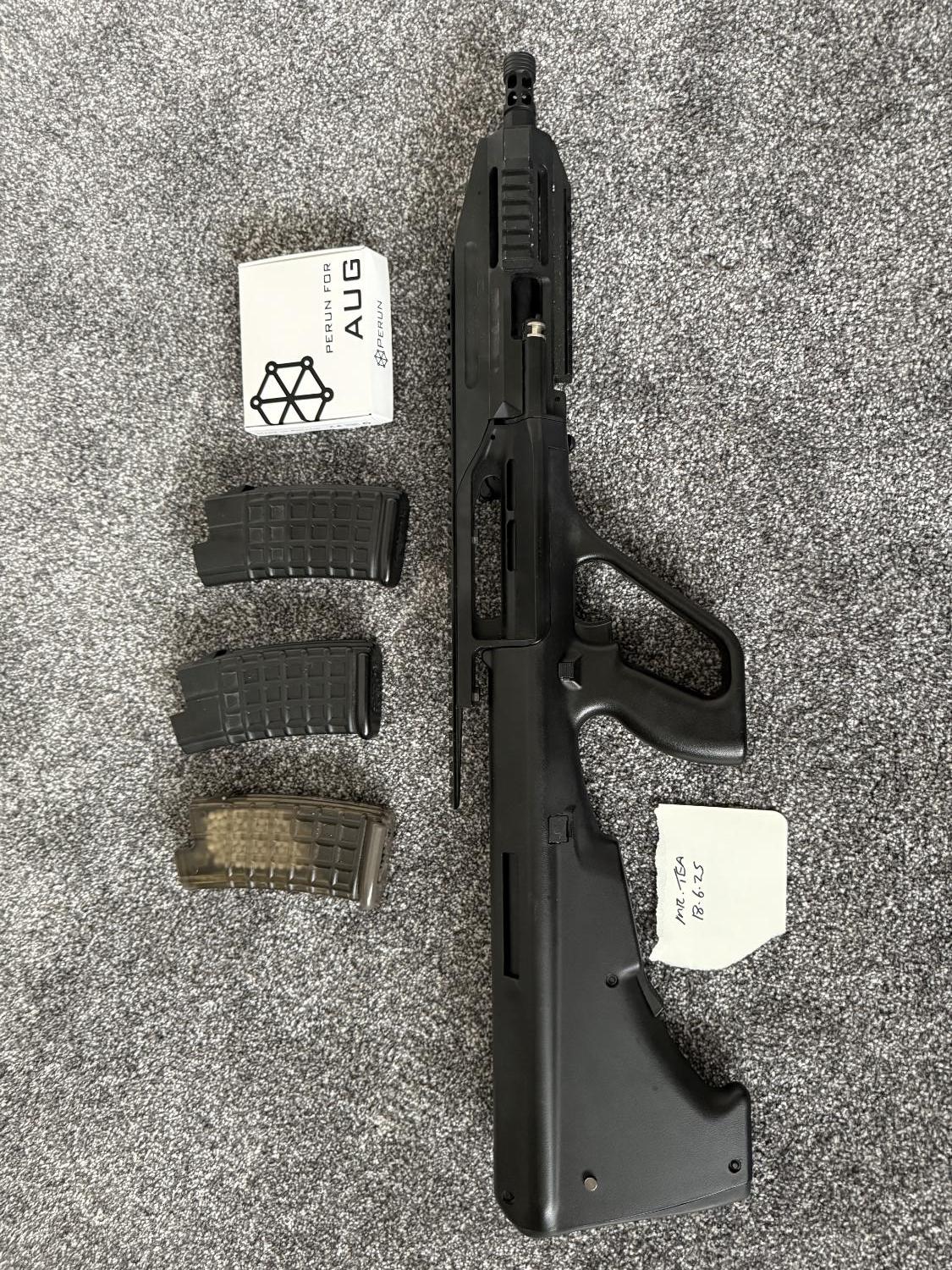 Selling my JG AUG (AU-3G) which has been upgraded with a Perun AUG MOSFET - this means the rifle maintains it's 'two-stage' trigger without the sloppy feel of having a trigger bar pushing into contacts on the gearbox. This also means it has excellent trigger response and great ROF, especially on 11.1v. The rifle has sling points integrated into the body however if you want to remove these, there are some washers on the inside of the rifle that you have to pop off then remove the sling point.