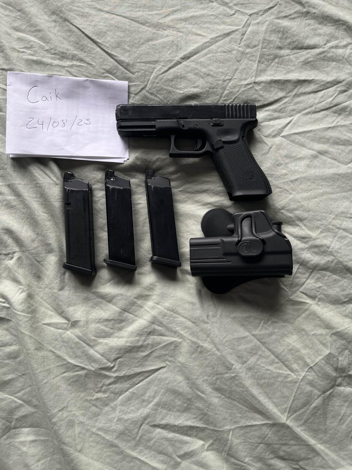 Used WE Gen 5 G17/EU17. Comes with 3 leak free mags (one of which is a TM mag which requires a little bit more force to seat) and a paddle holster.