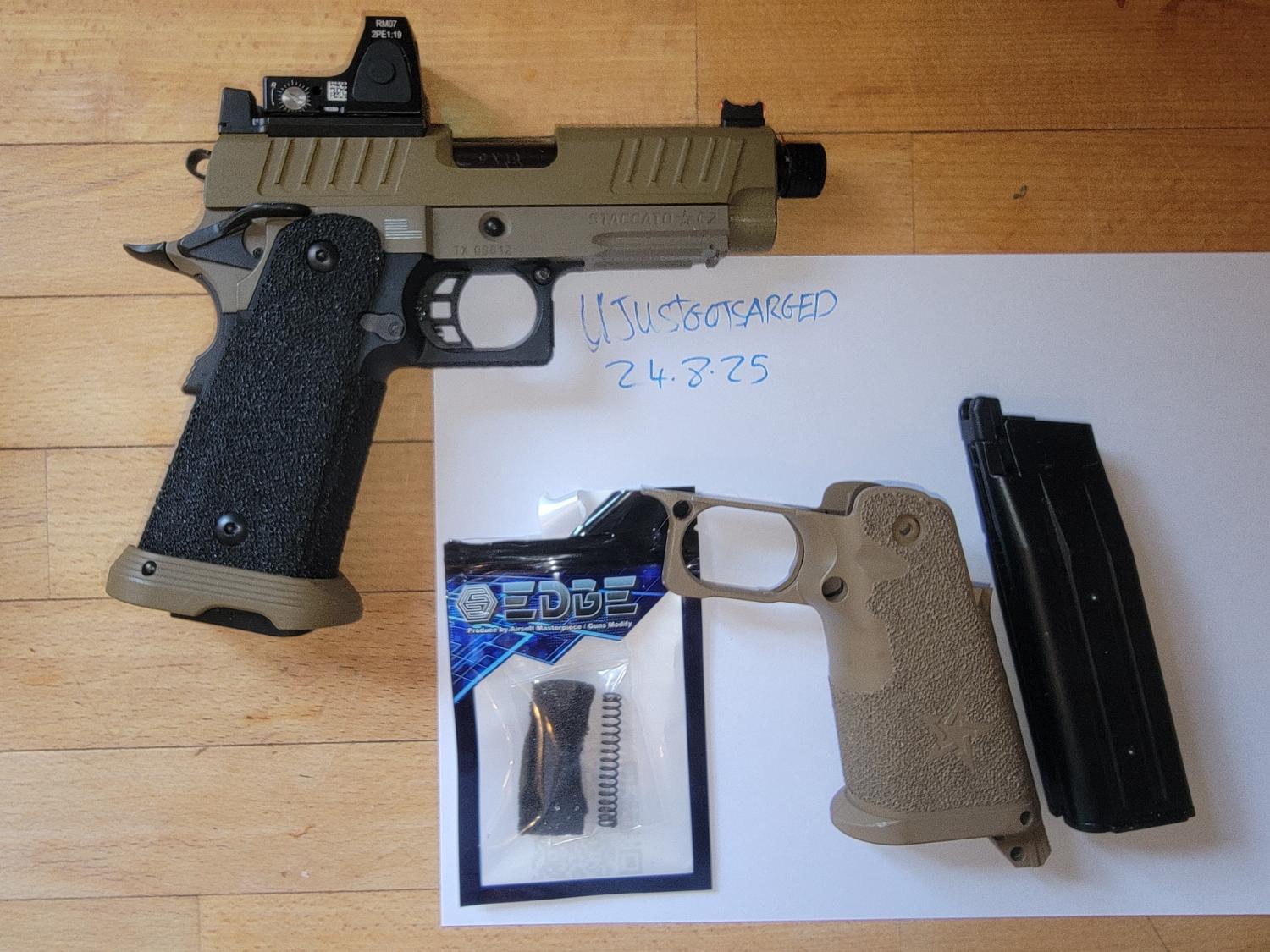 T8 staccato c2, never gamed. Works perfectly, as its t8 version has upgraded internals. Comes with orginal grip and full-size grip as well, 120%hammer spring. Orginal mag and a tm mag, tm mag needs a inlet valve. Clone rmr fully working.only getting rid as picked up a staccato p