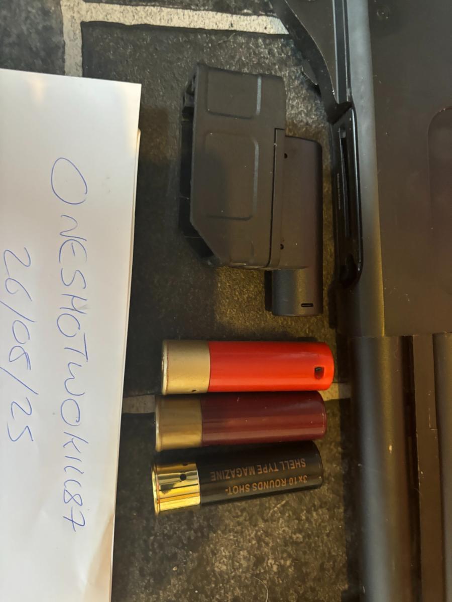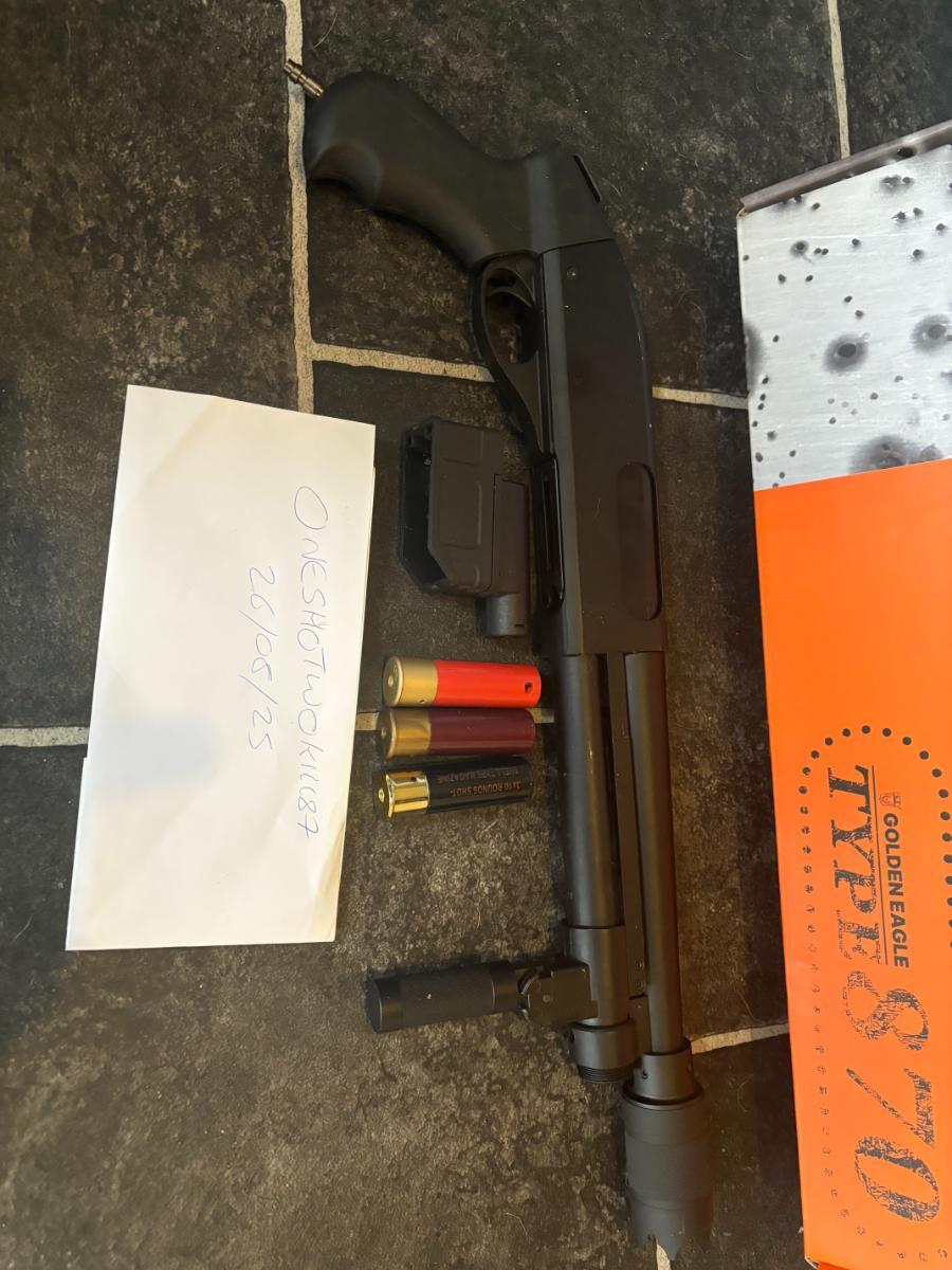 Selling my lightly used Golden Eagle shotgun that has been HPA tapped and includes a Tracer unit, M4 mag adapter, shells, retail box and a sling ( not pictured )