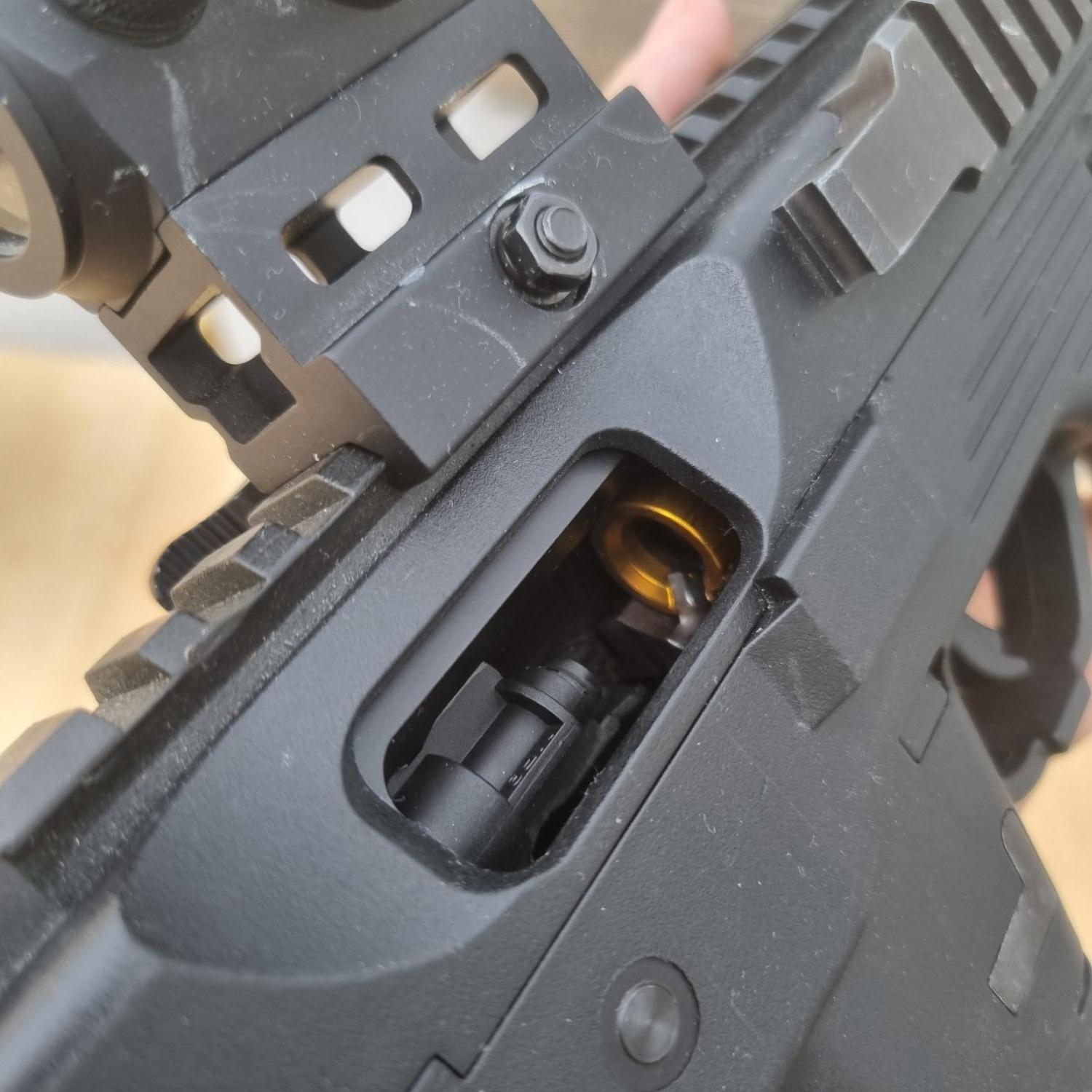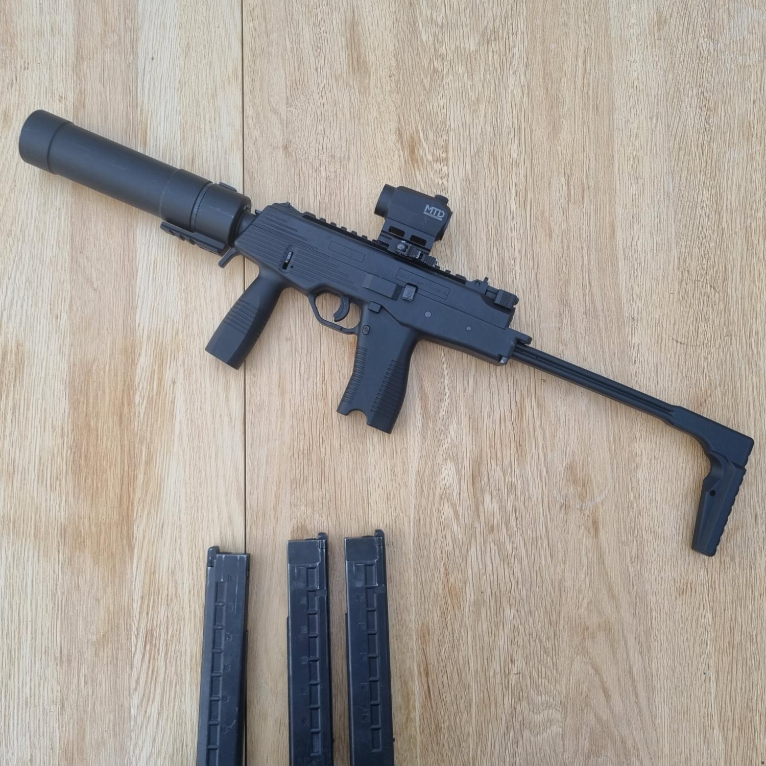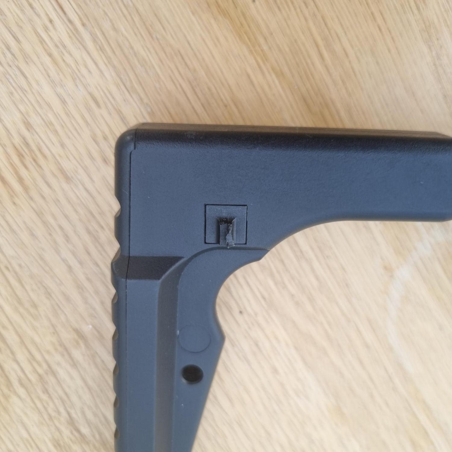 As shown in the last picture, the locking nub on the end of the stock is snapped. This means that the stock will fold but does not latch onto the catch on the gun.