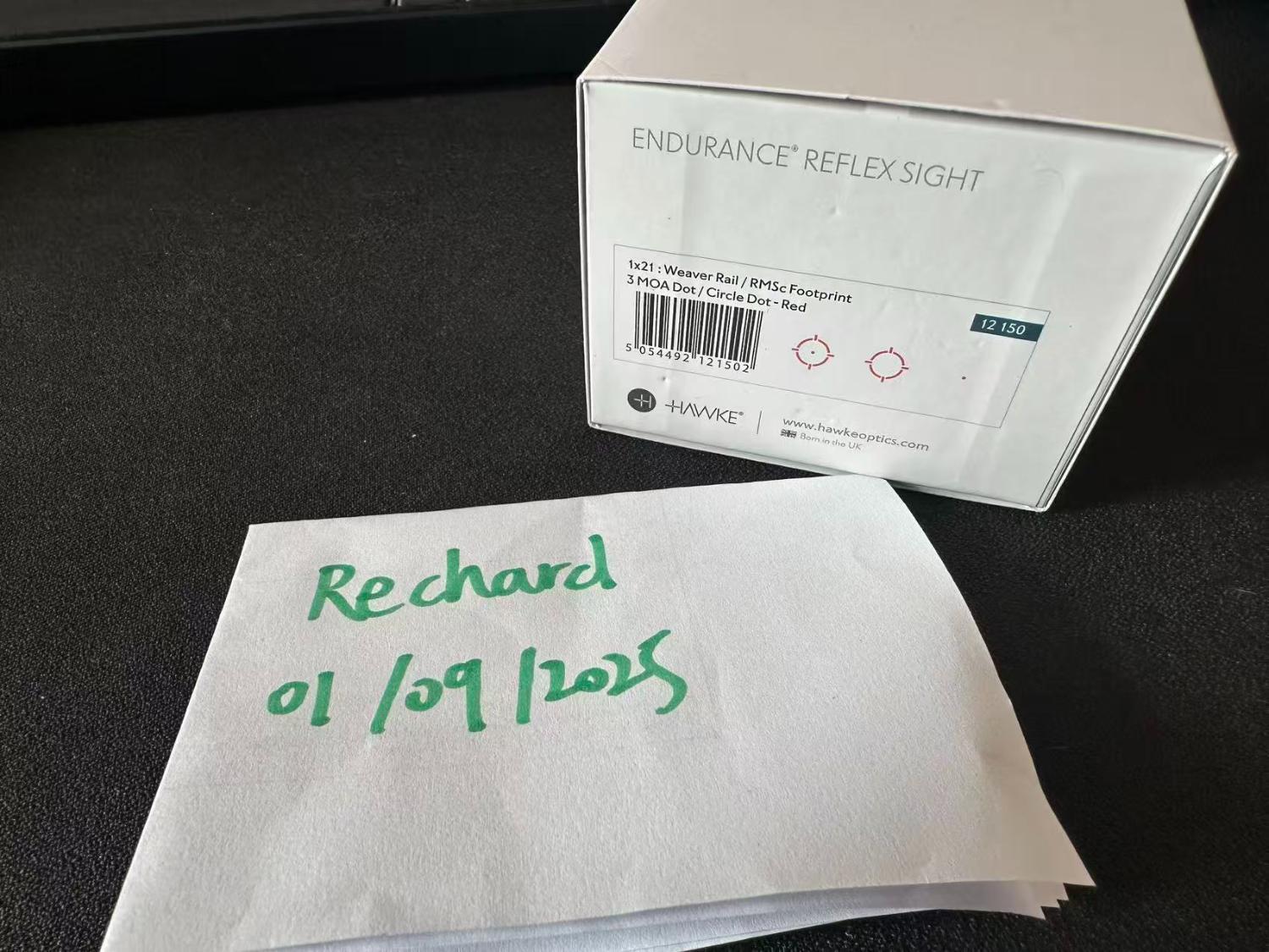 For sale to raise funds: a brand new, unused Hawke Endurance Compact Red Dot Sight. It is the most compact red dot sight I have encountered and features three reticle options. It is also exceptionally lightweight. The crystal-clear lens delivers sharp, distortion-free imaging with no color distortion.